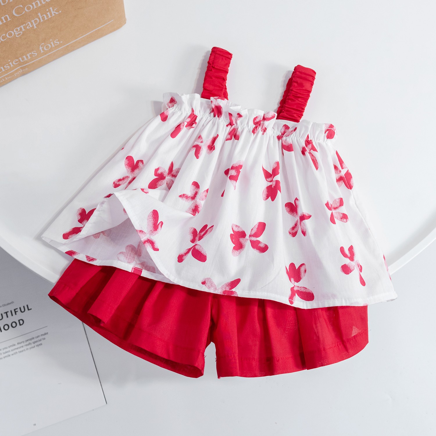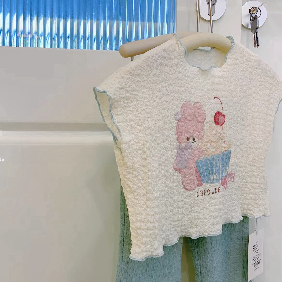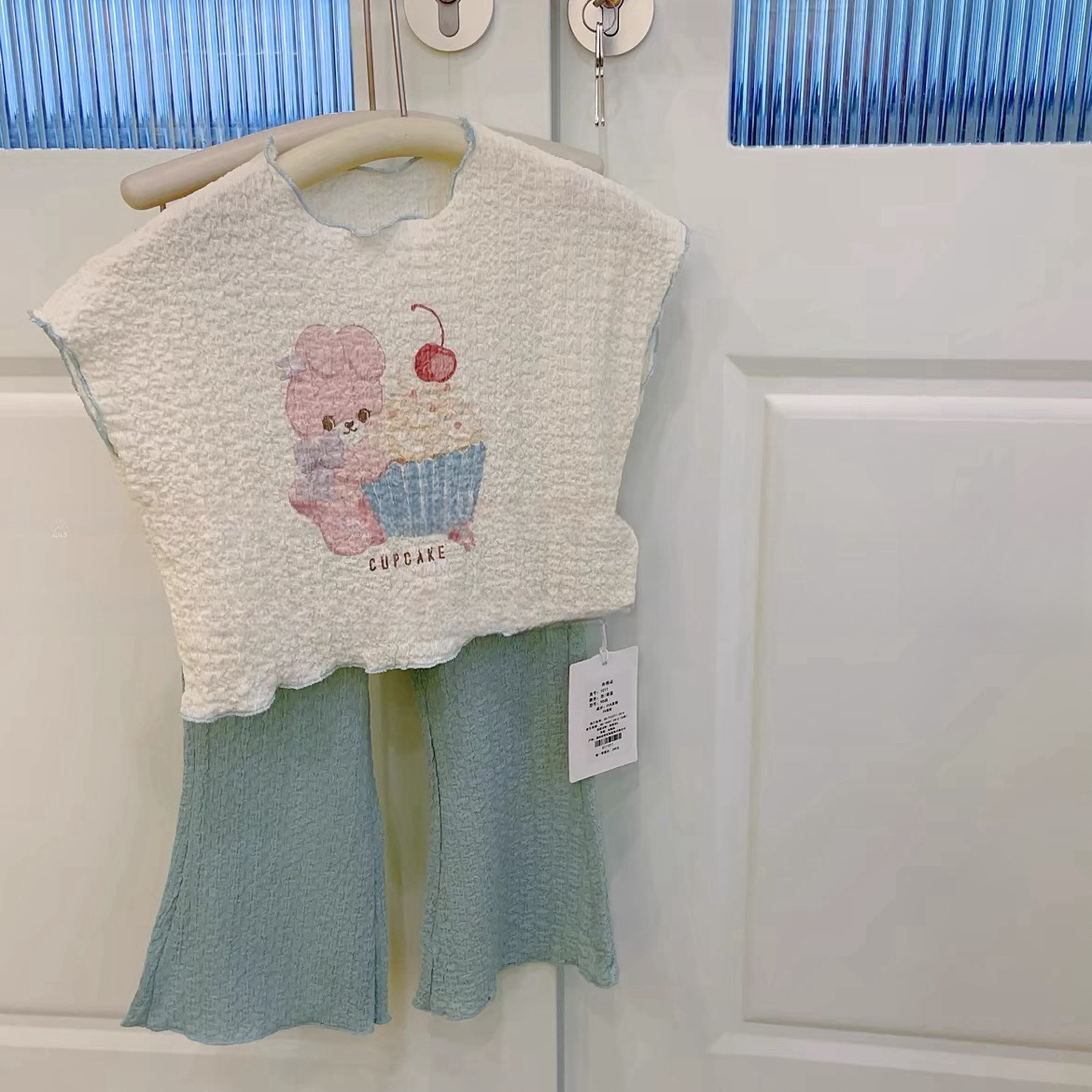 여자 세트 여름 새로운 귀여운 인쇄 반팔 티셔츠 부드러운 퍼프 코튼 플라 바지 2 피스 세트 아기 소녀 용