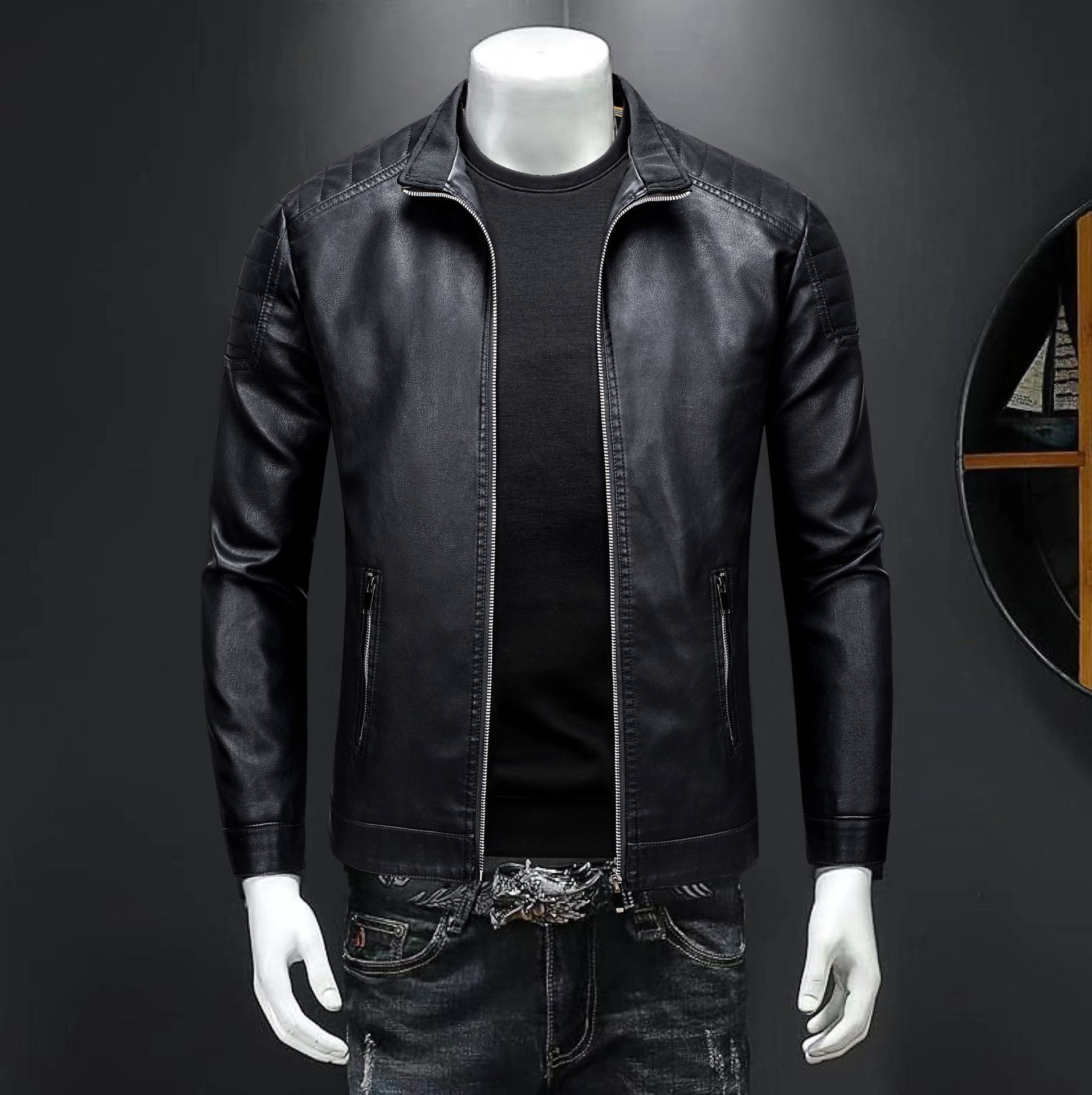 국경 간 아마존 가죽 남성용 슬림 핏 재킷 트렌디 한 얇은 재킷 남성용 바이커 의류 대형 칼라 가죽 자켓