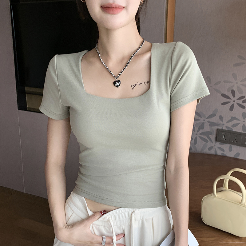 H292 스퀘어 칼라 어깨 반팔 티셔츠 여성용 봄과 여름 새로운 퓨어 스파이스 걸스 슬림핏 화이트 이너 숄더 탑스토어 가기