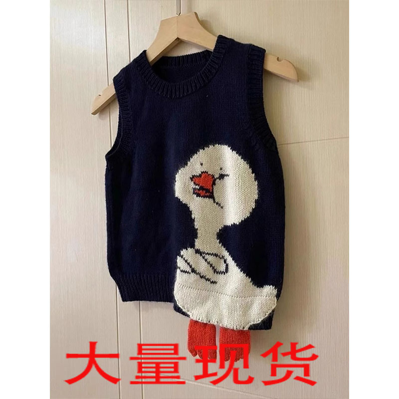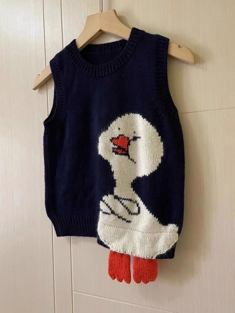 루즈핏 만화 오리 니트 조끼, 틈새 시장 레트로 블랙 스웨터, 여성용 가을 스타일, 다용도 출퇴근용 라운드넥스토어 가기