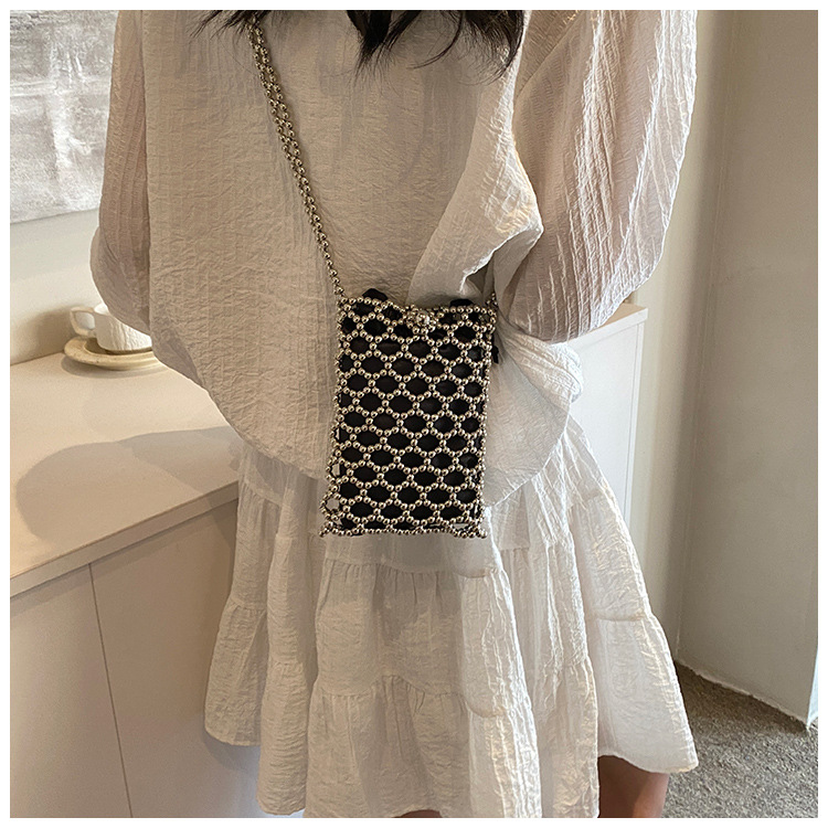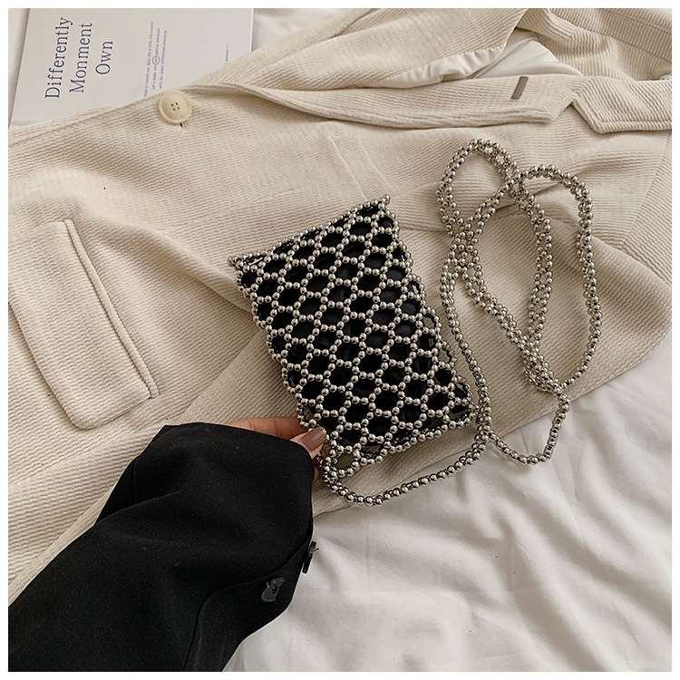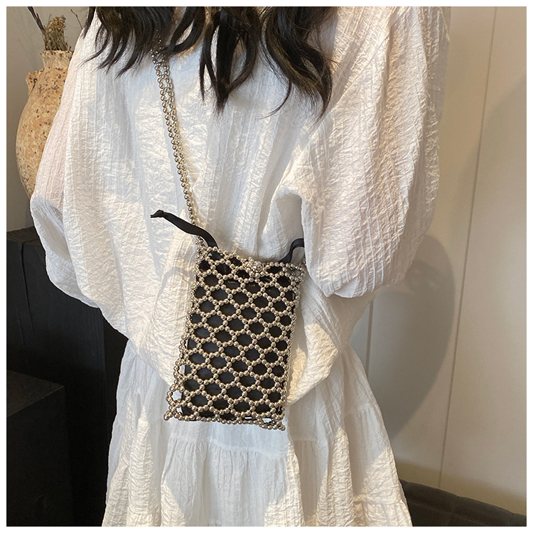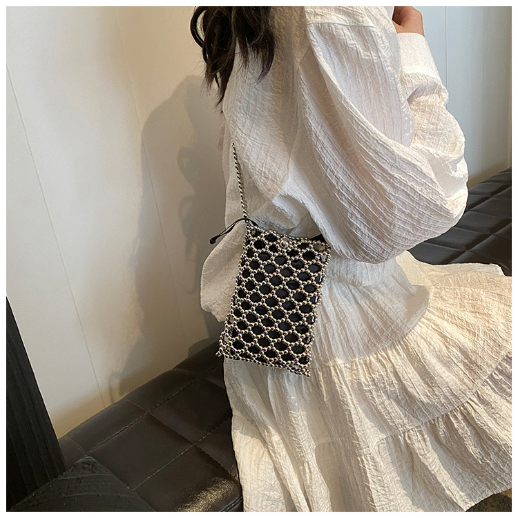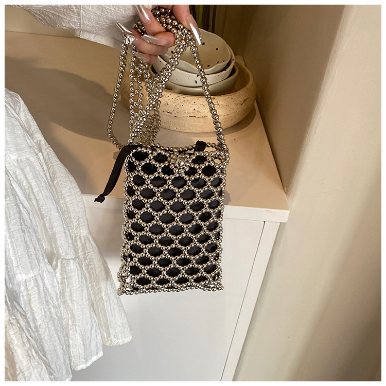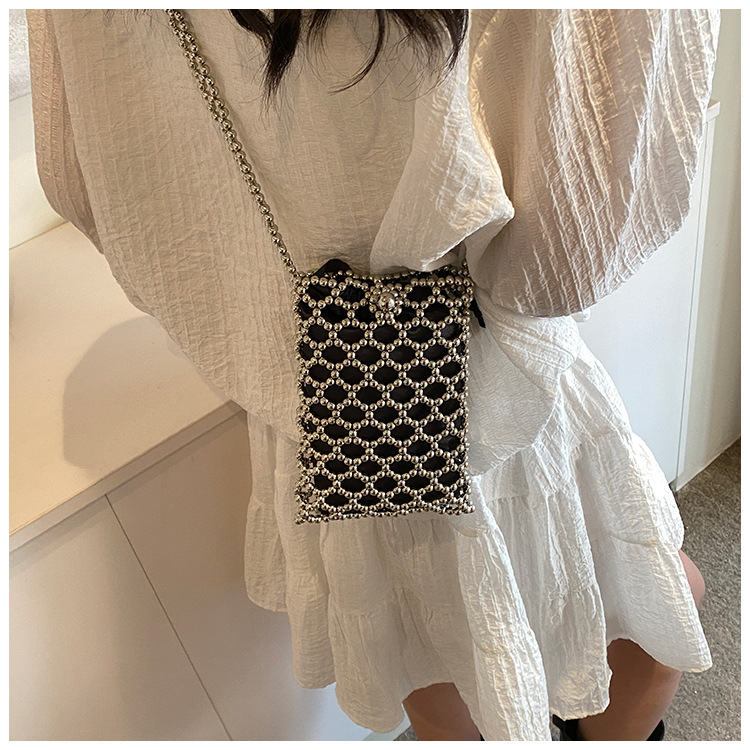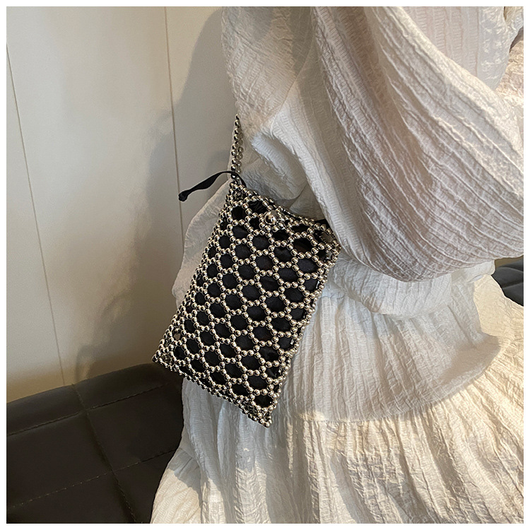 샤오홍슈 레이저 펄 백 2025 신상품 다이아몬드 패턴 핸드폰 가방 소녀스러운 비즈 여성 가방 수제 비치백