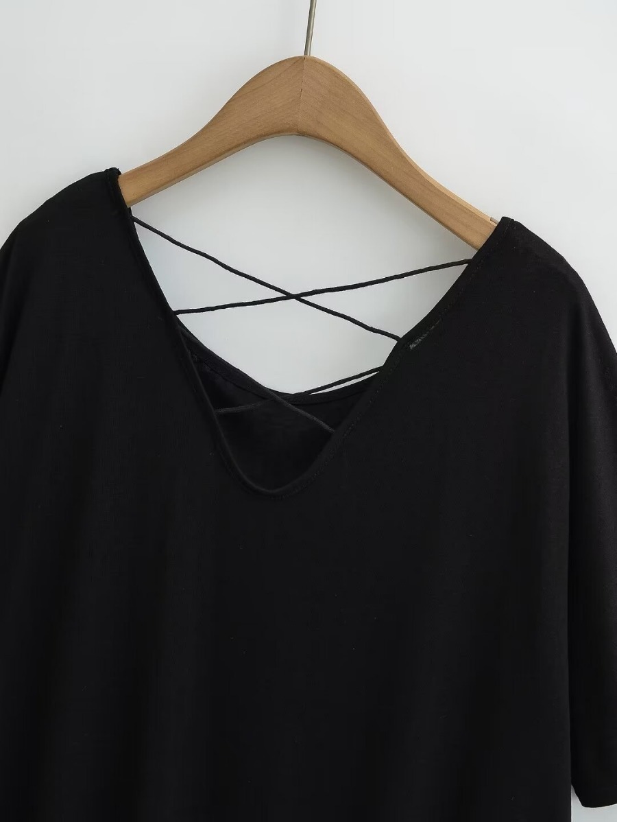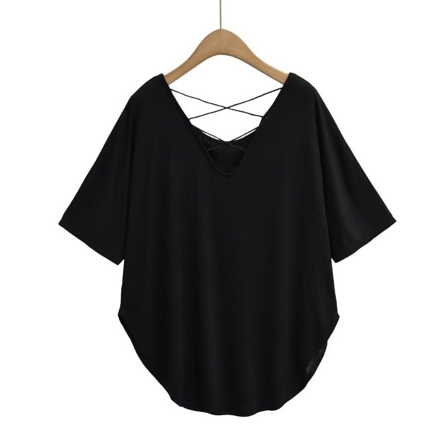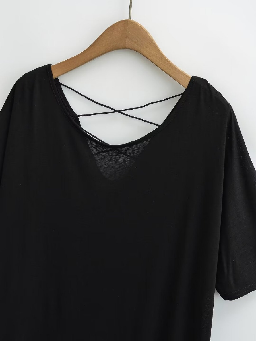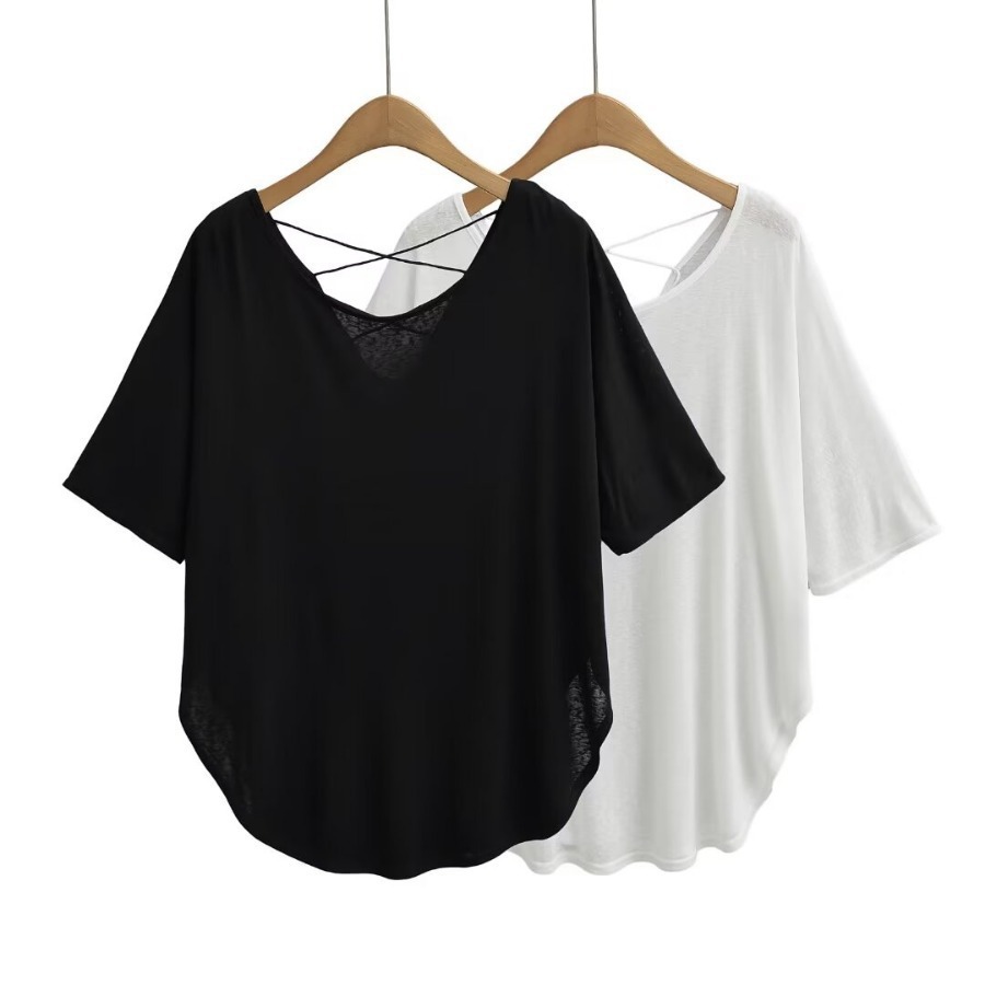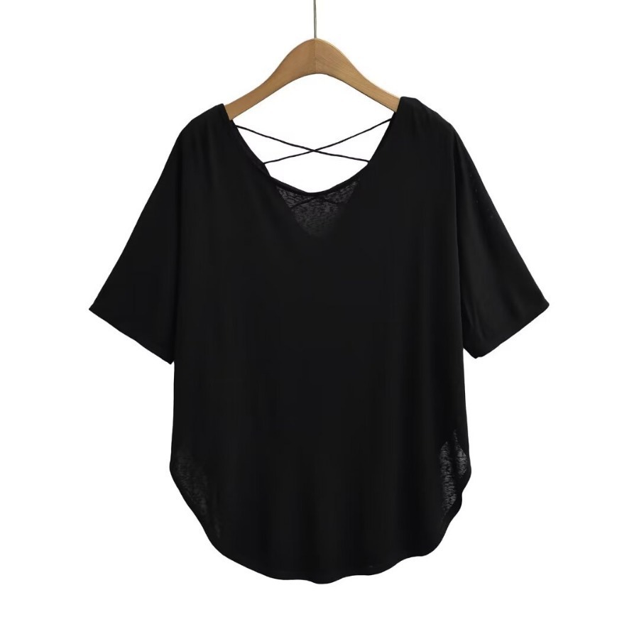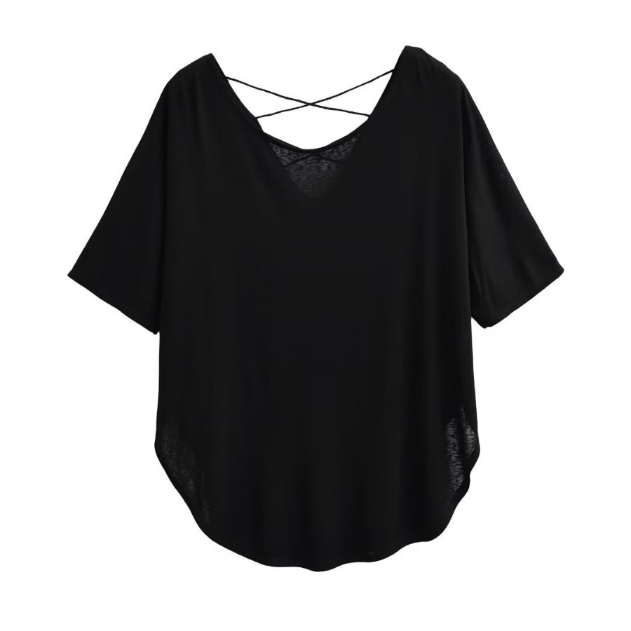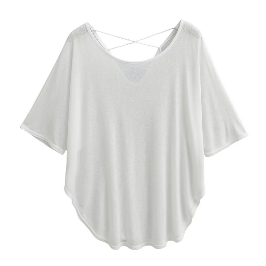 유럽과 미국 스타일의 백 크로스 로프 루즈 커브 헴 게으른 반팔 티셔츠 여성의 2024 여름 새로운 탑