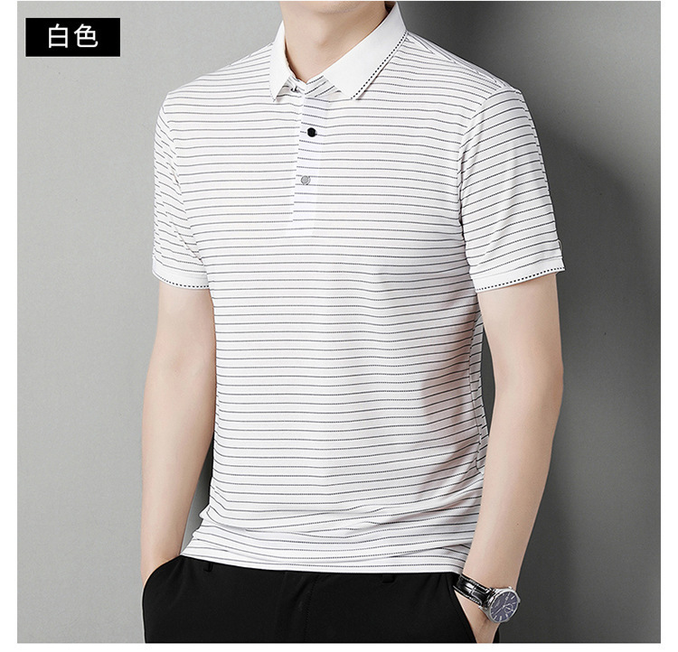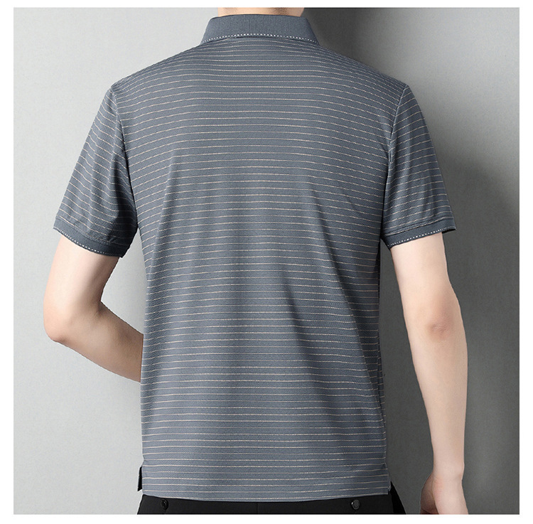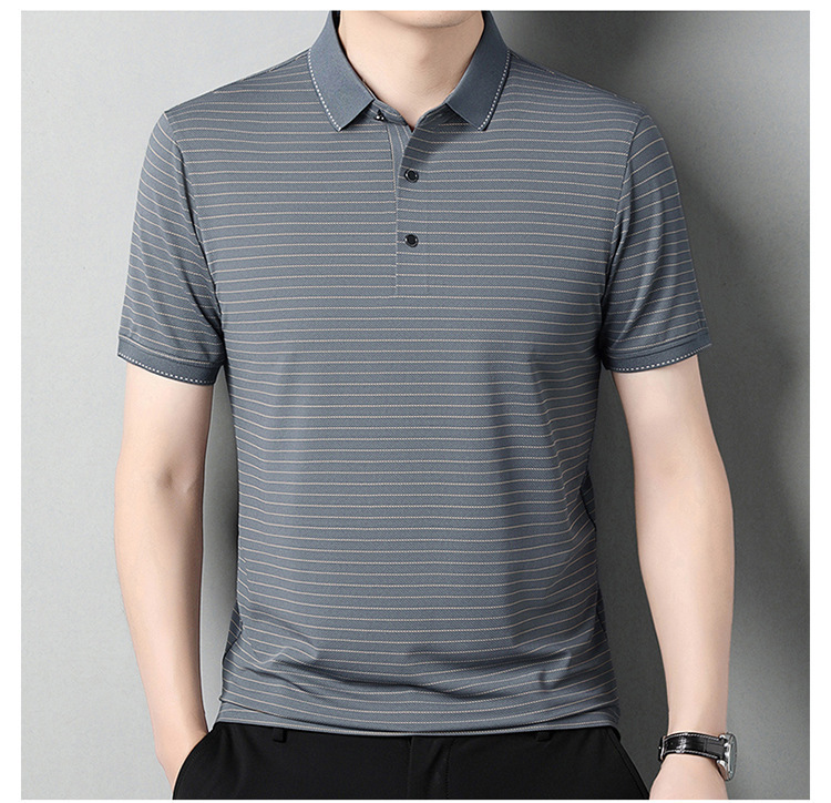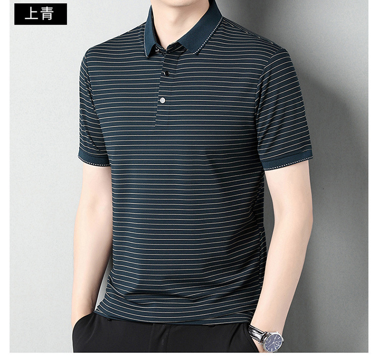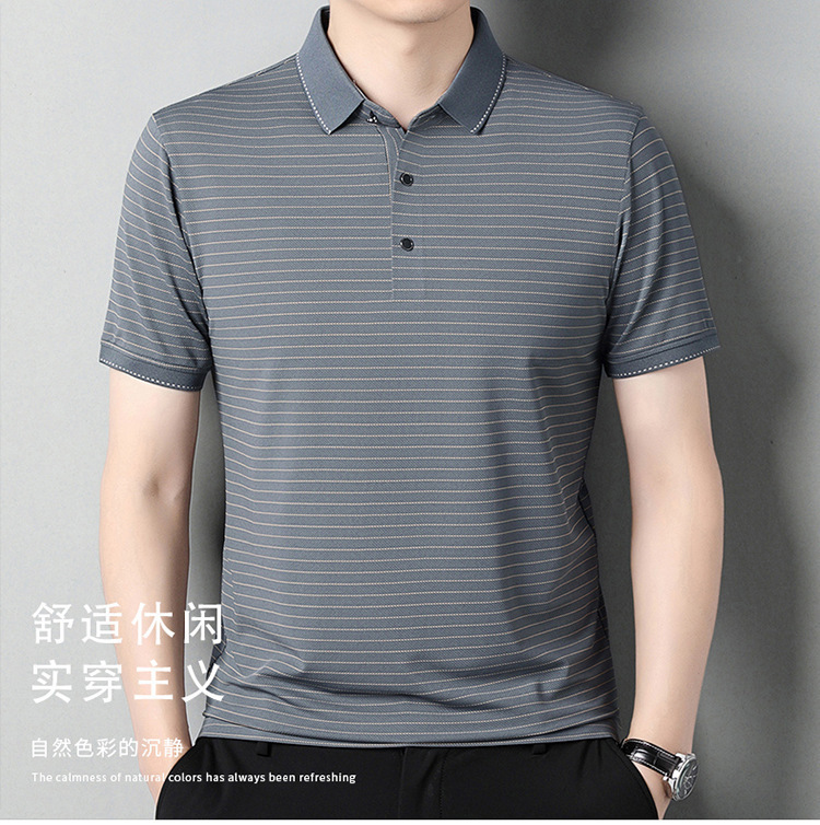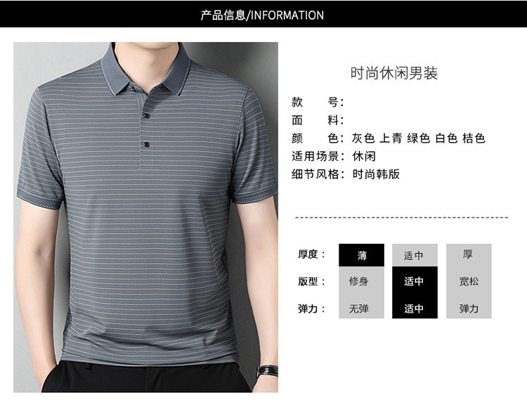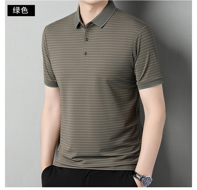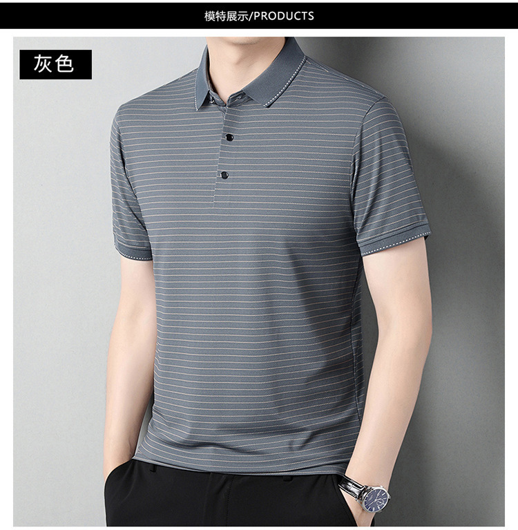 中年男士无痕翻领短袖T恤 横条纹免烫休闲半袖时尚冰爽夏装新款潮
