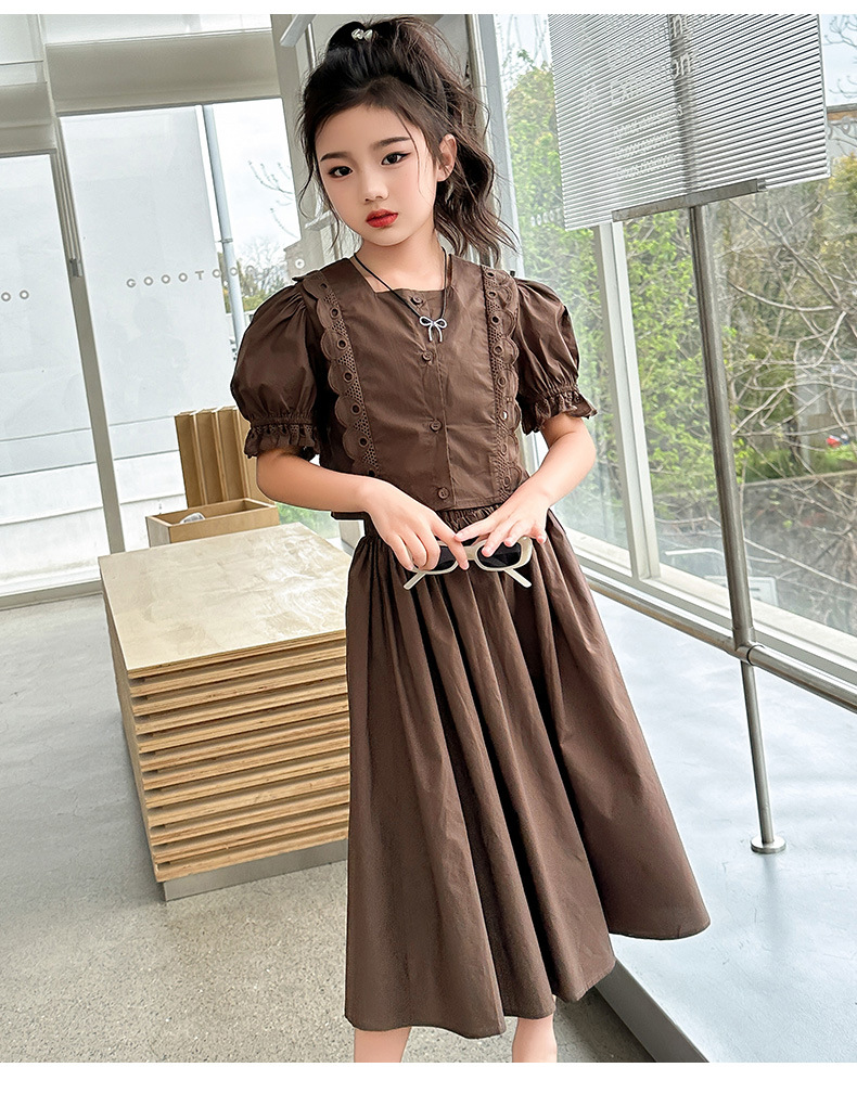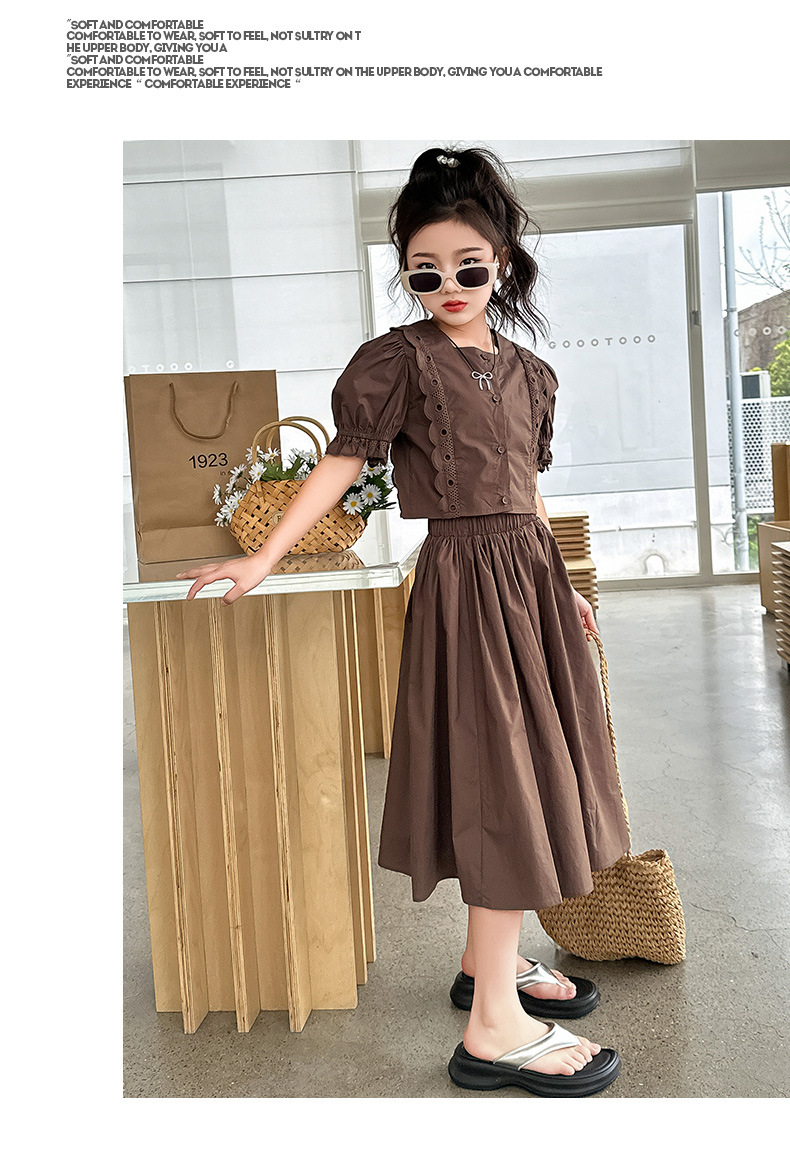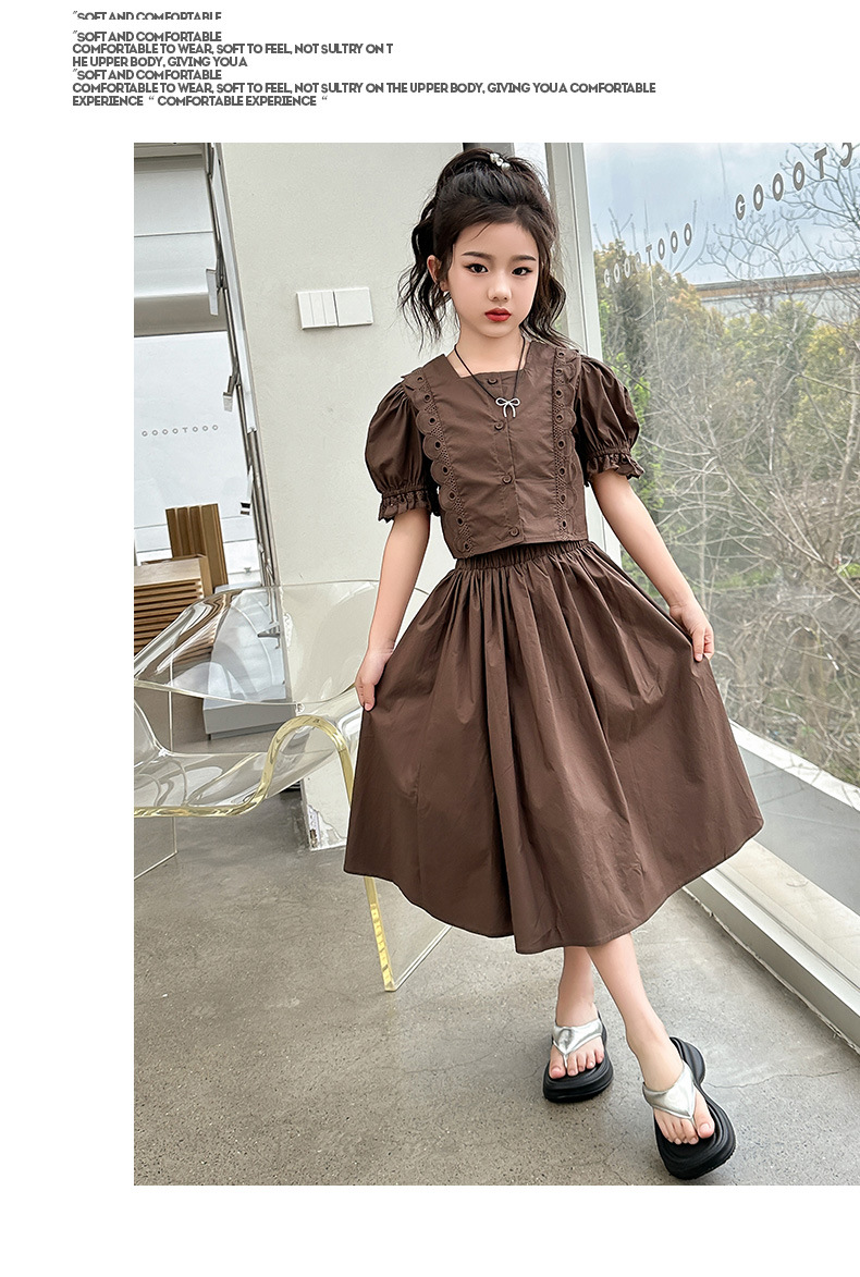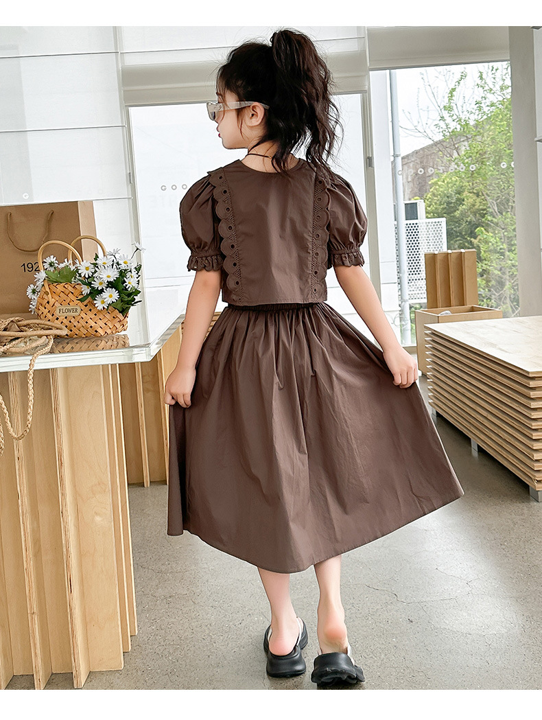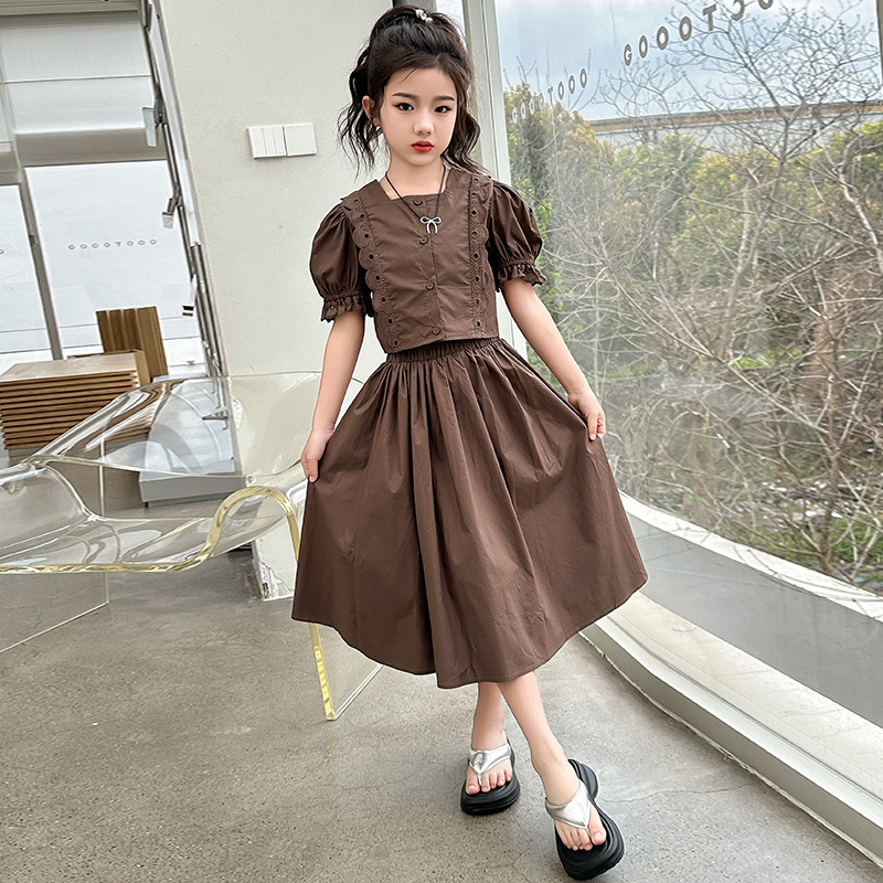 소녀 롱 스커트 세트 여름 하이 엔드 퍼프 슬리브 스커트 2024 새로운 스타일 원피스 오버 더 무릎 미드 빅 어린이 여름 원피스