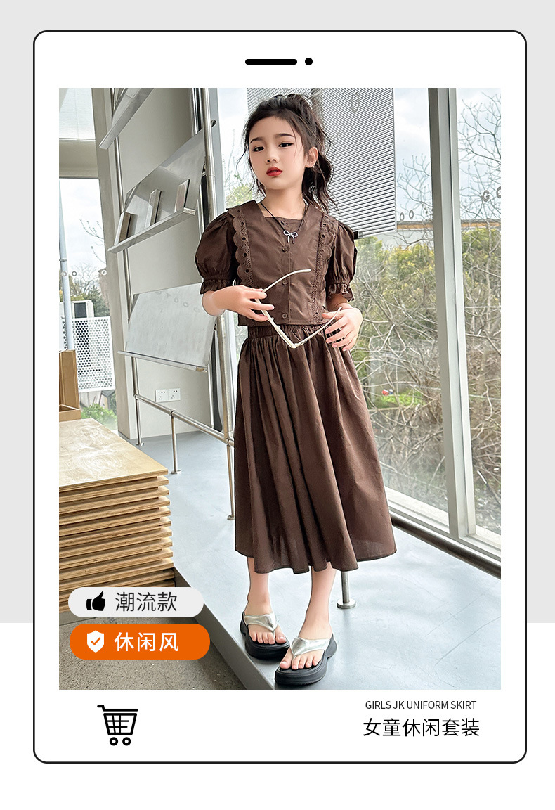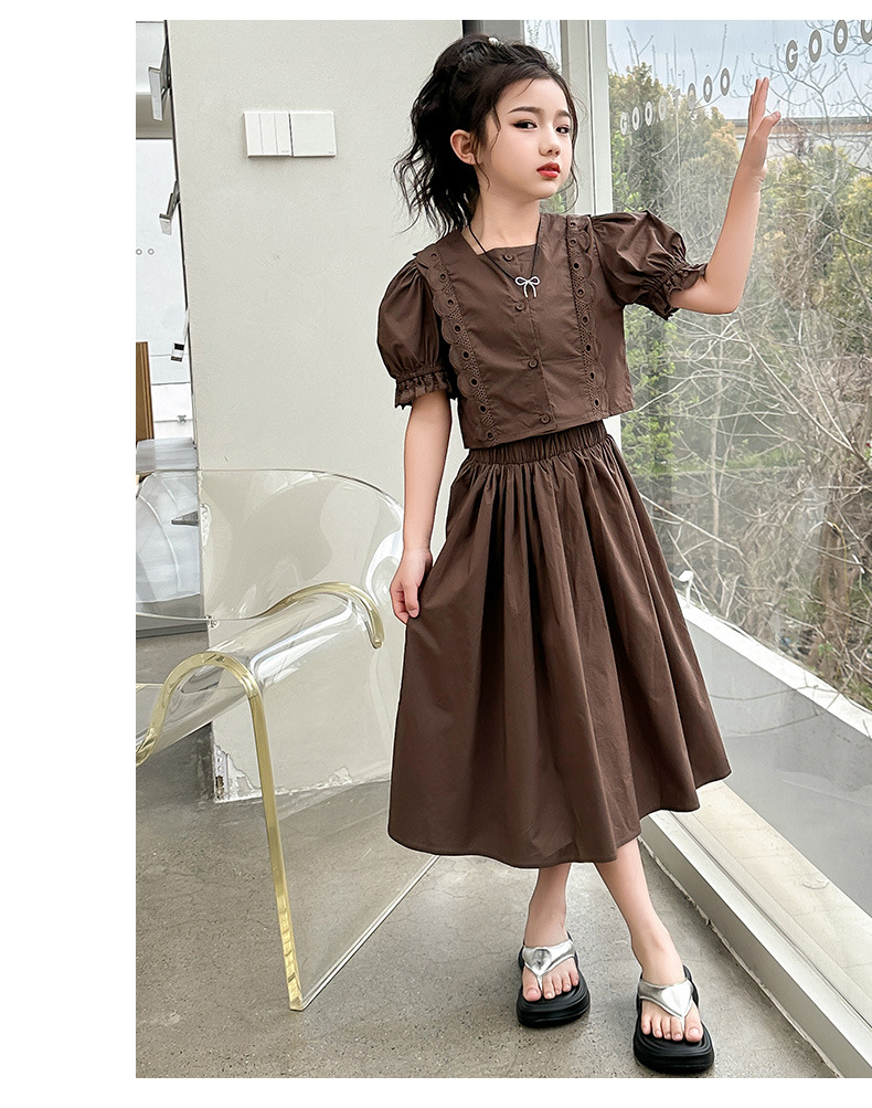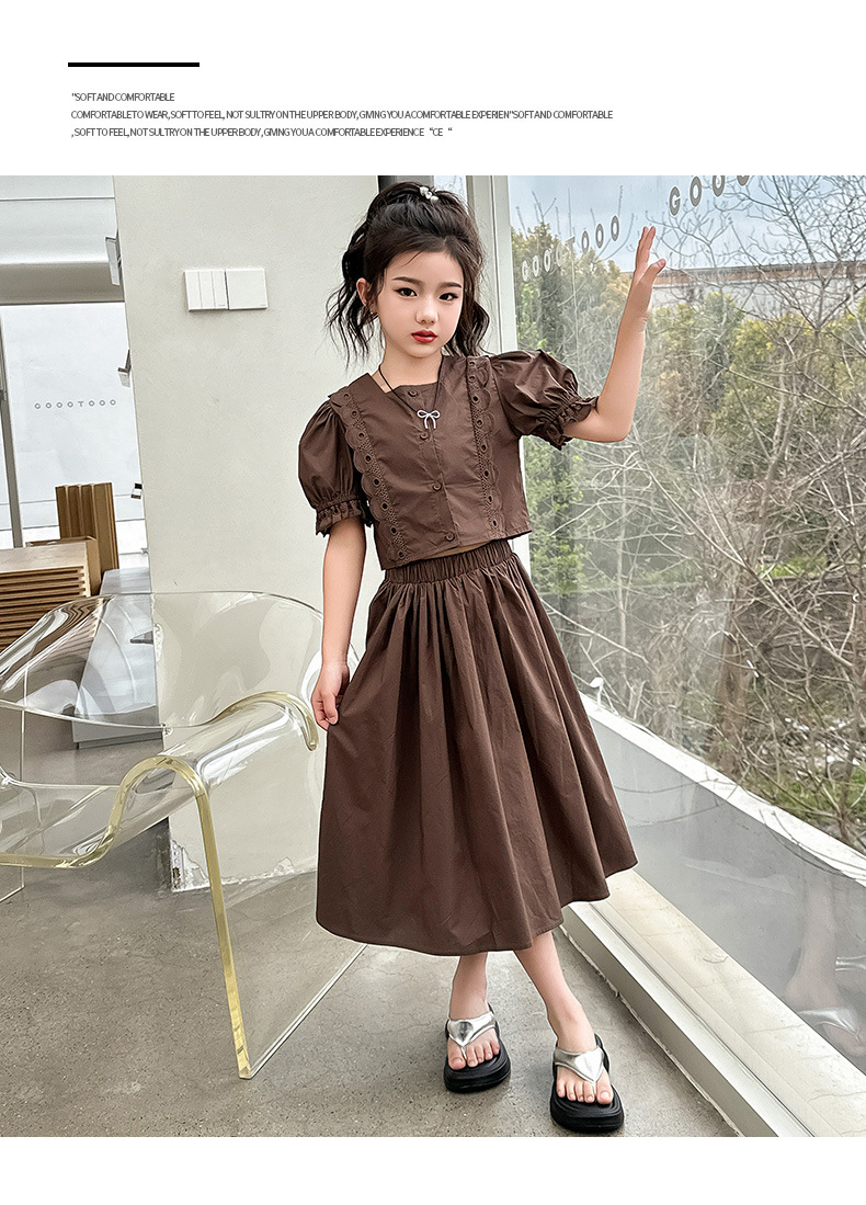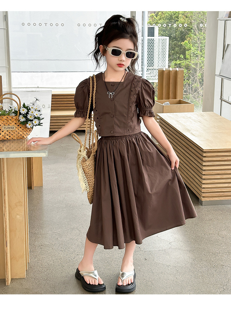 소녀 롱 스커트 세트 여름 하이 엔드 퍼프 슬리브 스커트 2024 새로운 스타일 원피스 오버 더 무릎 미드 빅 어린이 여름 원피스