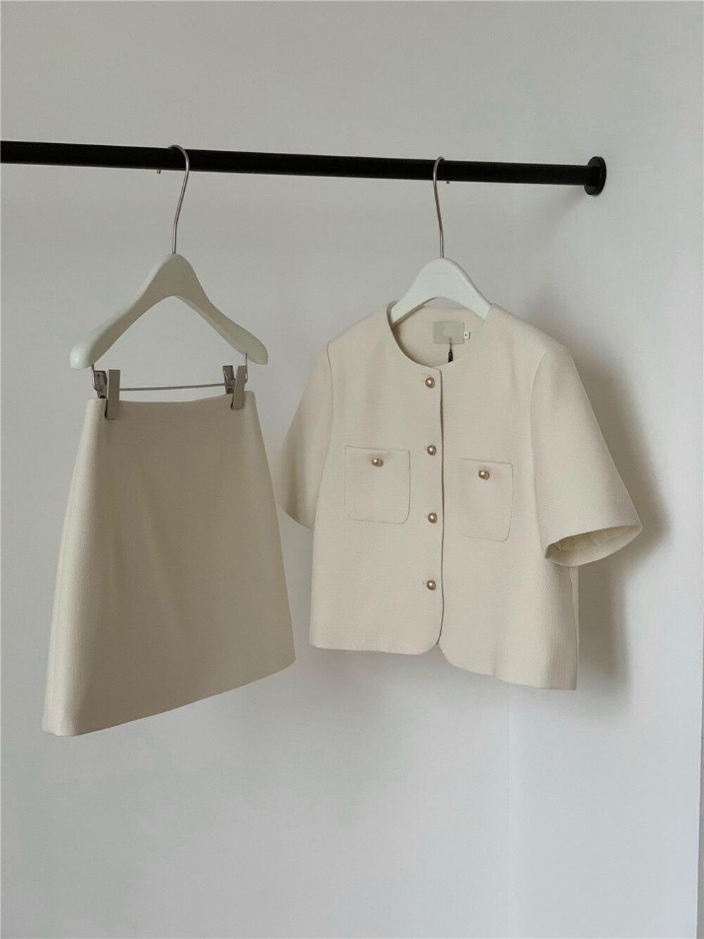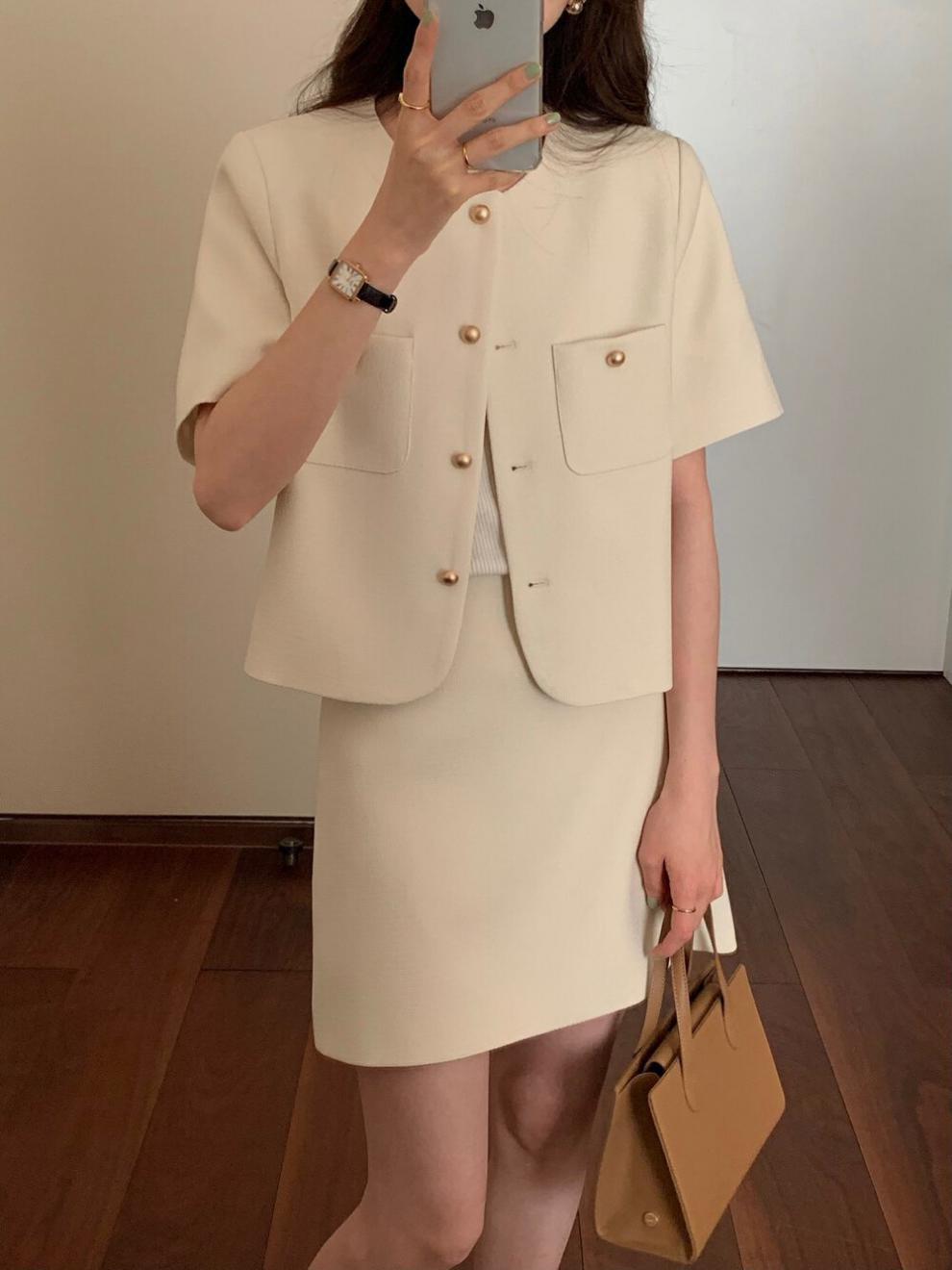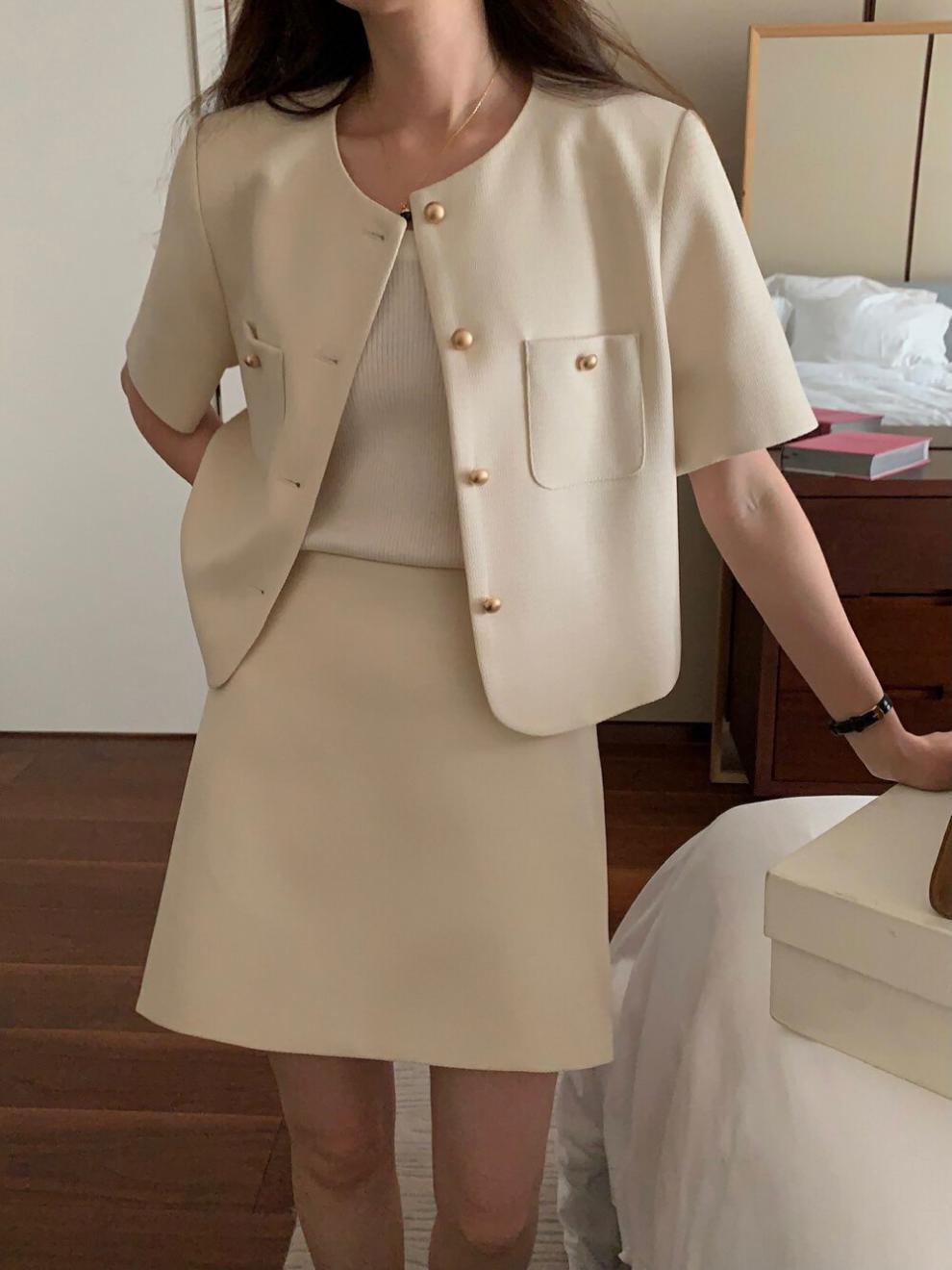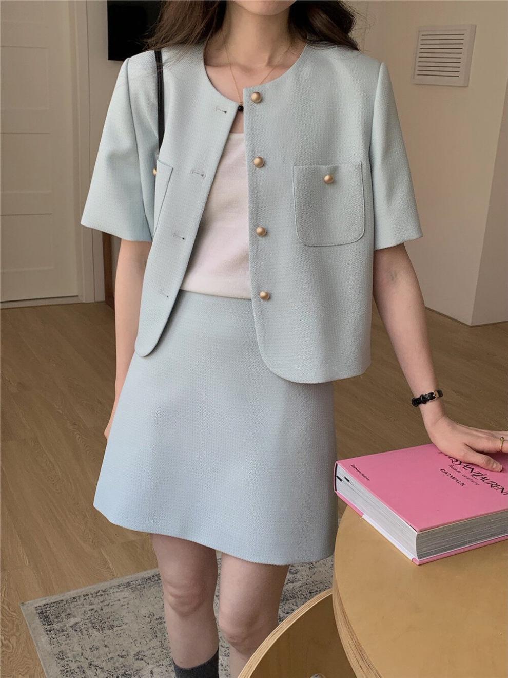 2025년 여름 신상품, 작은 사이즈를 위한 향기로운 스타일의 반팔 정장 재킷, 작은 사이즈를 위한 라운드 넥 정장과 짧은 스커트 투피스 세트스토어 가기