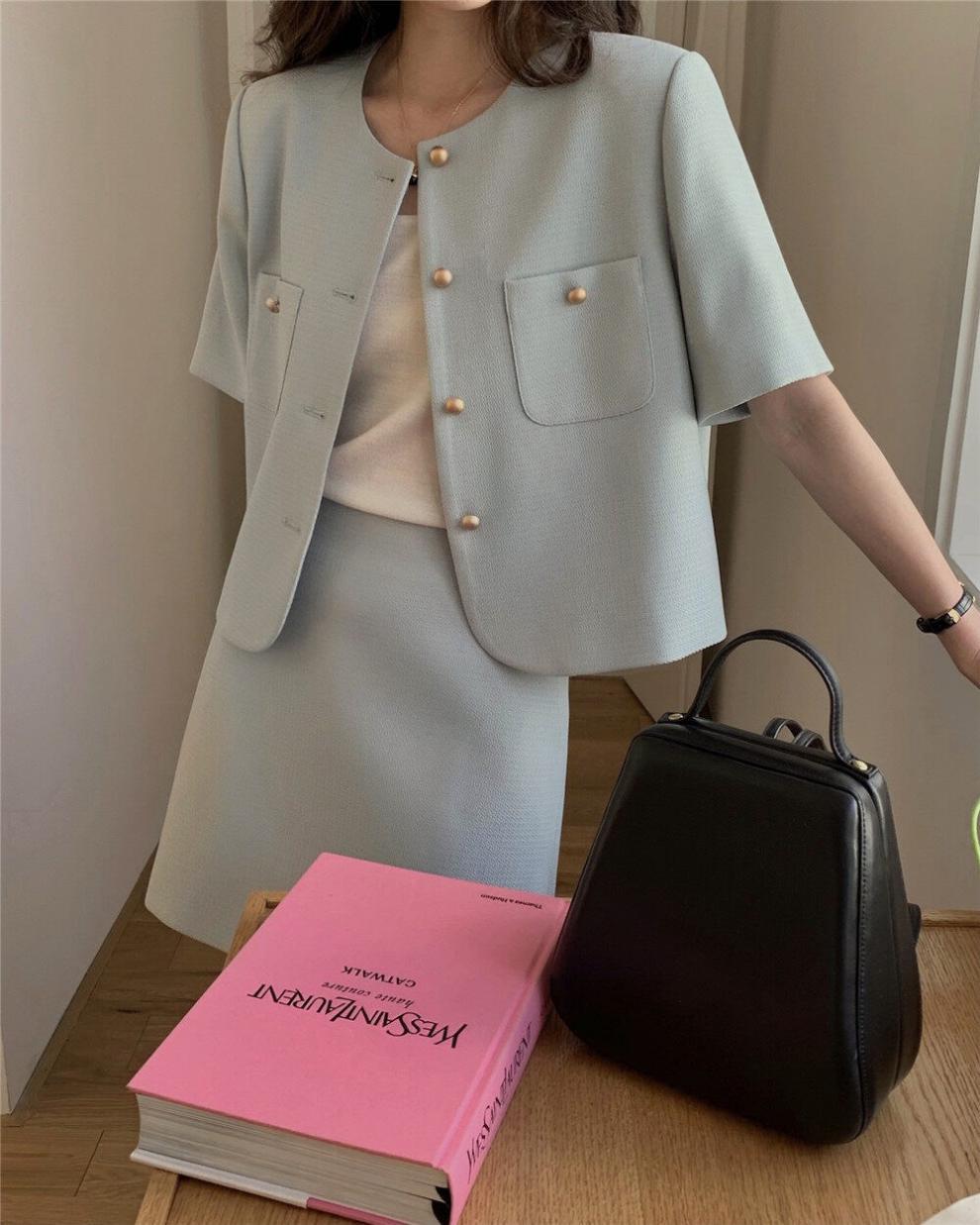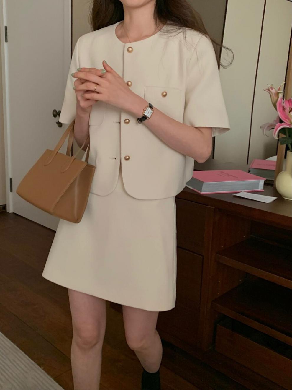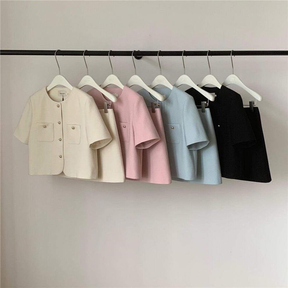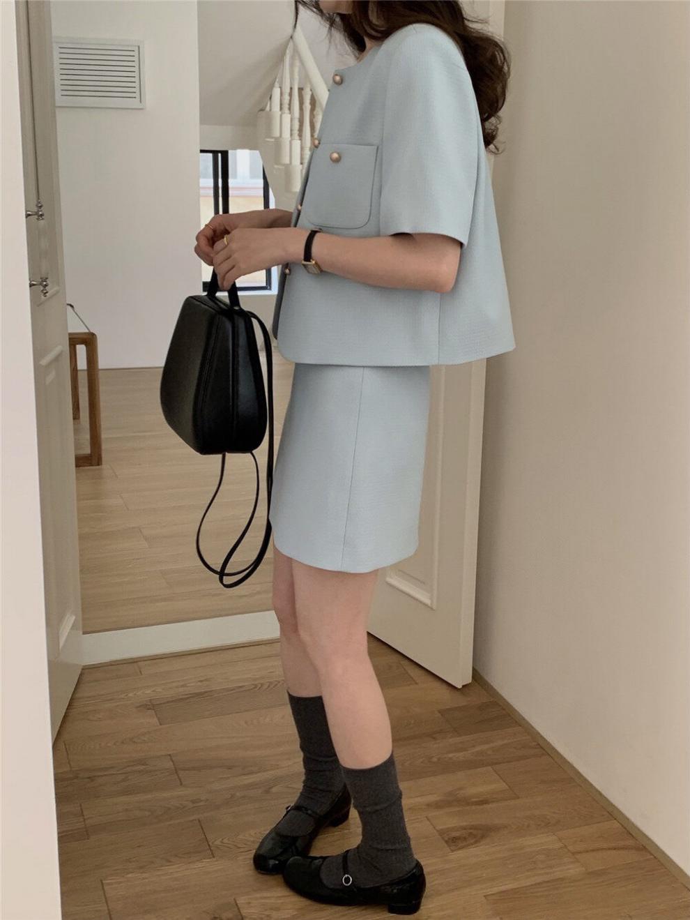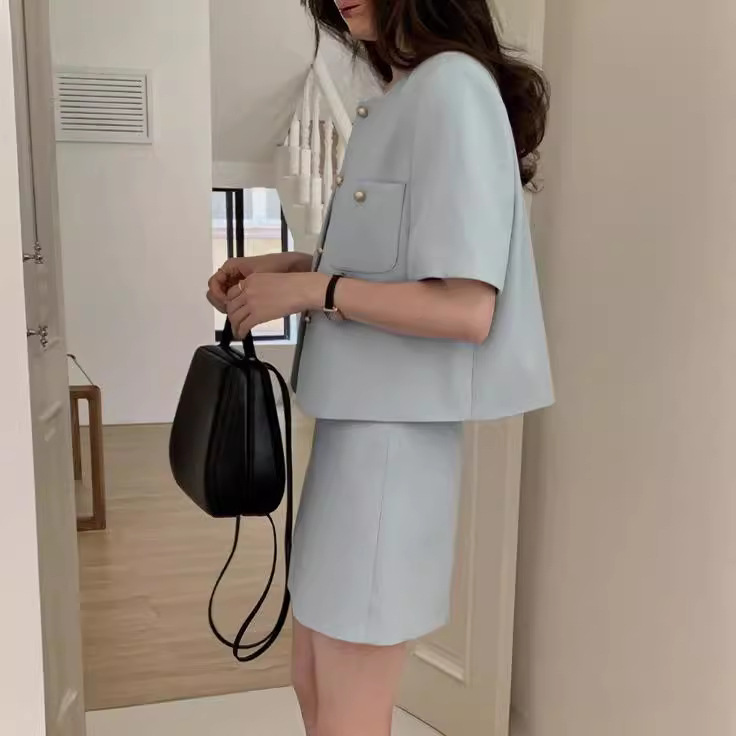2025년 여름 신상품, 작은 사이즈를 위한 향기로운 스타일의 반팔 정장 재킷, 작은 사이즈를 위한 라운드 넥 정장과 짧은 스커트 투피스 세트스토어 가기
