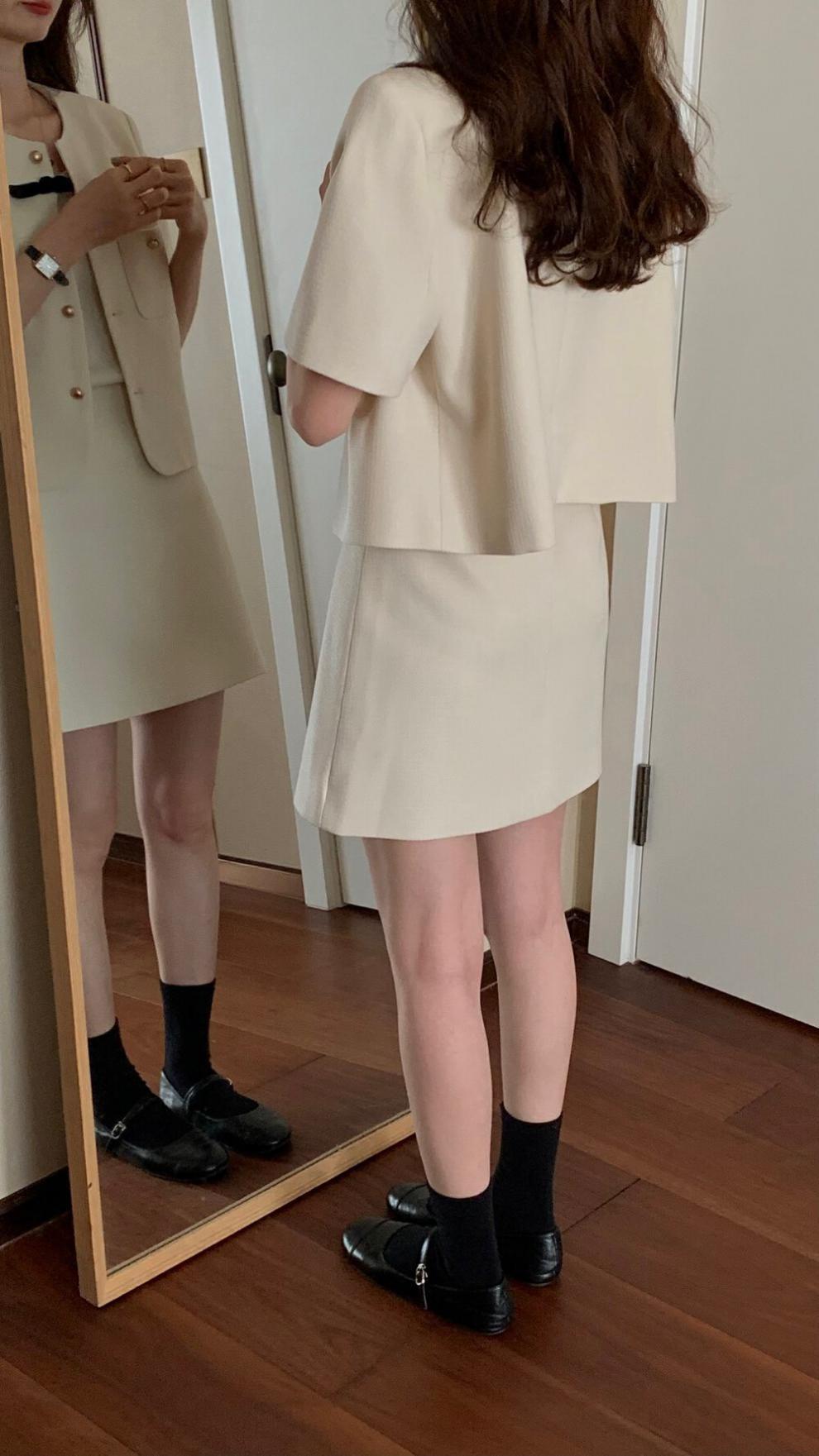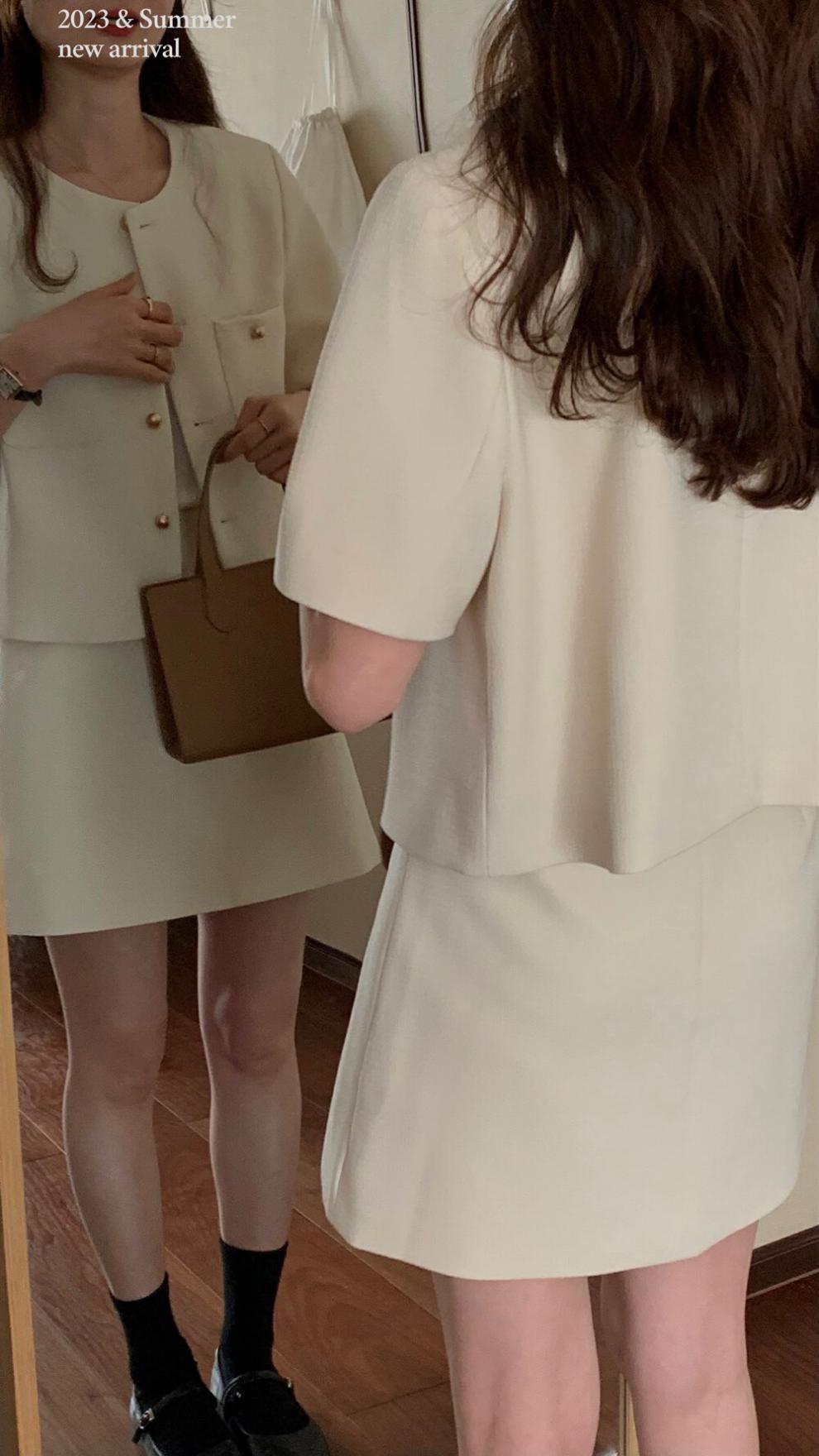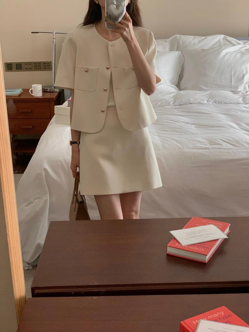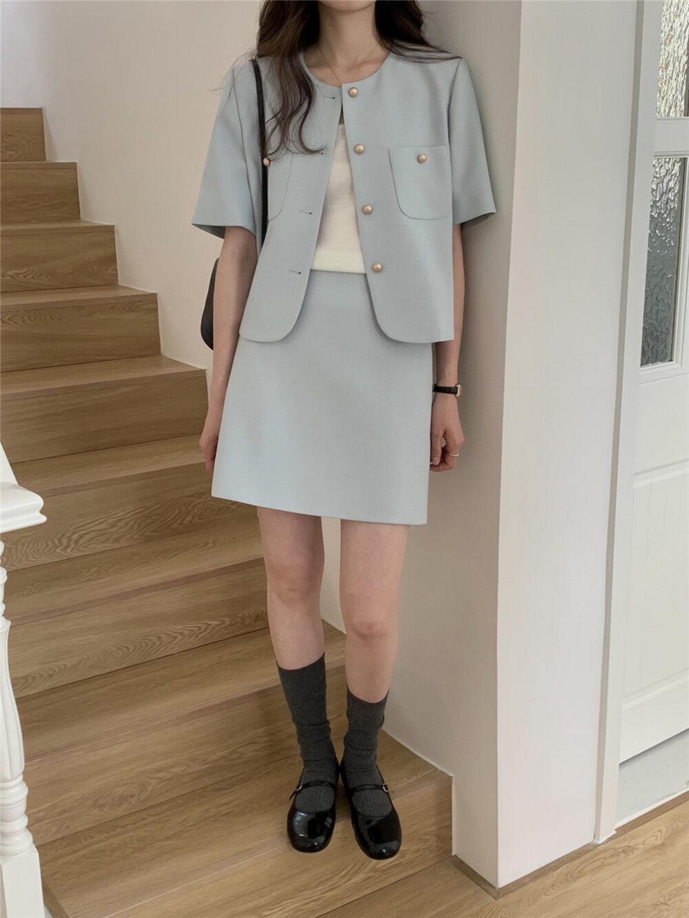 2025년 여름 신상품, 작은 사이즈를 위한 향기로운 스타일의 반팔 정장 재킷, 작은 사이즈를 위한 라운드 넥 정장과 짧은 스커트 투피스 세트스토어 가기