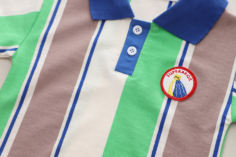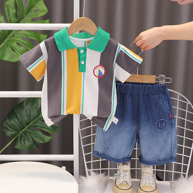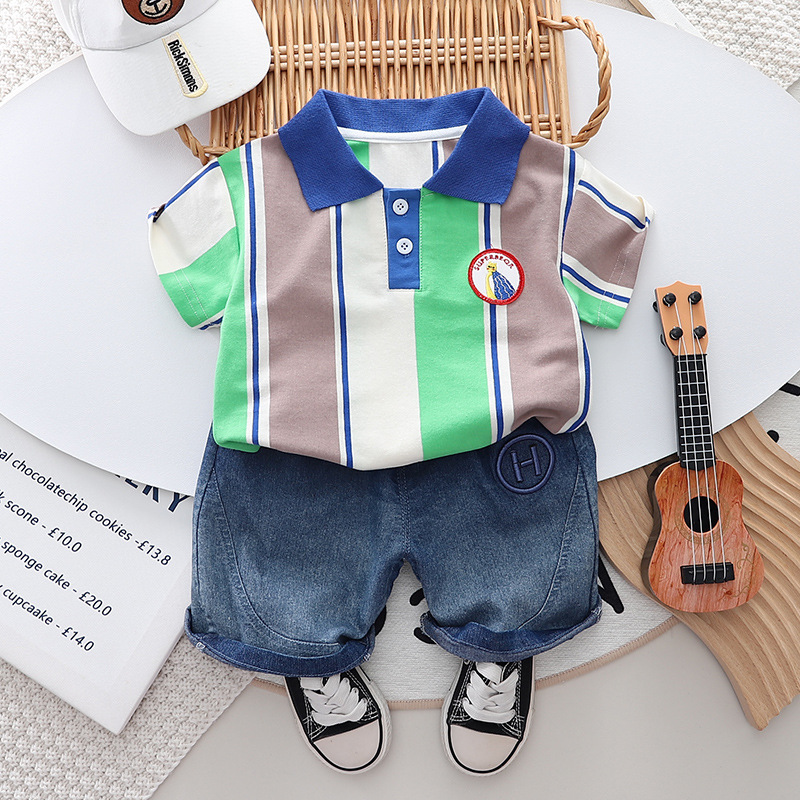 소년의 여름 세트 2024 새로운 도착 수직 폴로 셔츠 잘 생긴 어린이 여름 유행 어린이 2 조각 유행 세트