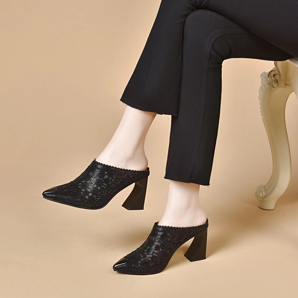 여성용 아우터 착용을위한 뾰족한 하이힐 슬리퍼 2024 새로운 유럽과 미국 스타일의 아이언 백을 가리키는 레이스 핫 드릴링 샌들 여성용 Baotou 하프 슬리퍼