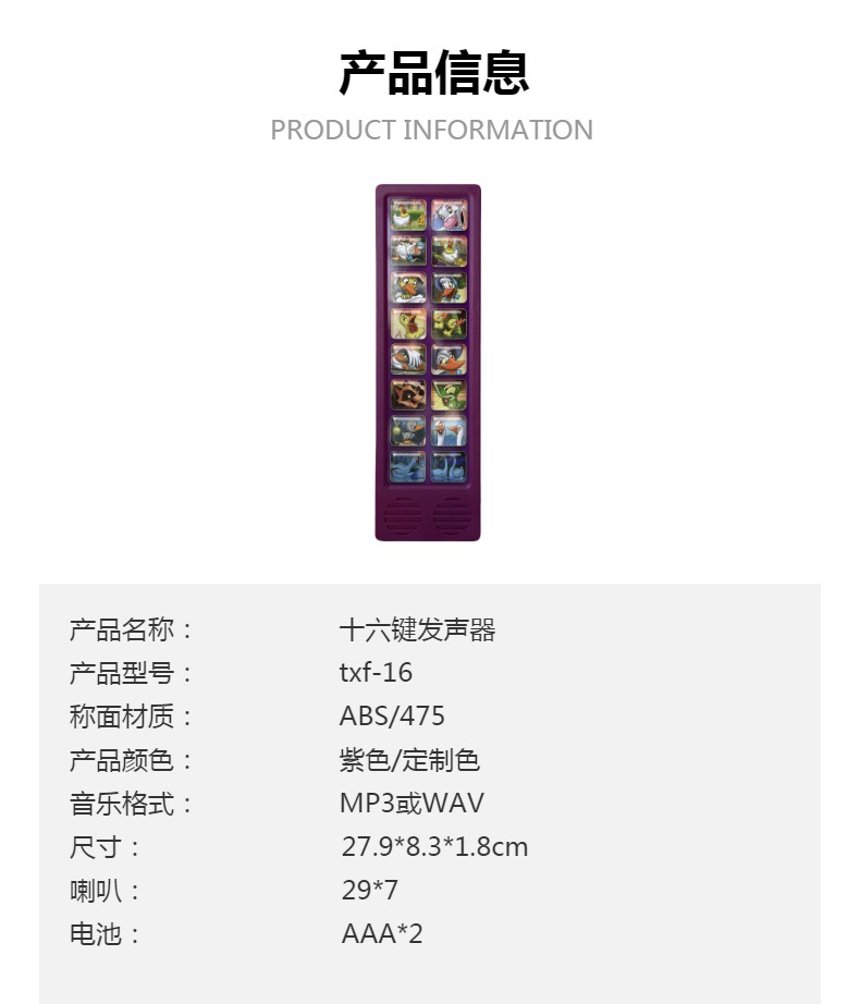深圳市腾鑫发科技有限公司主要经营早教书发声器、玩具等产品专业生产加工的公司,拥有完整、科学的质量管理体系。深圳市腾鑫发科技有限公司的诚信、实力和产品质量获得业界的认可。欢迎各界朋友莅临参观指导和业务洽谈。