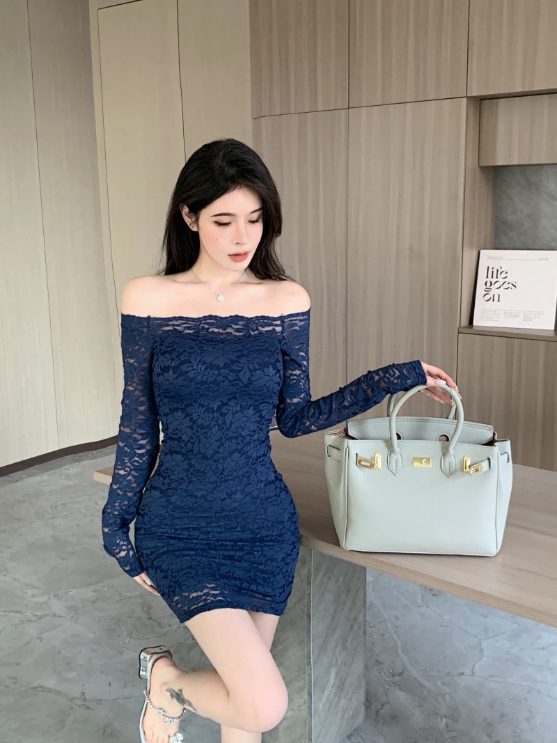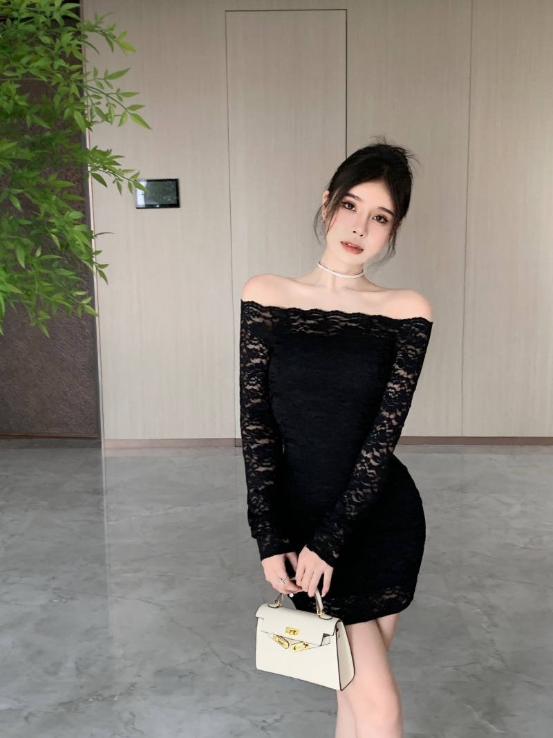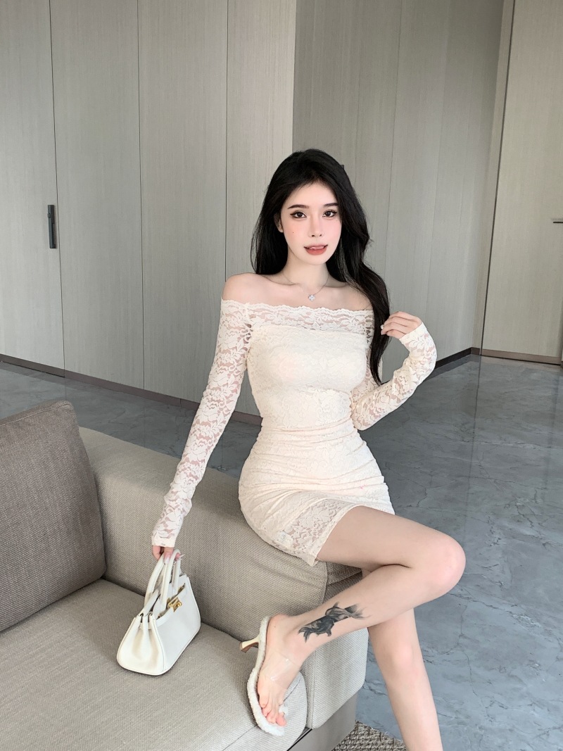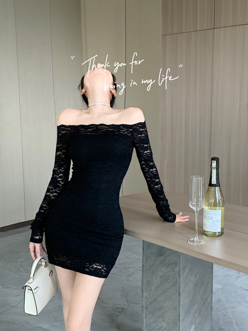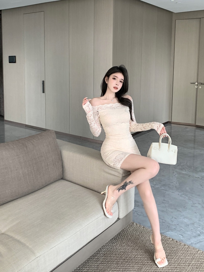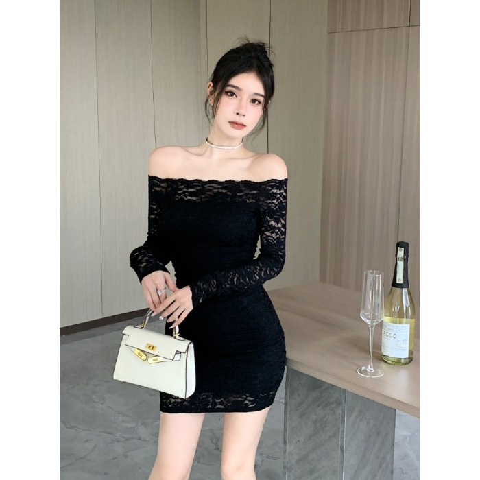 프랑스 스타일 오프 숄더 레이스 원피스 여성 봄 연예인 우아한 슬림 스커트 순수한 소원 허리 원스텝 힙합 스커트