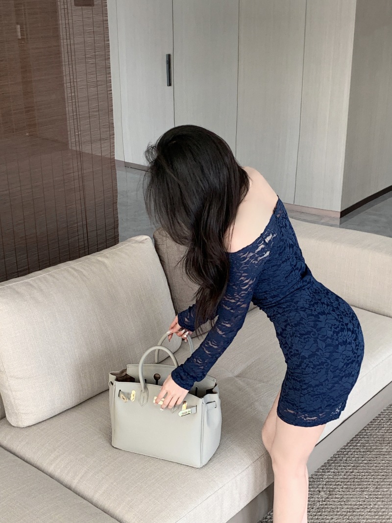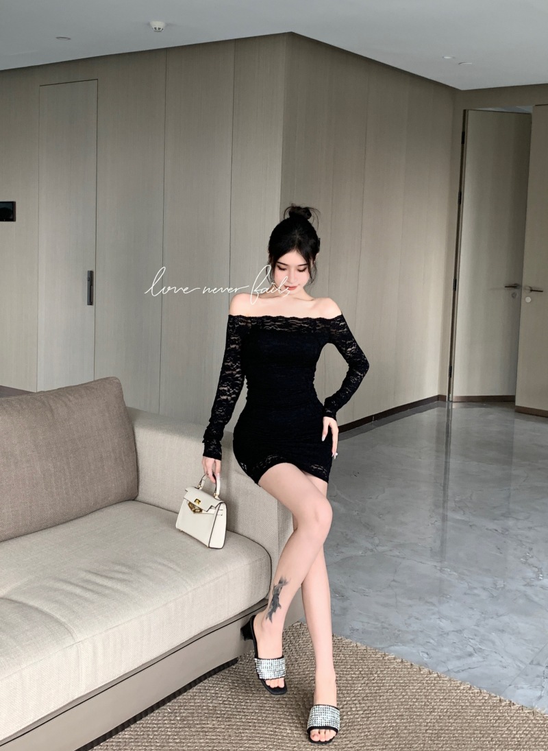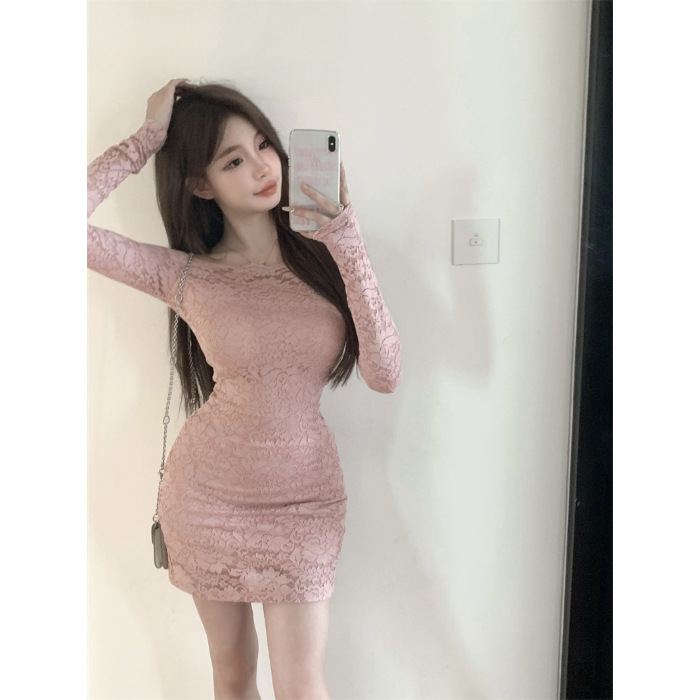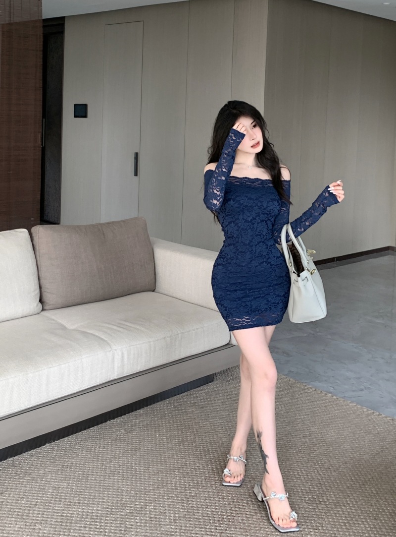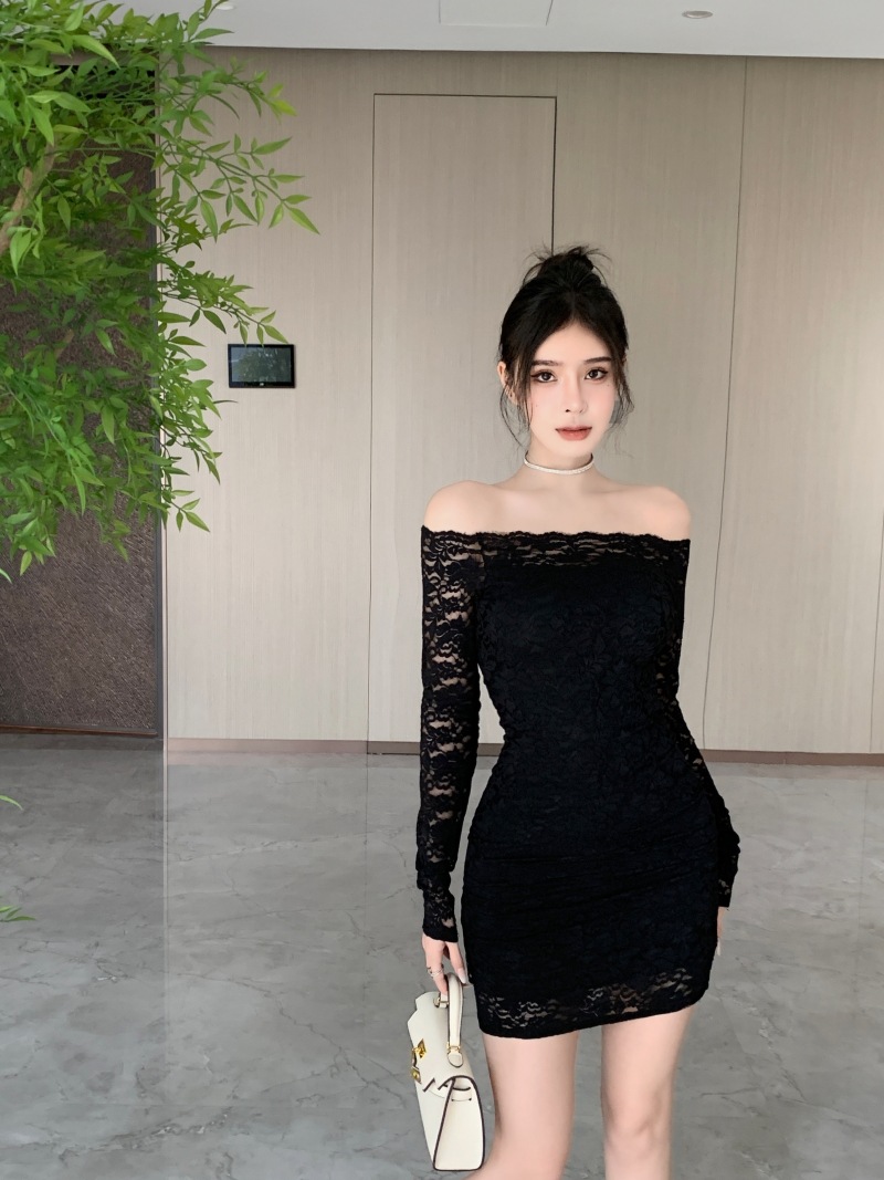 프랑스 스타일 오프 숄더 레이스 원피스 여성 봄 연예인 우아한 슬림 스커트 순수한 소원 허리 원스텝 힙합 스커트