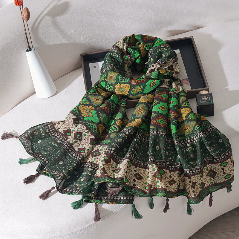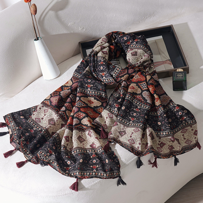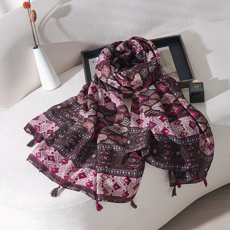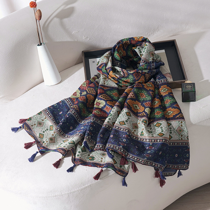 가을과 겨울 새로운 민족 면화 및 리넨 술 바느질 썬 스크린 인쇄 스카프 북서부 칭하이 호수 여행 따뜻한 목도리