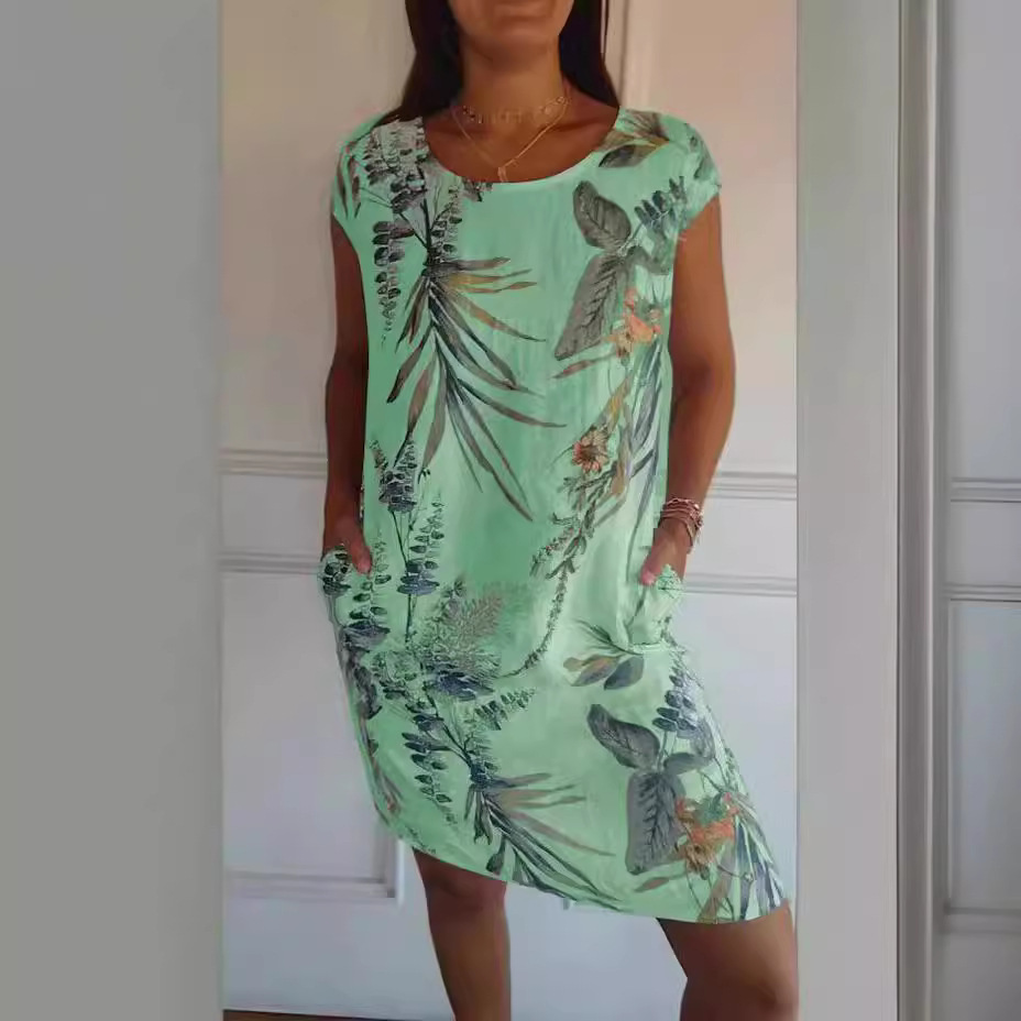 재고 국경 간 아마존 독립 역 AliExpress 여성 승무원 느슨한 반팔 인쇄 원피스 여성용 포켓 스커트 폭발스토어 가기