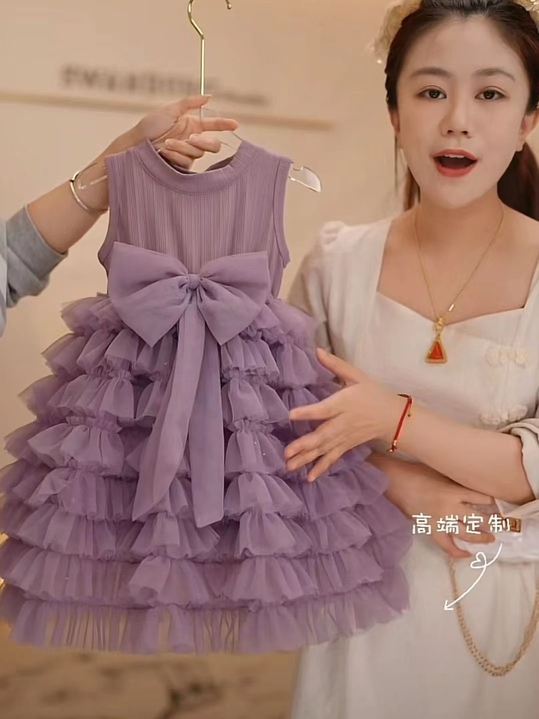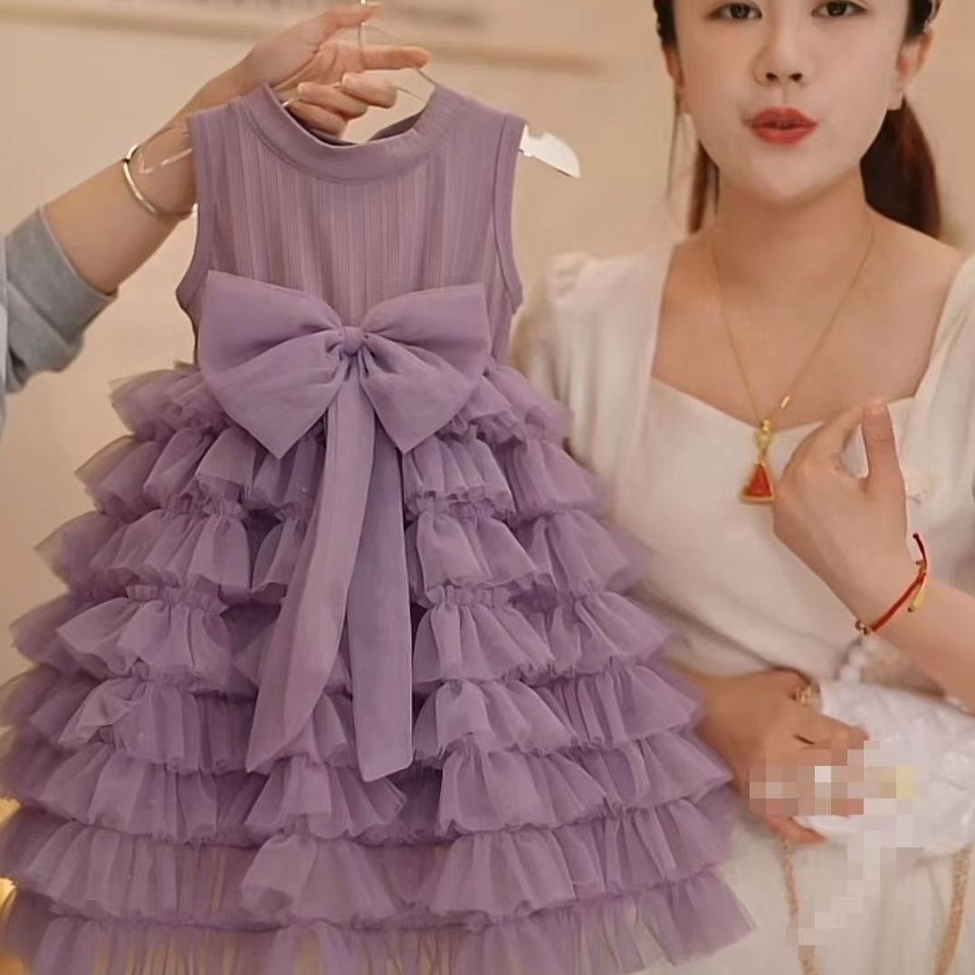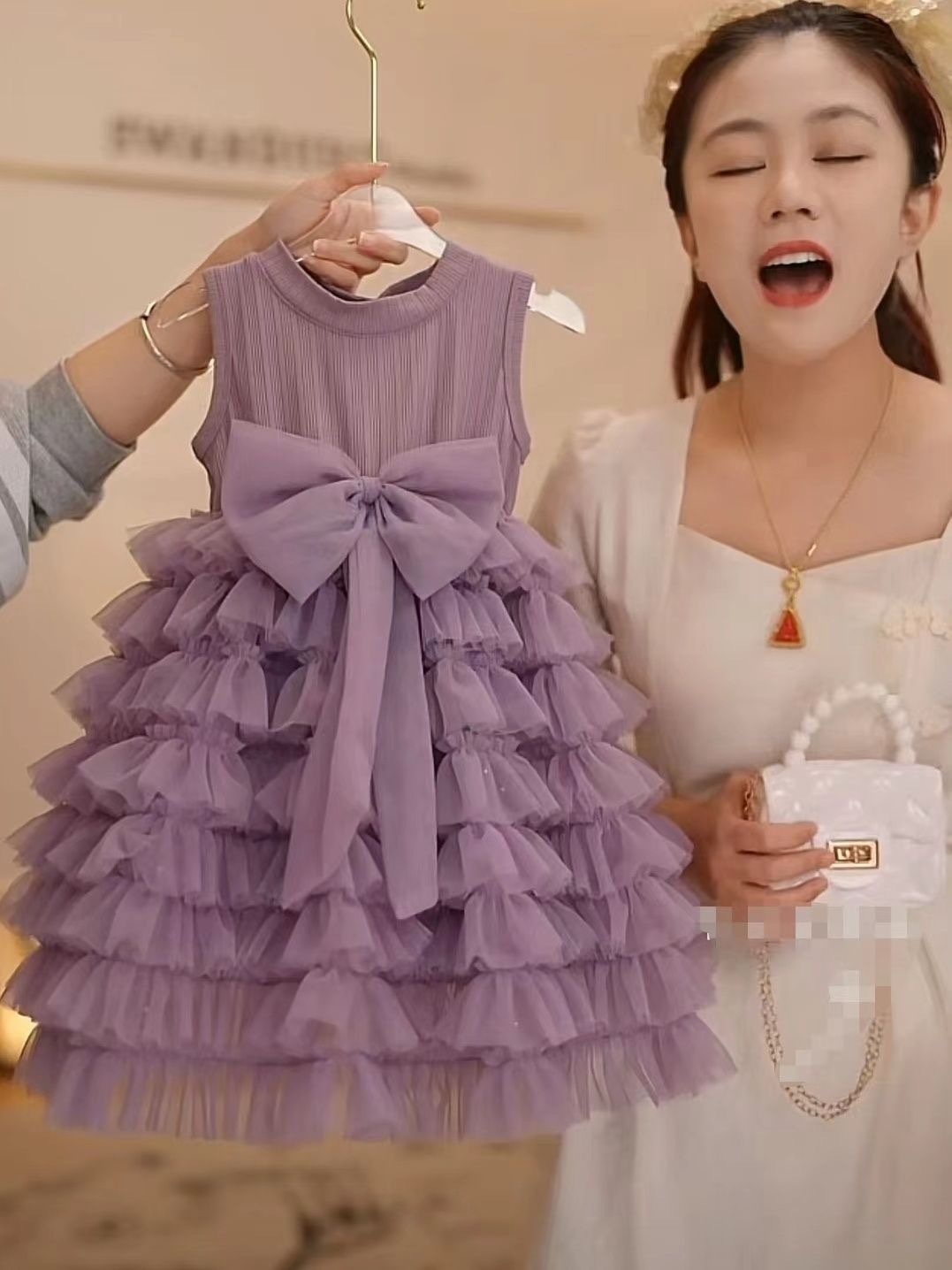 소녀의 원피스 2024 여름 새로운 스타일 서양식 달콤한 귀 퍼프 메쉬 어린이 공주 케이크 여성스토어 가기