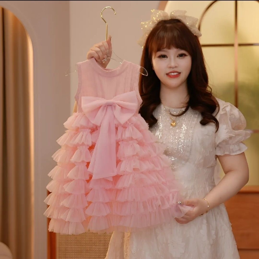 소녀의 원피스 2024 여름 새로운 스타일 서양식 달콤한 귀 퍼프 메쉬 어린이 공주 케이크 여성