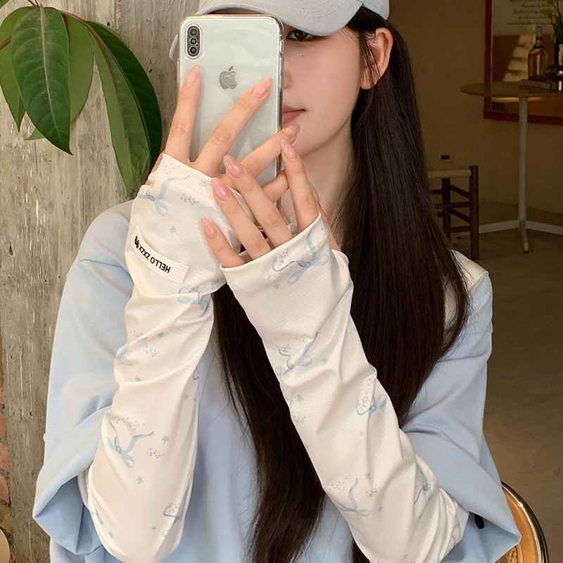 귀여운 가리 스타일 활 인쇄 얼음 소매 여성의 여름 선 스크린 야외 운전 자외선 보호 얇은 얼음 소매