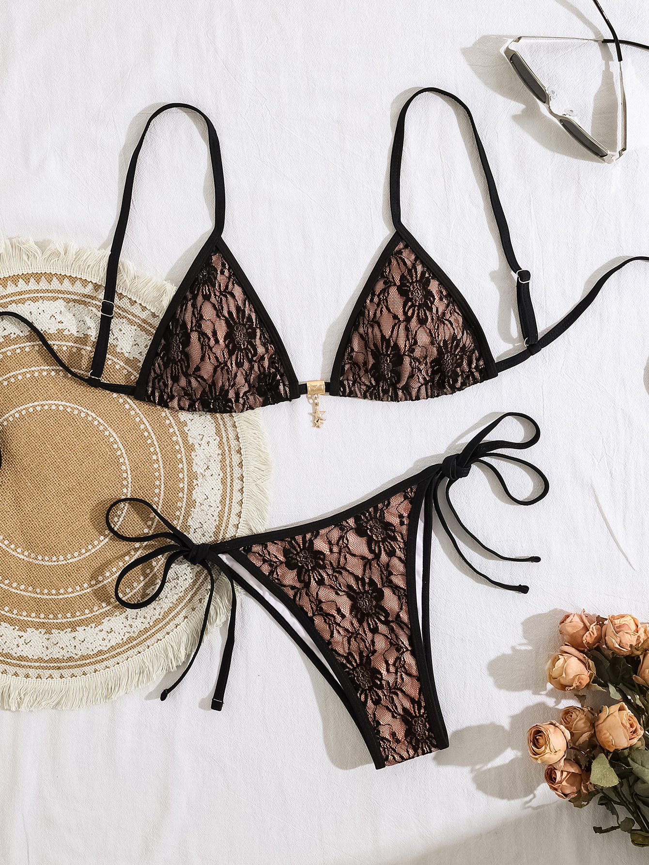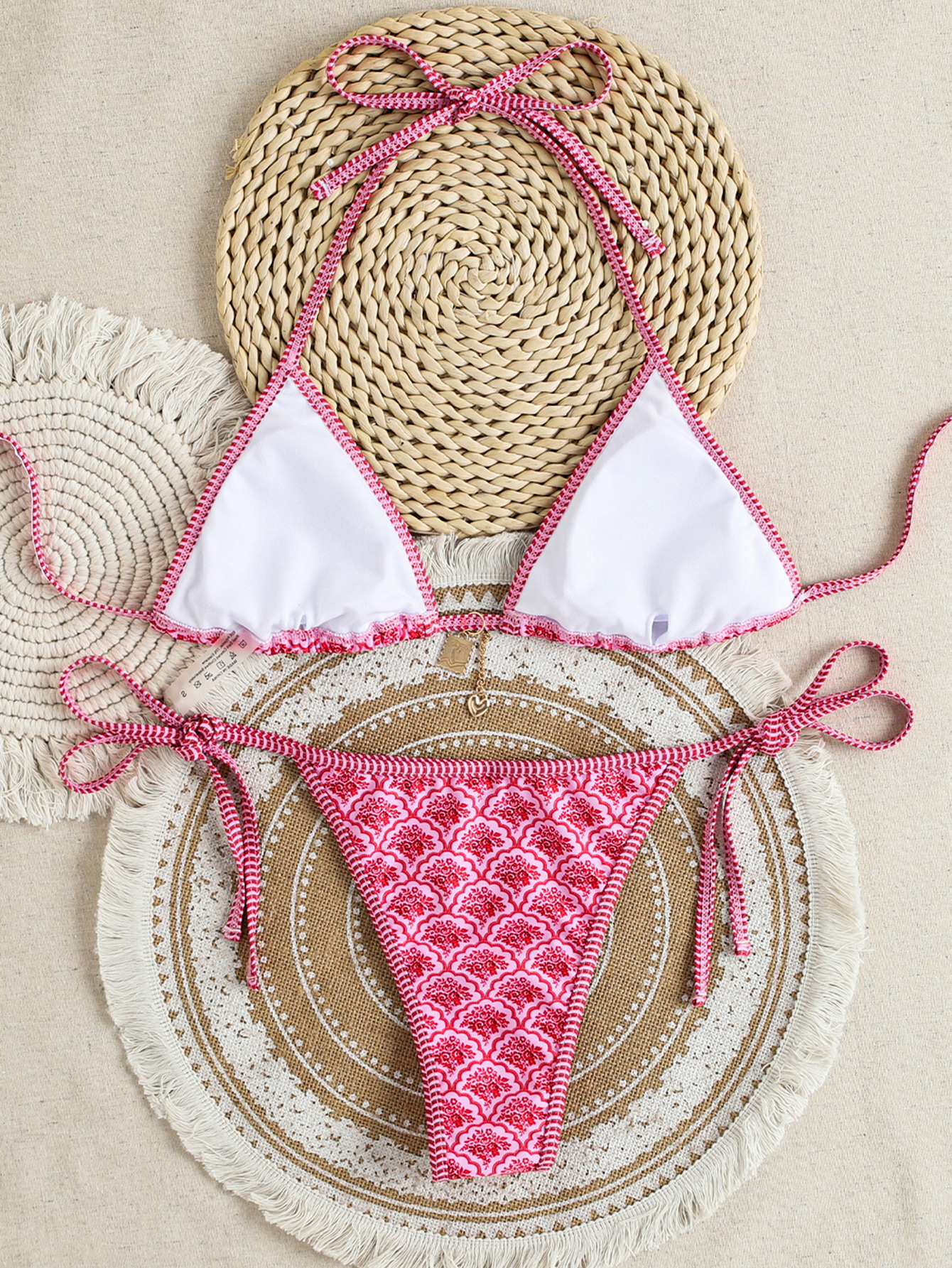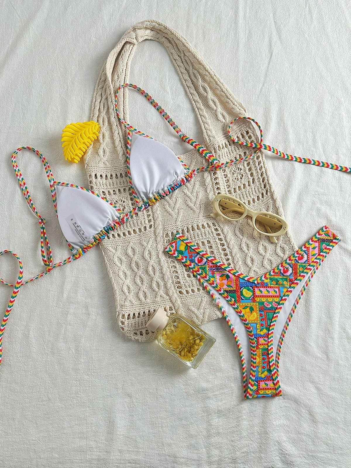 여성용 수영복 2025 새로운 국경 간 유럽과 미국의 인기 있는 컬러 대비 프린트 레이스 업 섹시한 비키니 스플릿 수영복