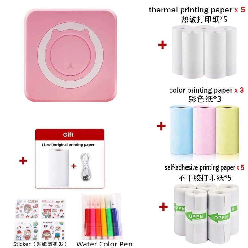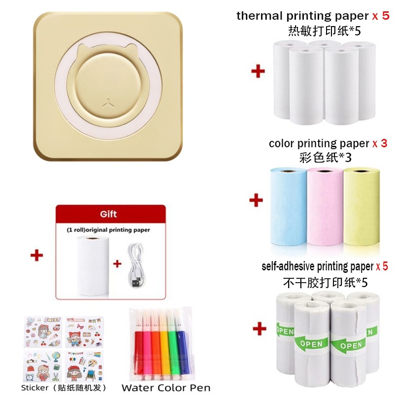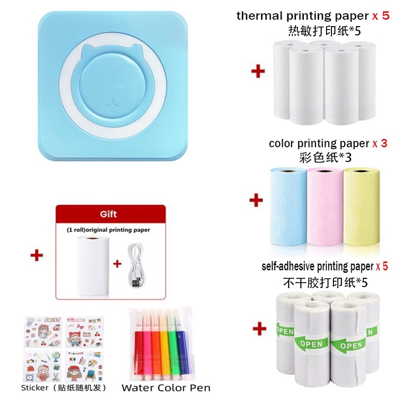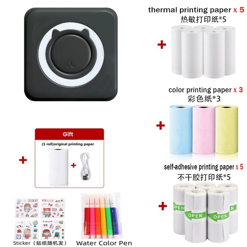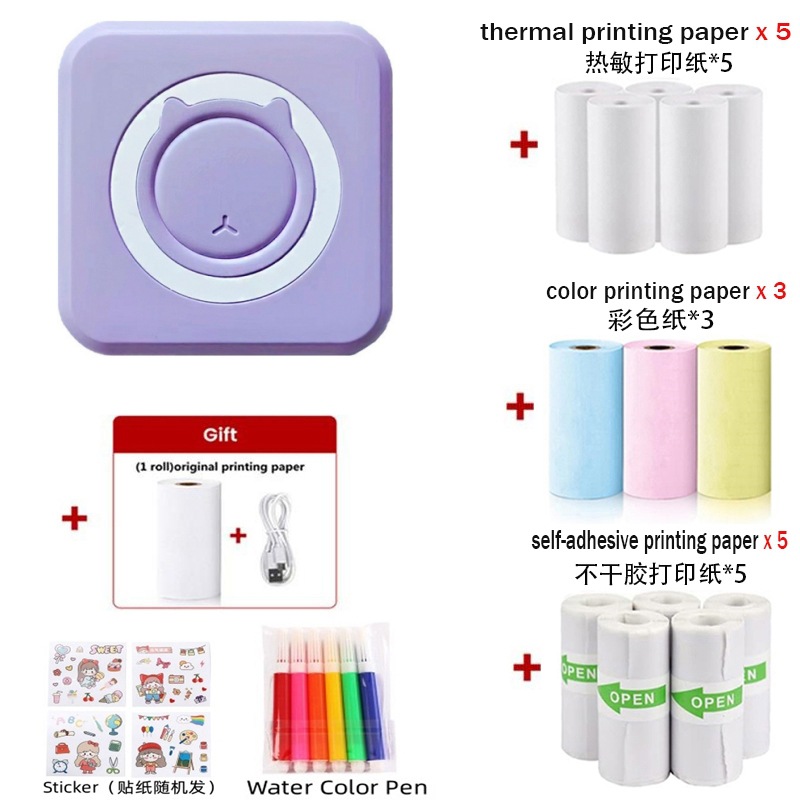 打印机1台+【自带1卷热敏纸+5卷热敏纸+5卷不干胶+3卷彩色纸+6支水彩笔+贴纸+布袋】为一整套。