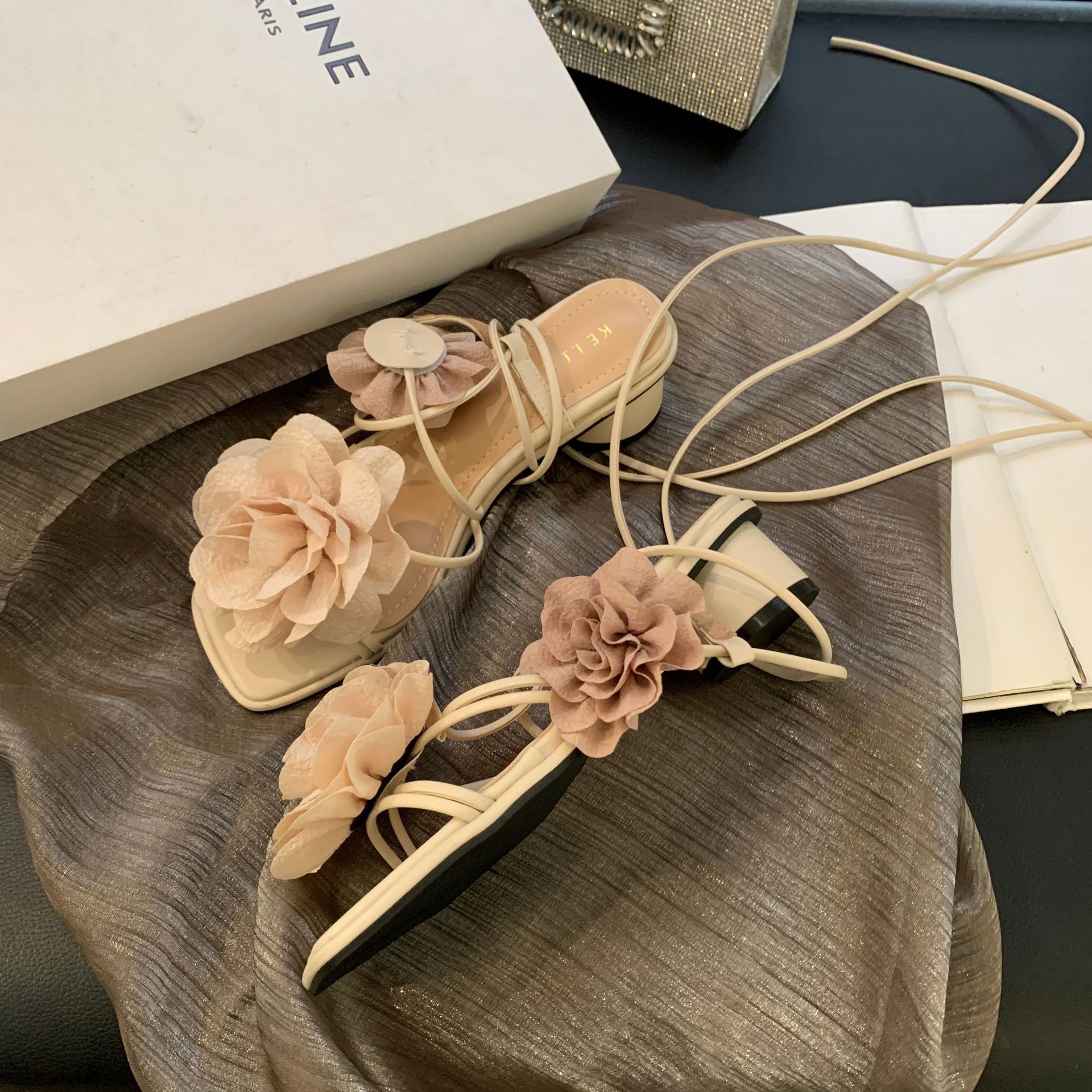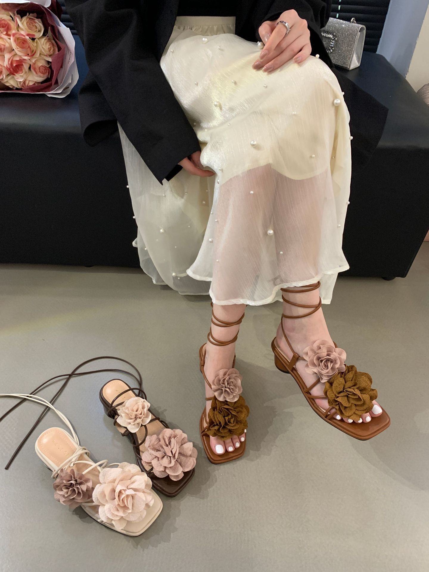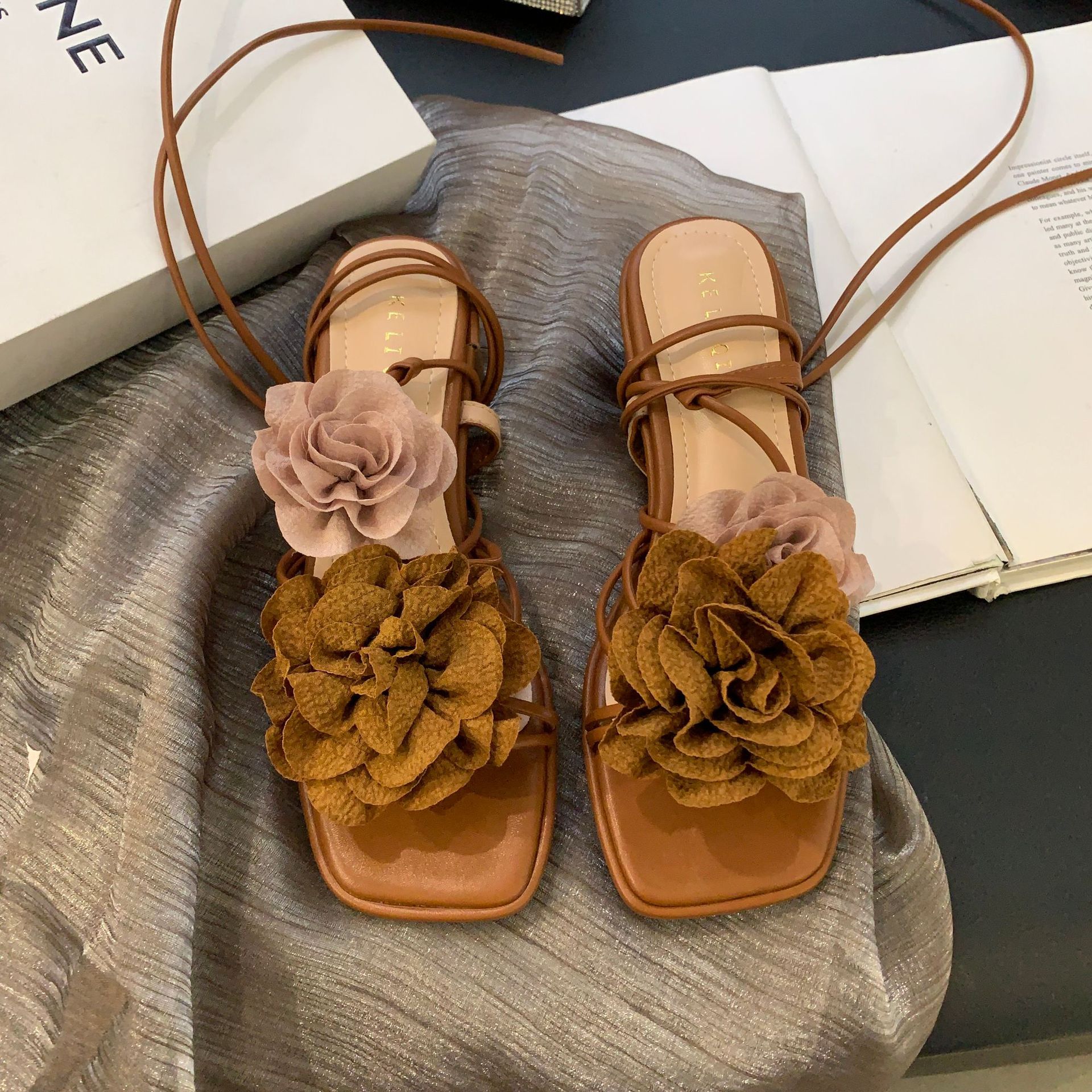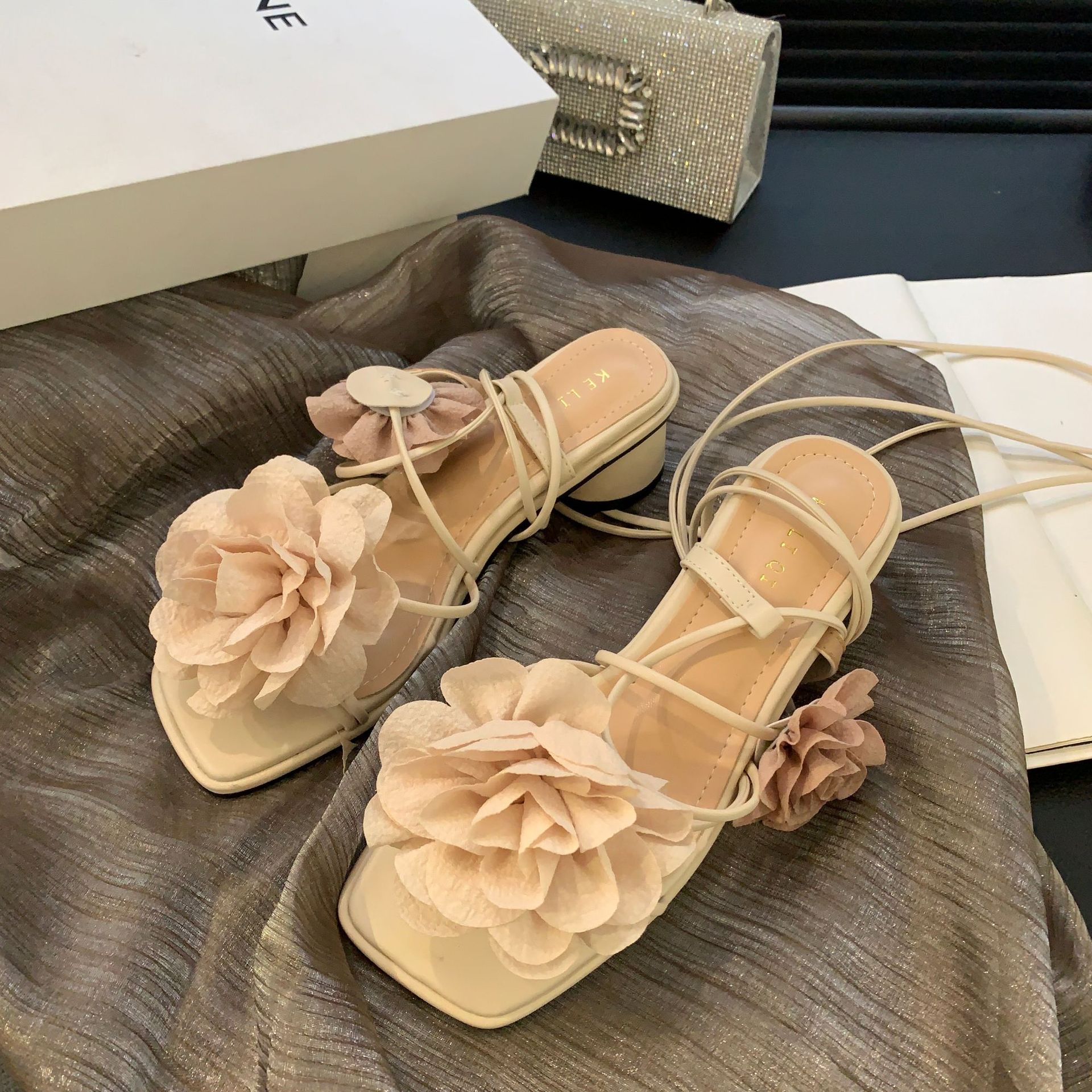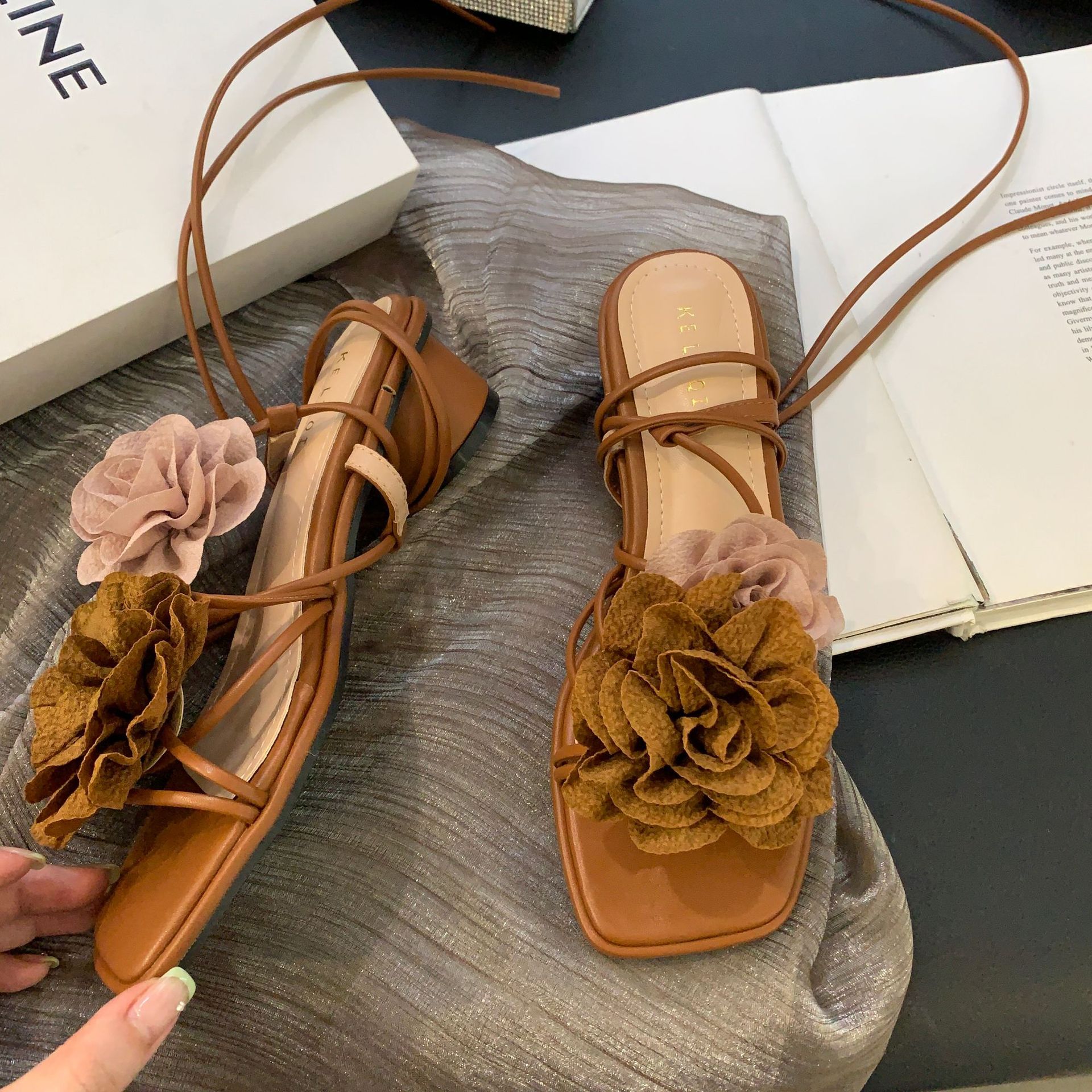 봄과 가을 2024 새로운 패션 청키 힐 프랑스 우아한 복고풍 꽃 크로스 스트랩 샌들 여성용 신발스토어 가기