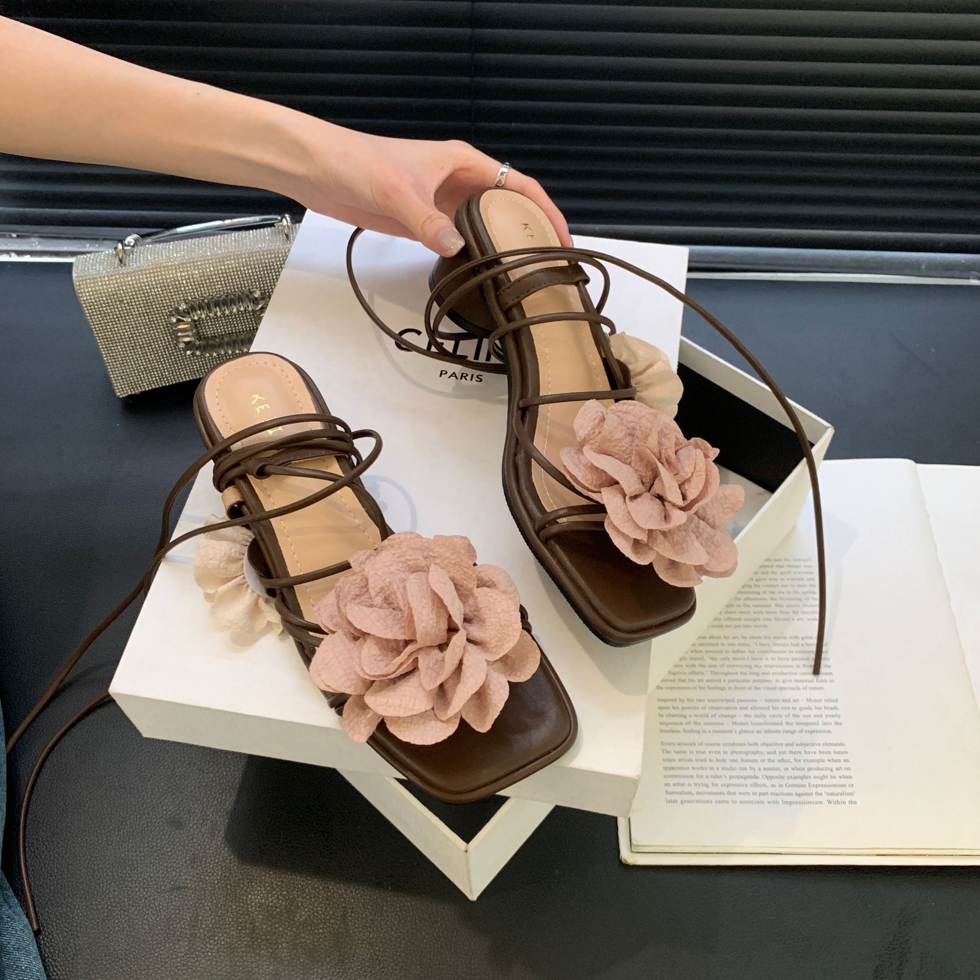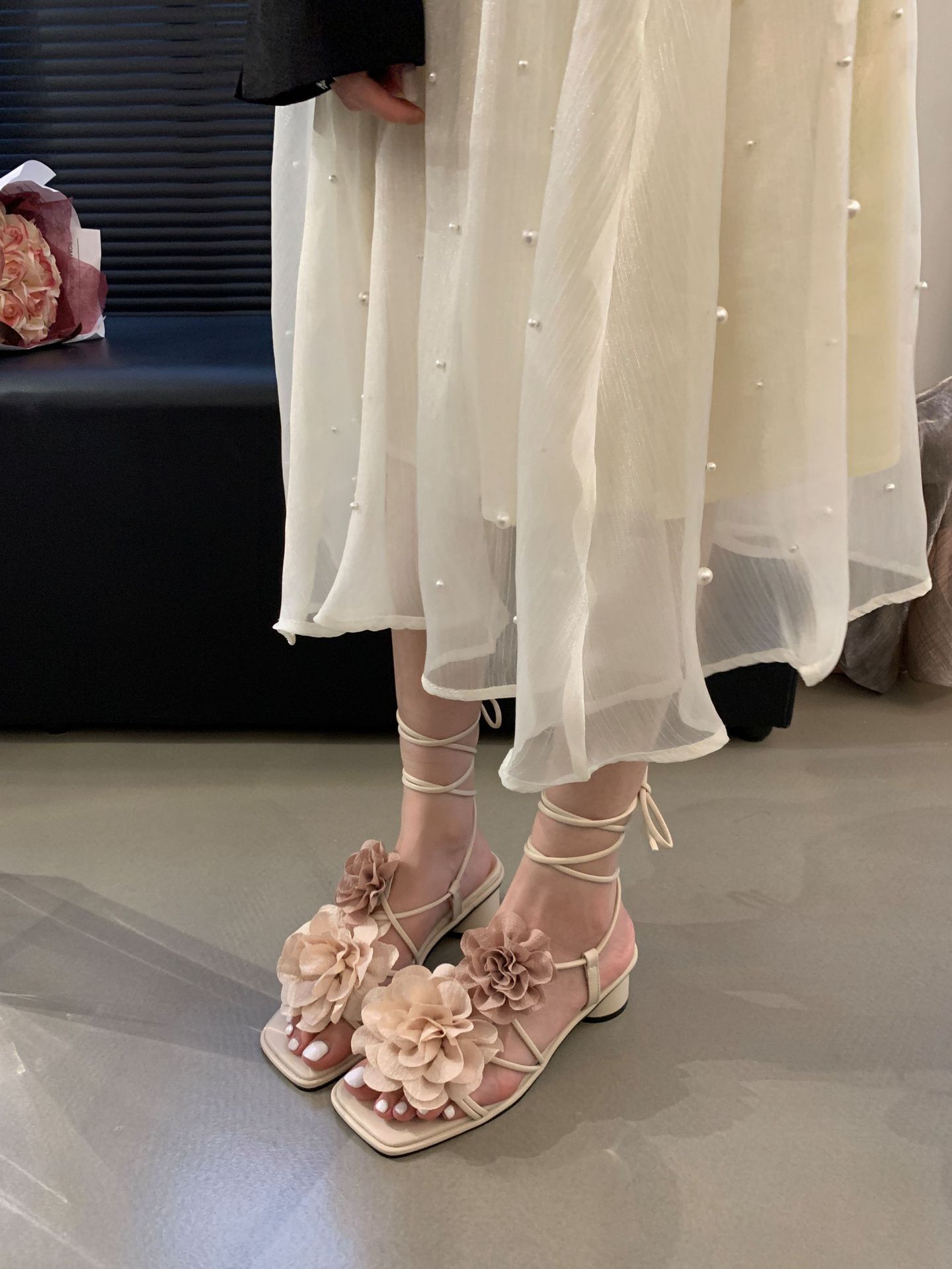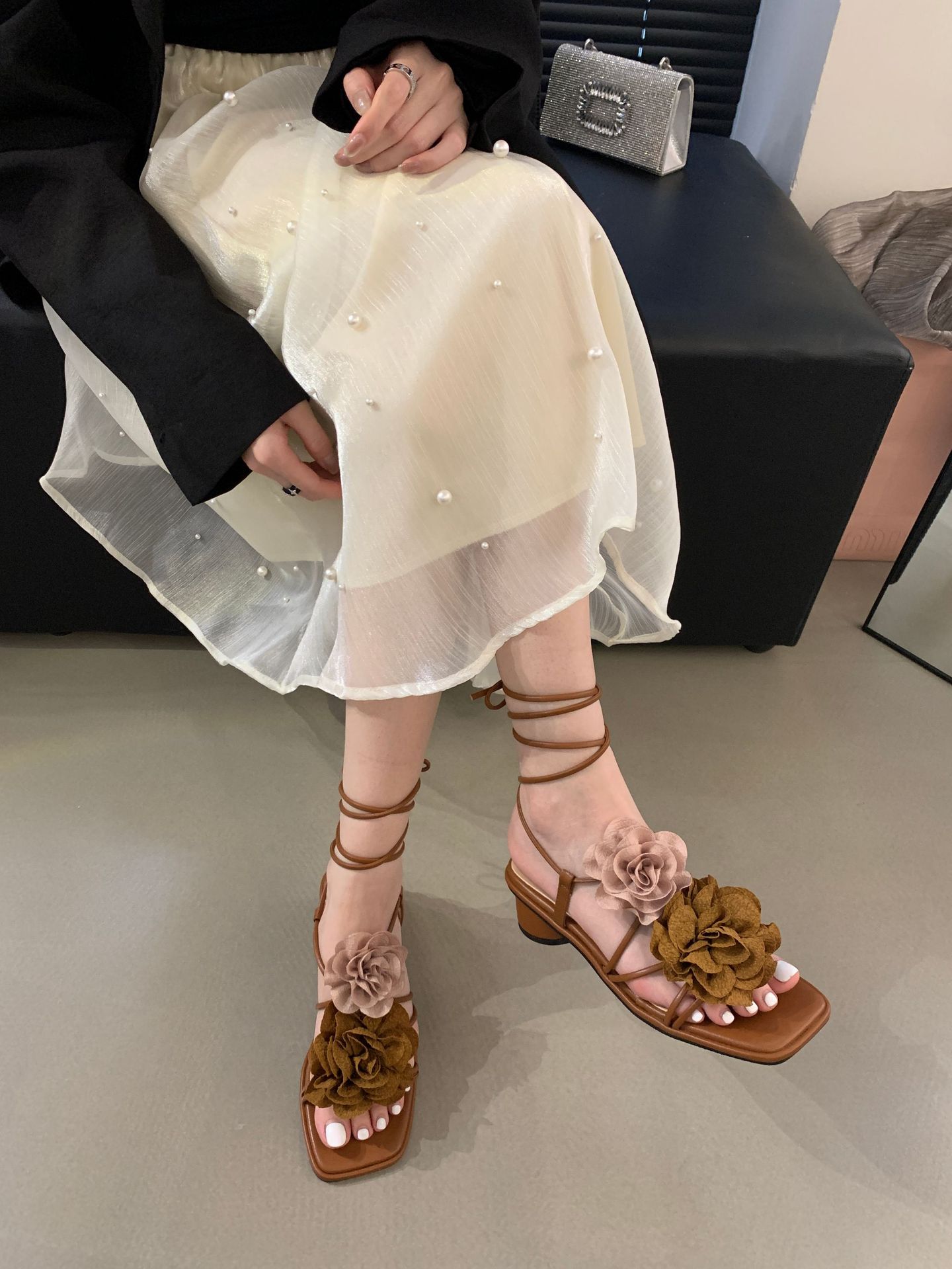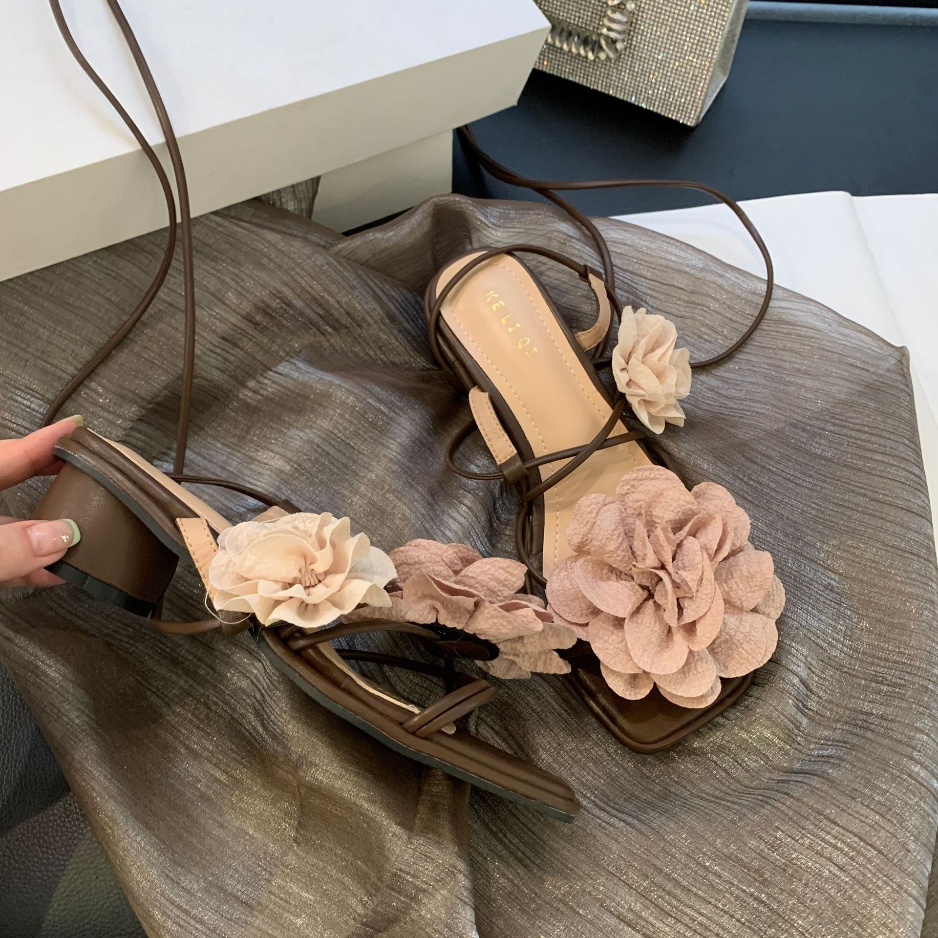 봄과 가을 2024 새로운 패션 청키 힐 프랑스 우아한 복고풍 꽃 크로스 스트랩 샌들 여성용 신발스토어 가기