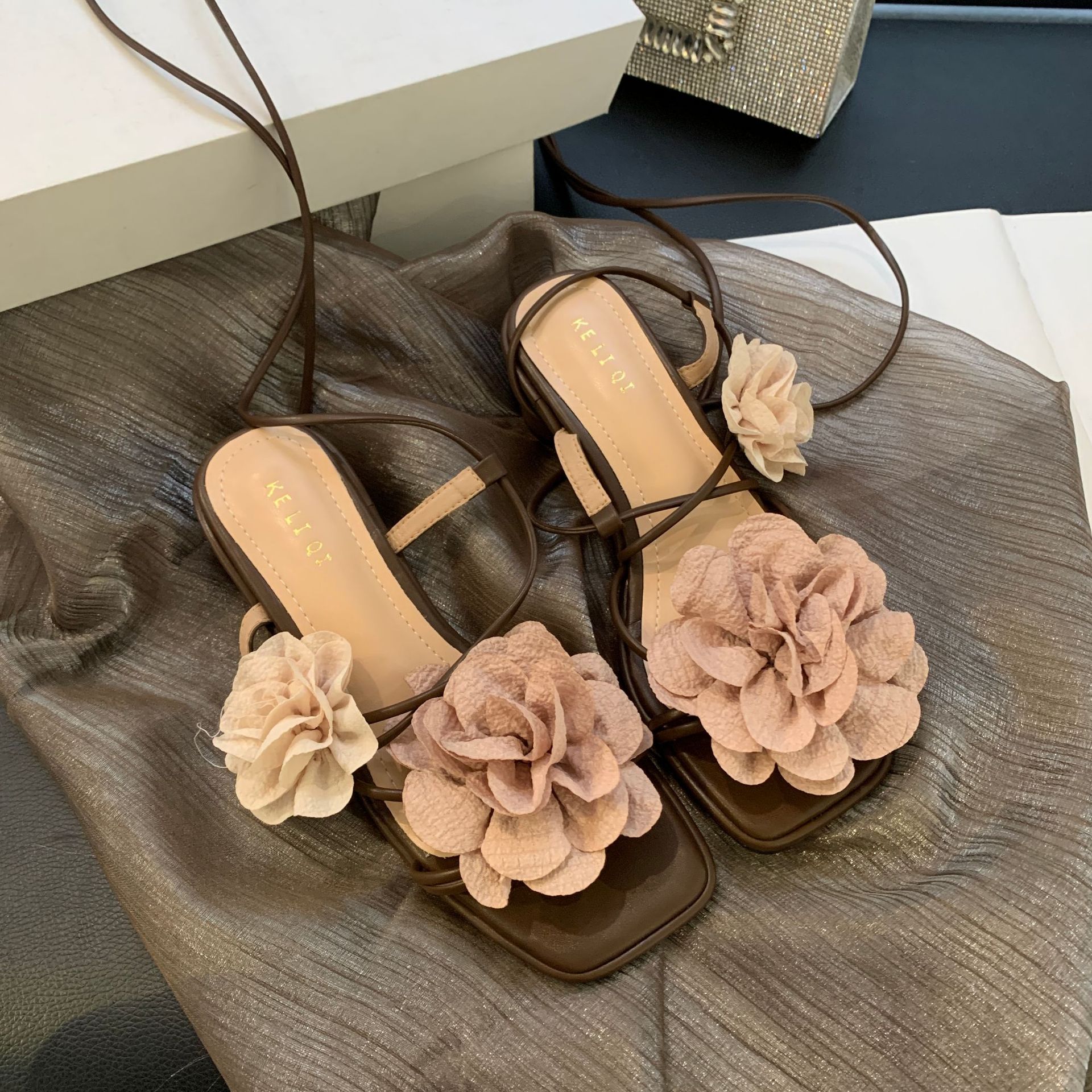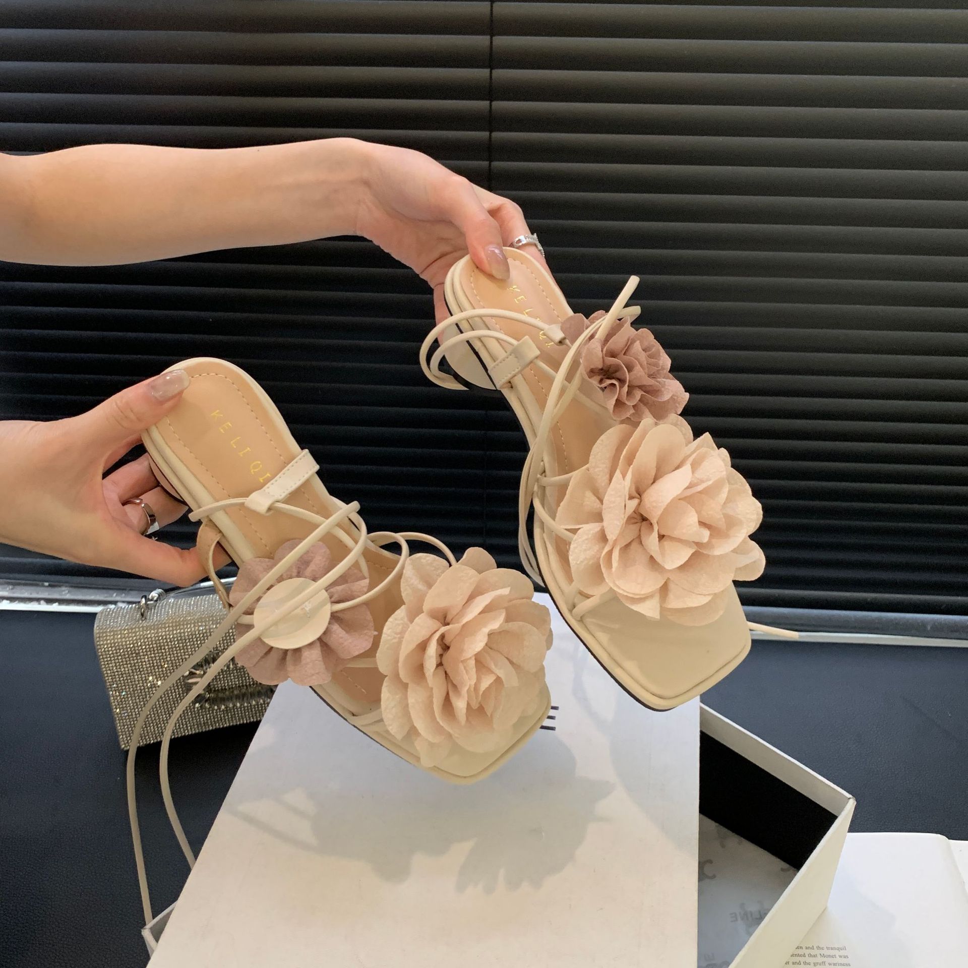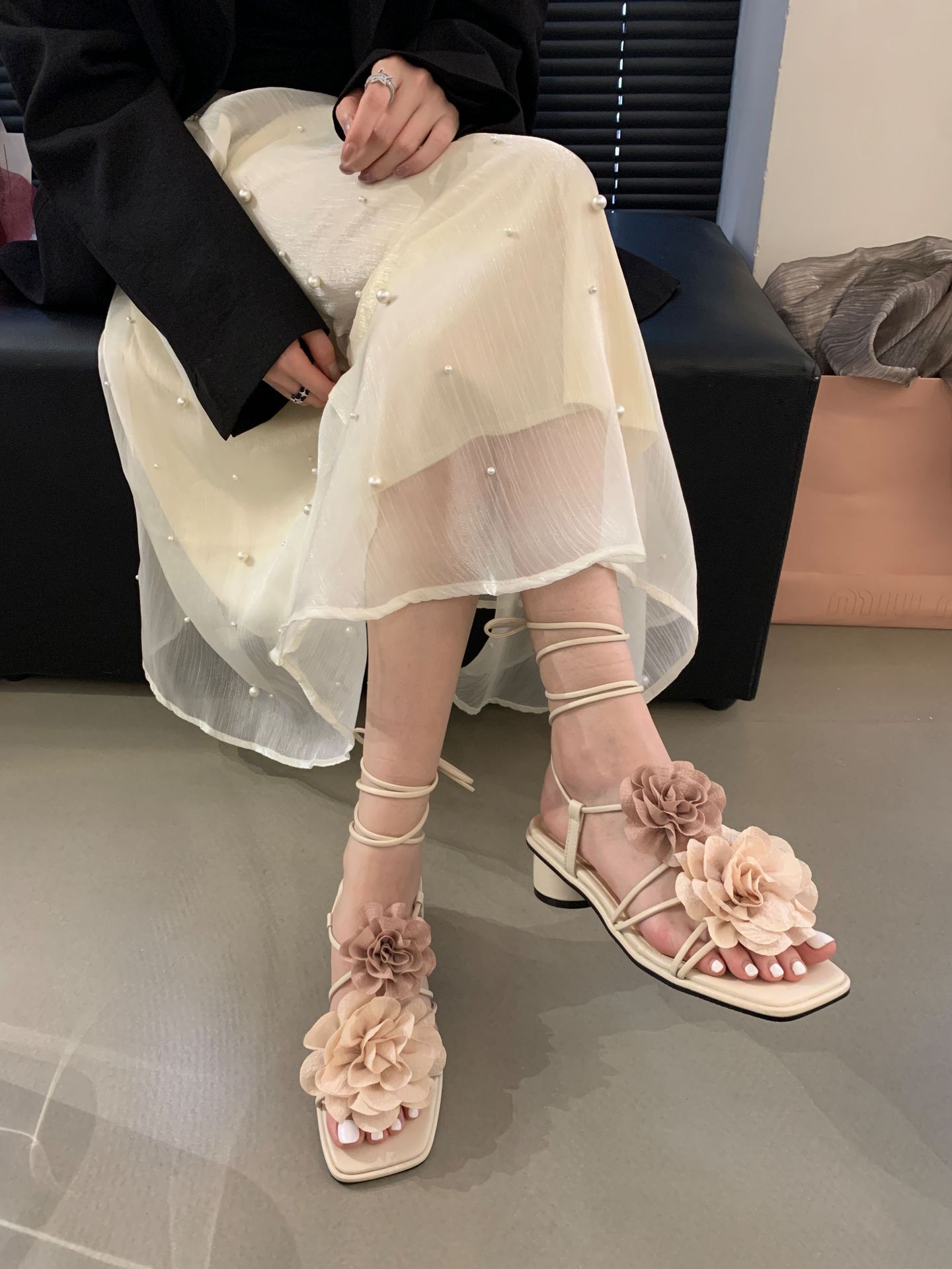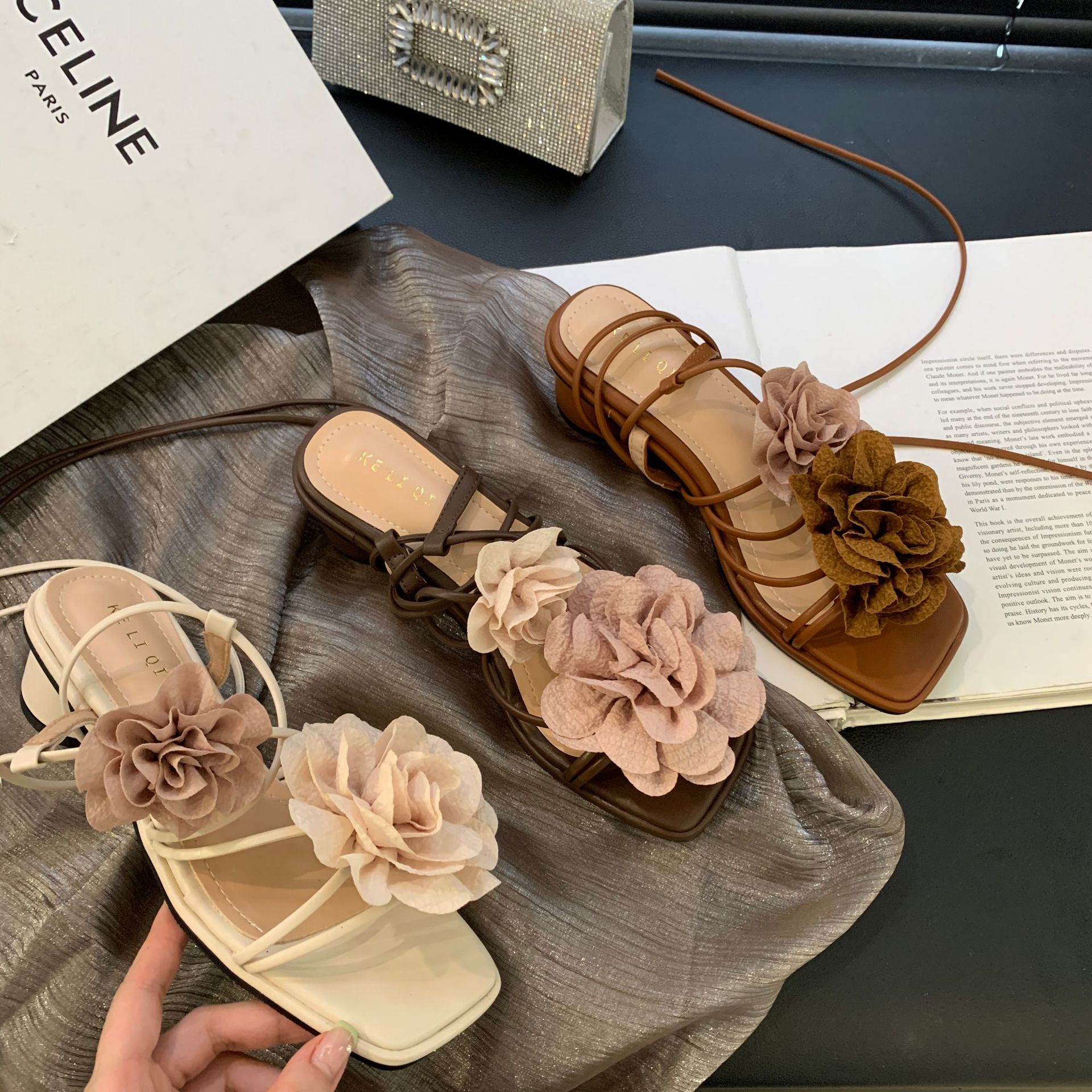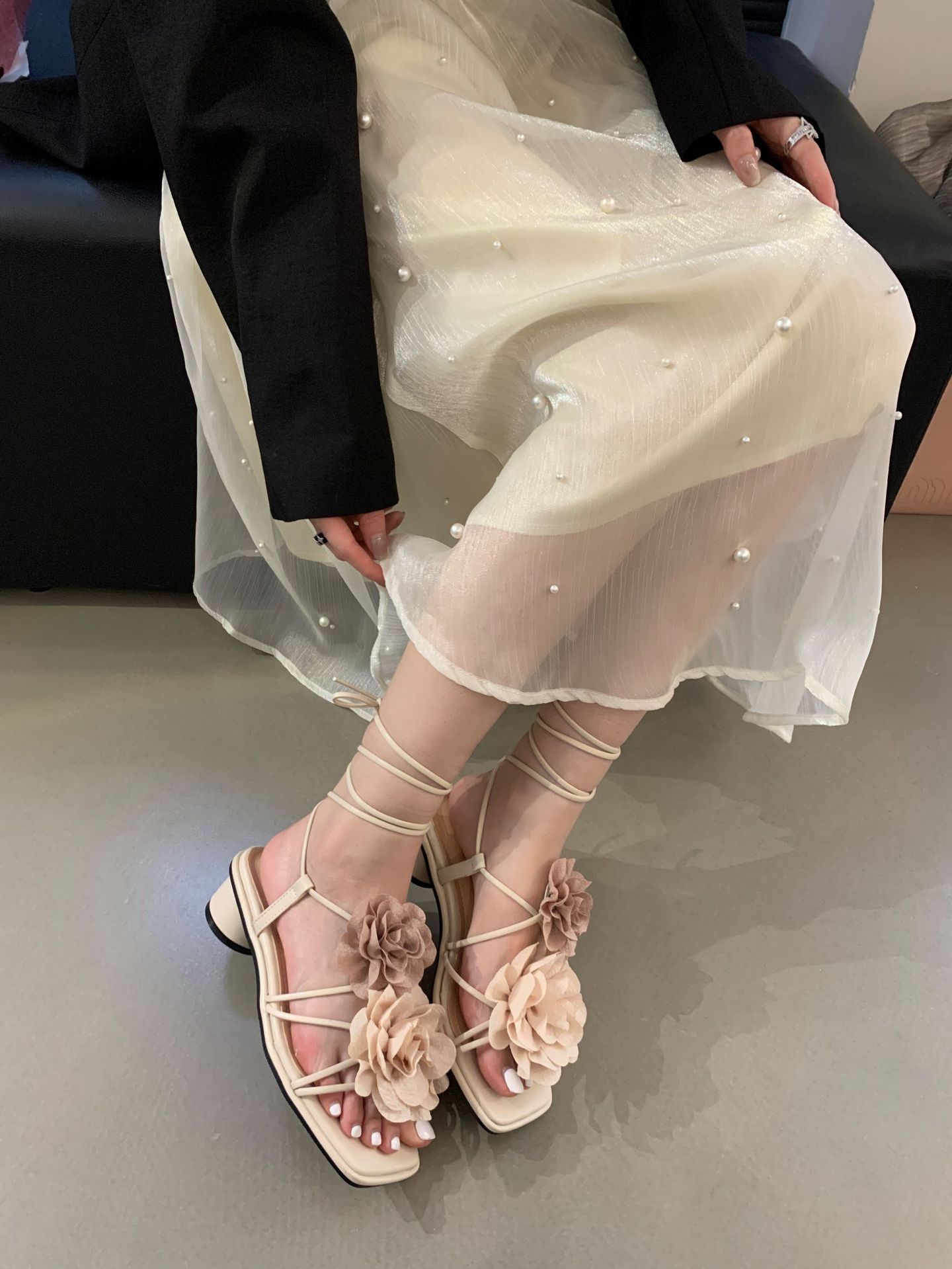 봄과 가을 2024 새로운 패션 청키 힐 프랑스 우아한 복고풍 꽃 크로스 스트랩 샌들 여성용 신발스토어 가기