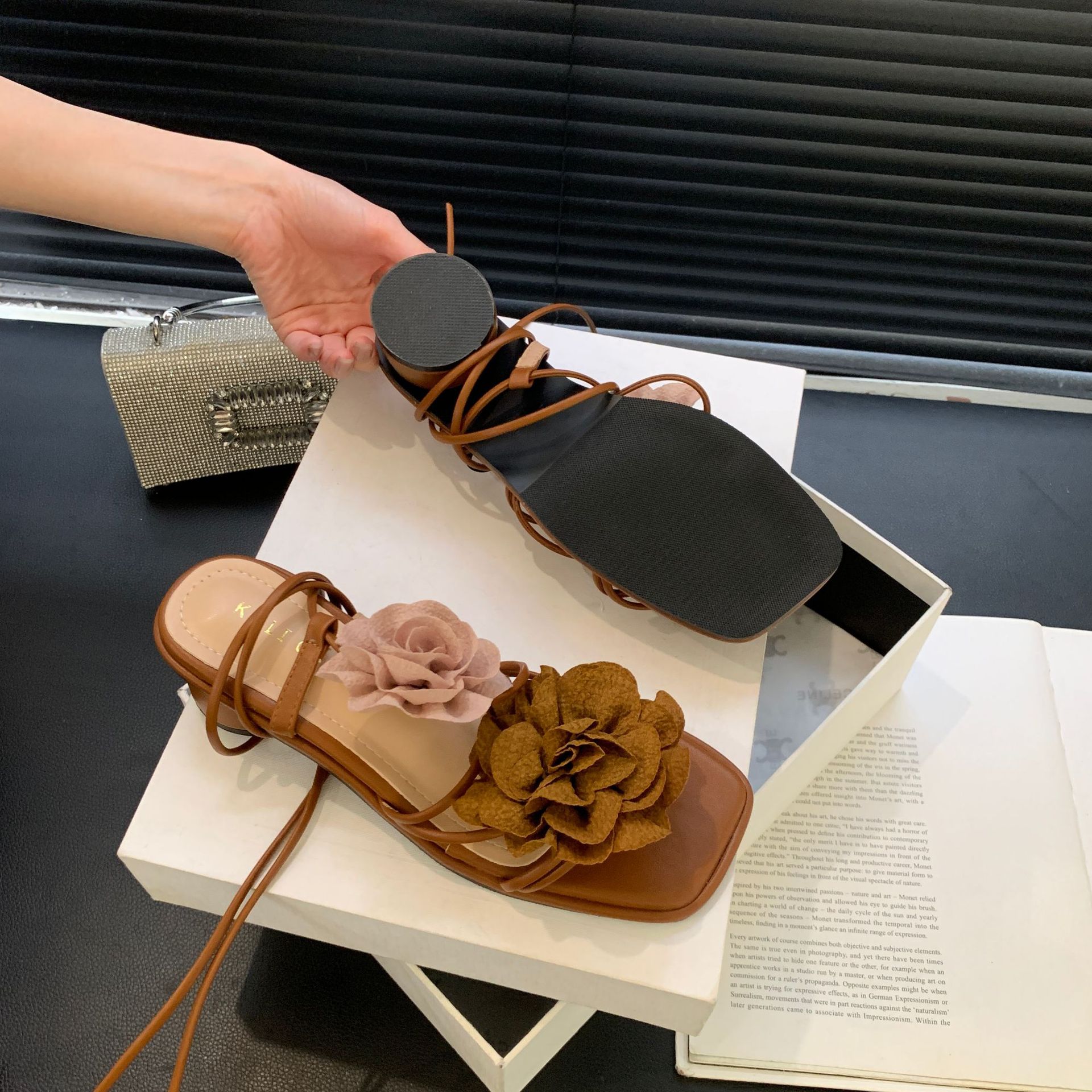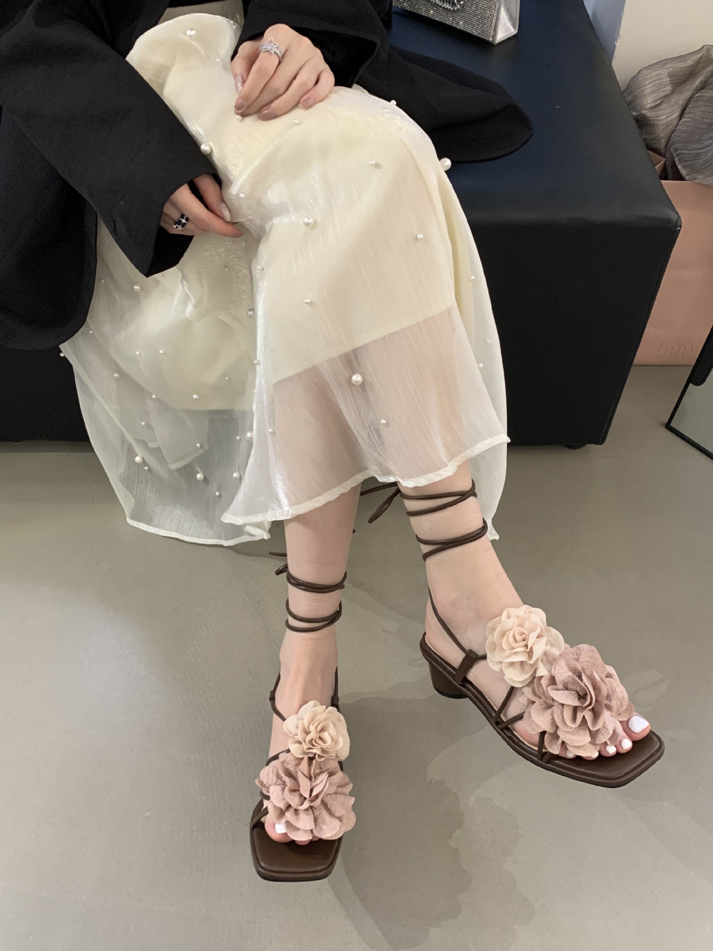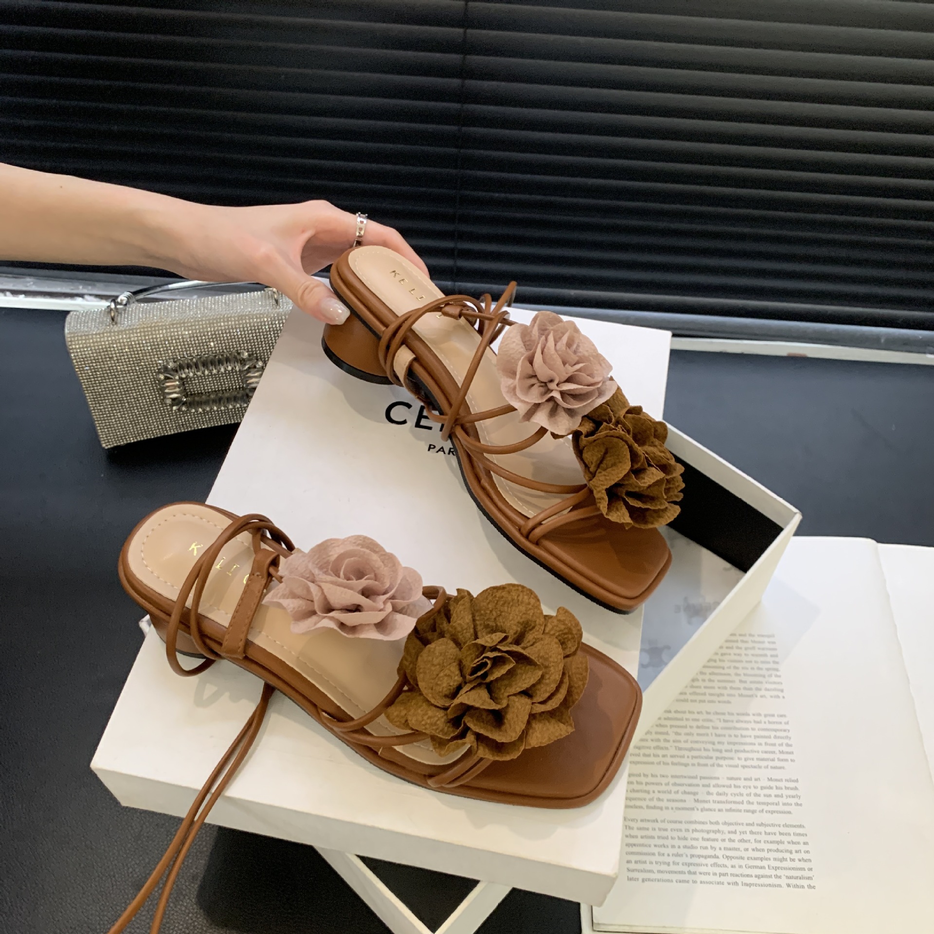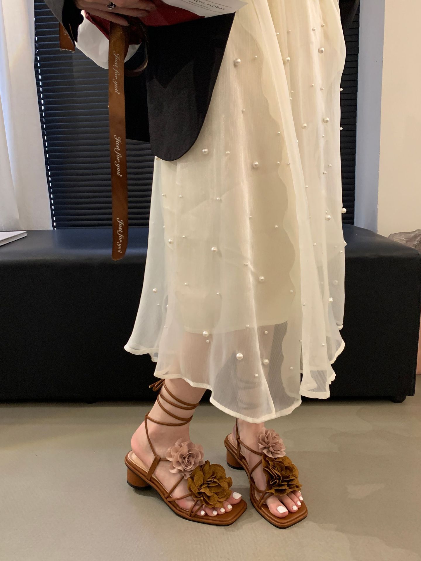 봄과 가을 2024 새로운 패션 청키 힐 프랑스 우아한 복고풍 꽃 크로스 스트랩 샌들 여성용 신발스토어 가기