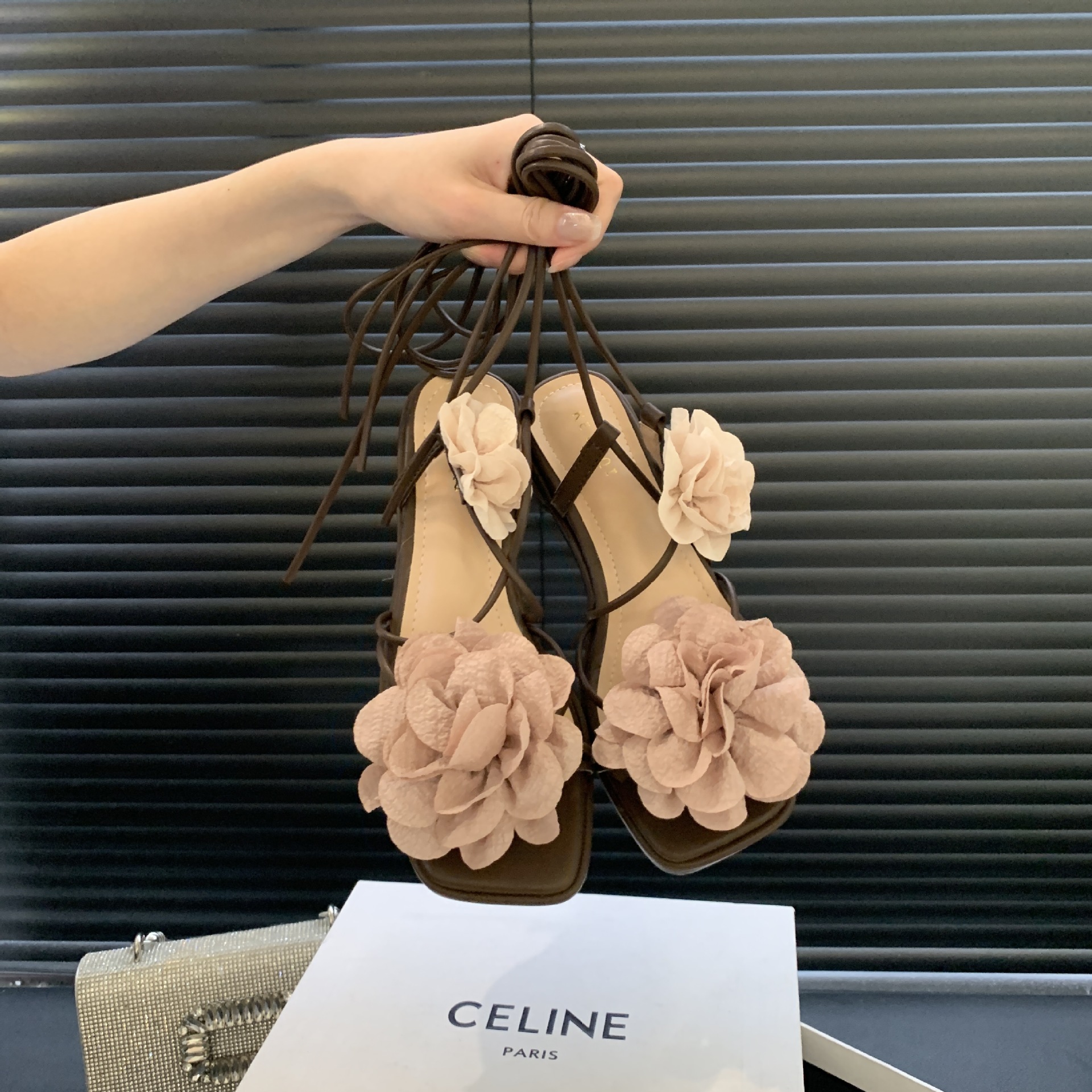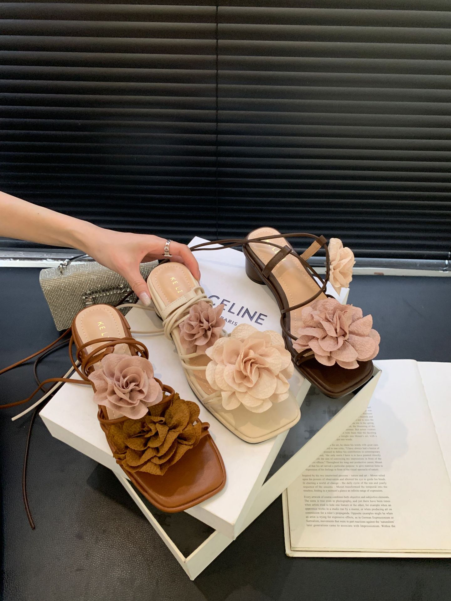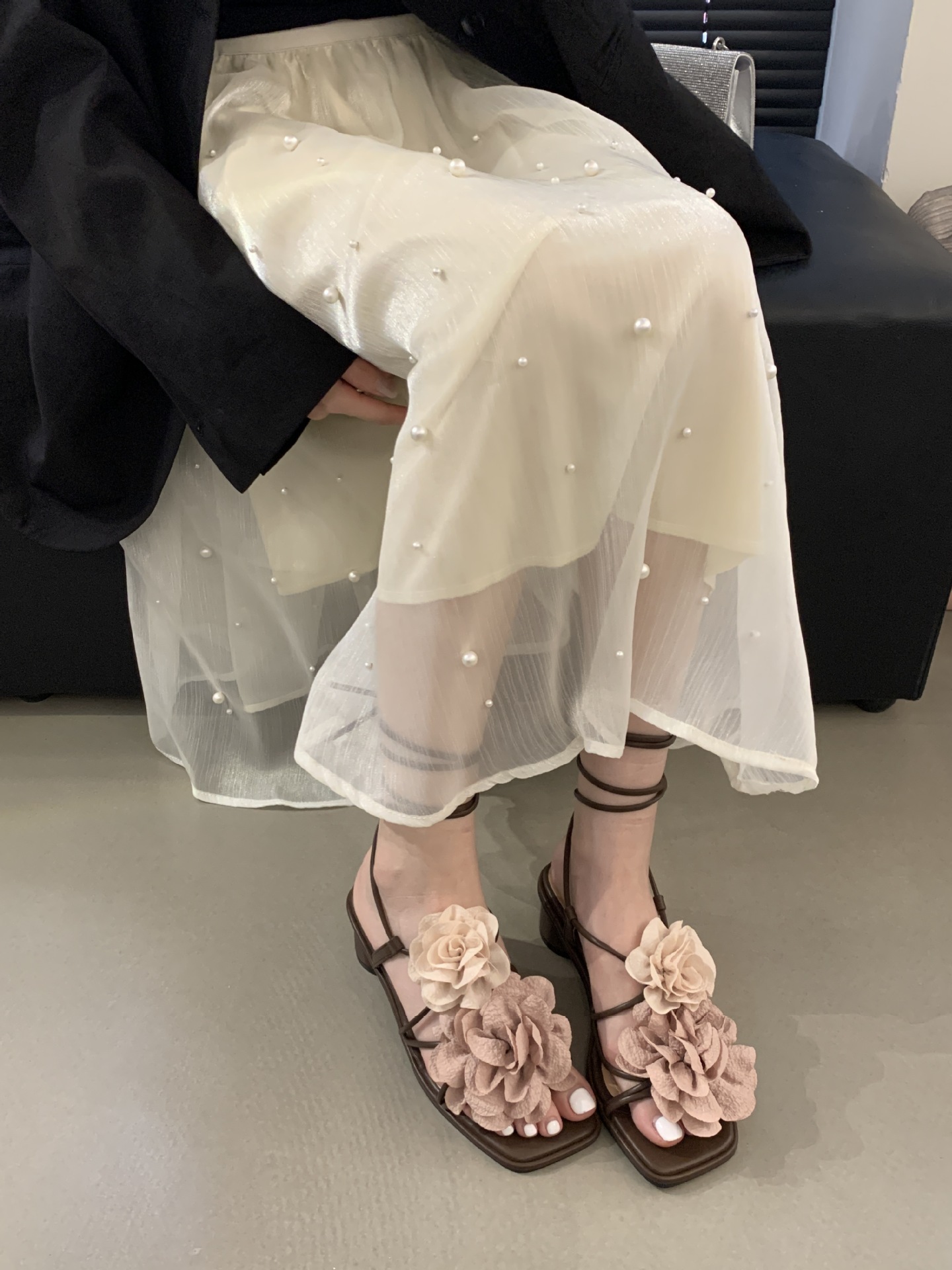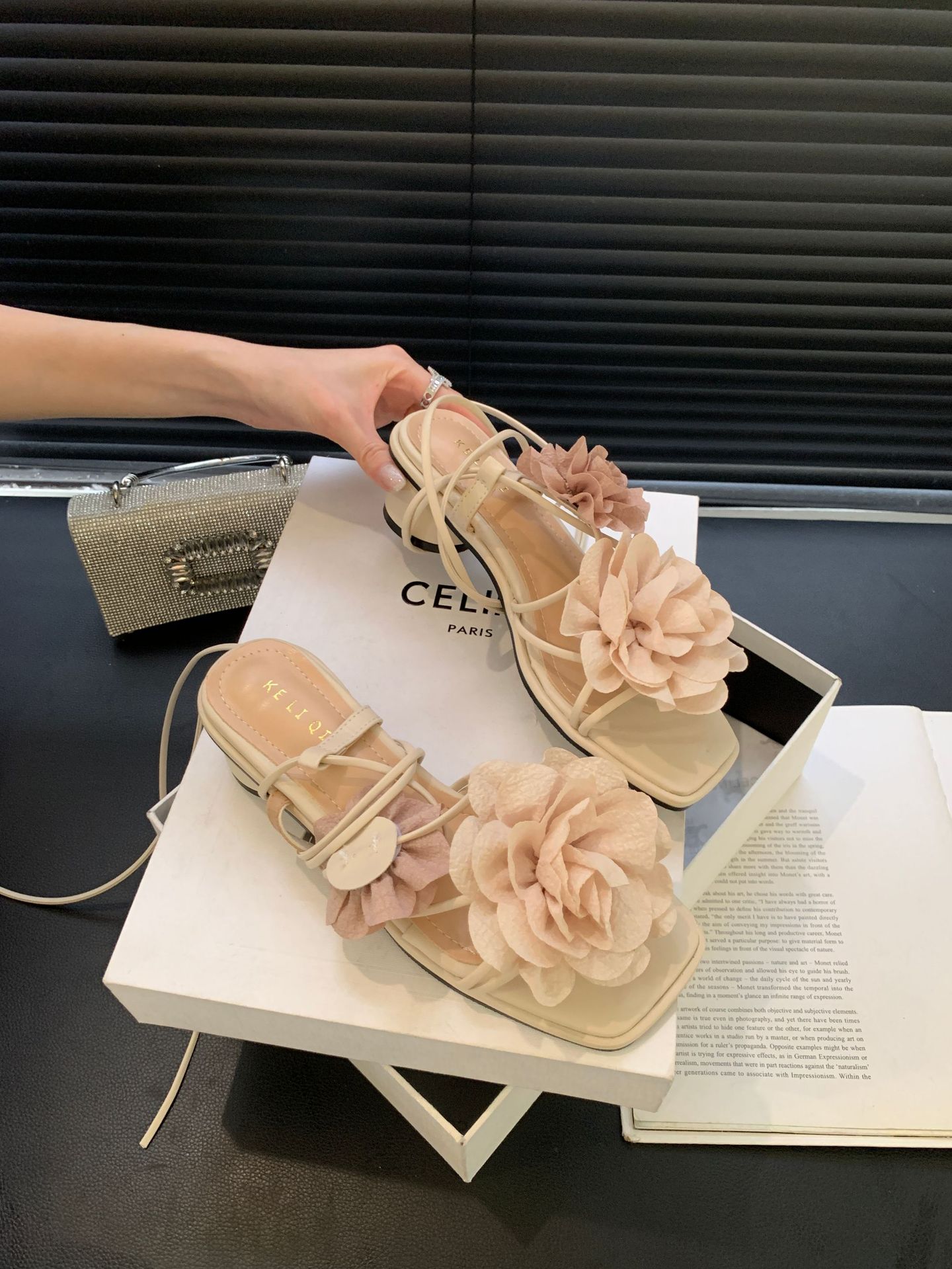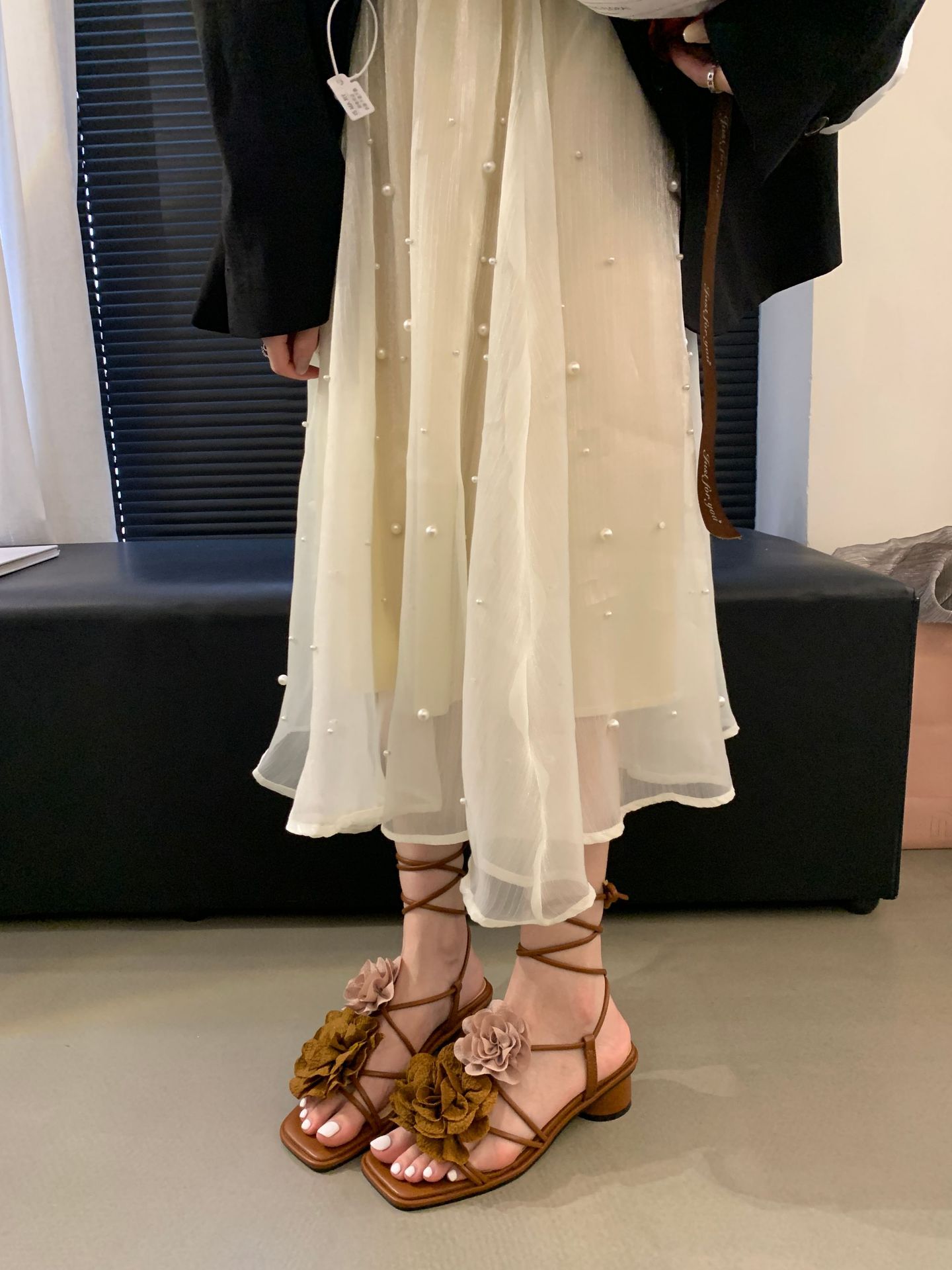 봄과 가을 2024 새로운 패션 청키 힐 프랑스 우아한 복고풍 꽃 크로스 스트랩 샌들 여성용 신발스토어 가기