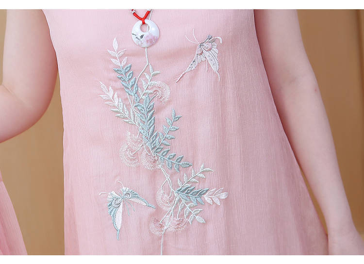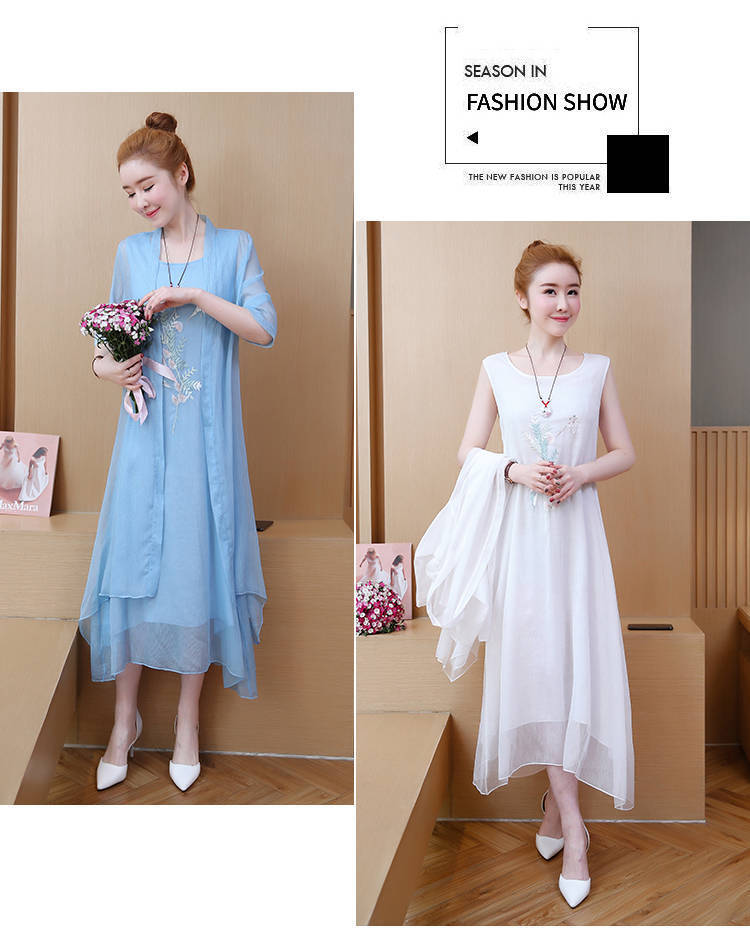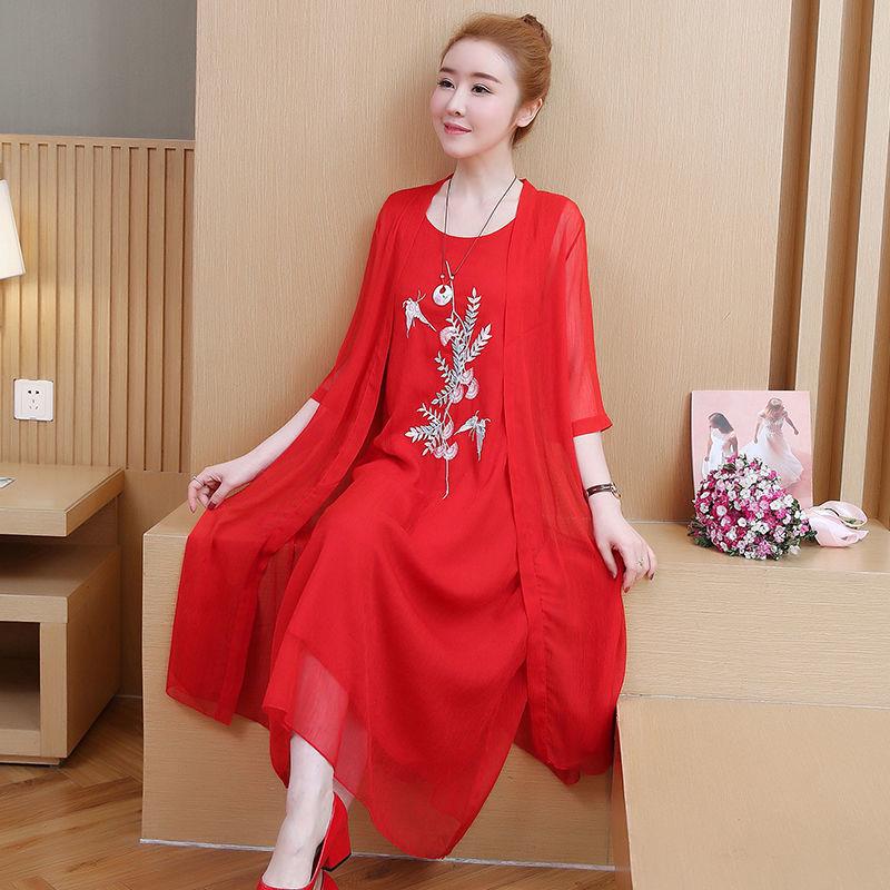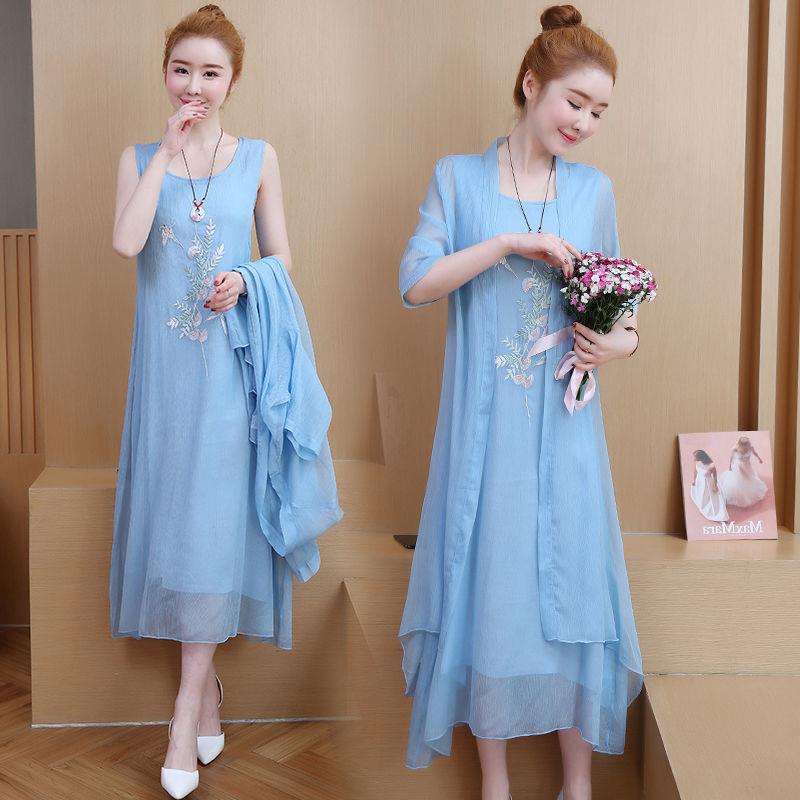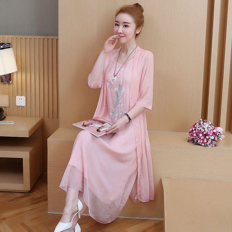 빈티지 자수 7 소매 2 피스 긴 원피스 쉬폰 원피스 2024 여름 새로운 민족 스타일 대형 여성 의류스토어 가기