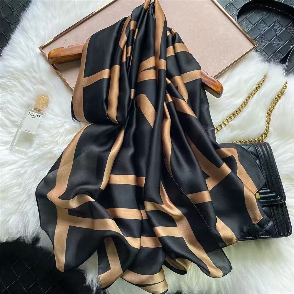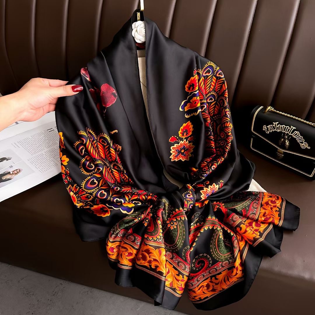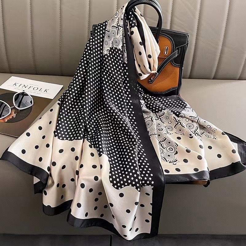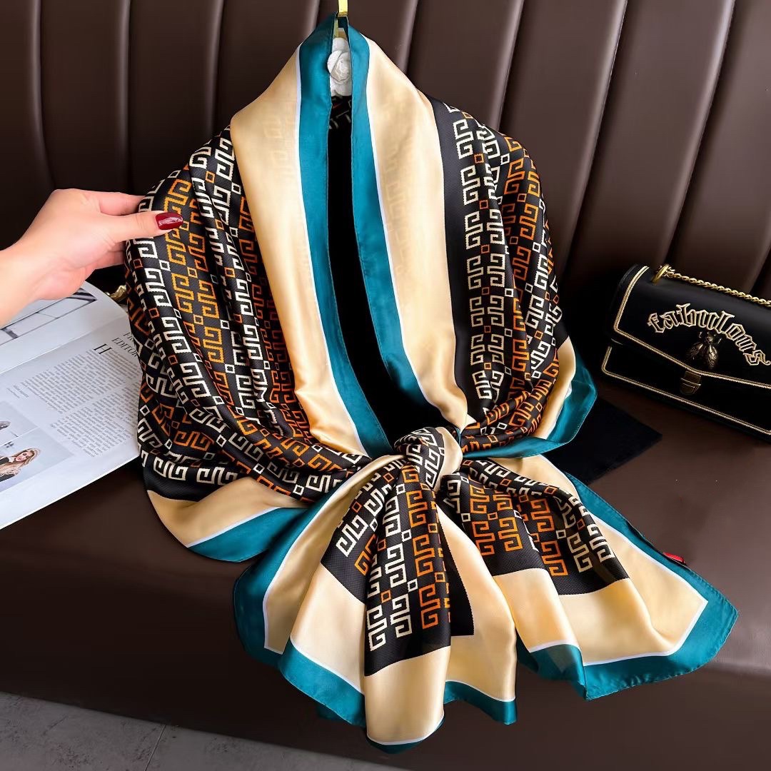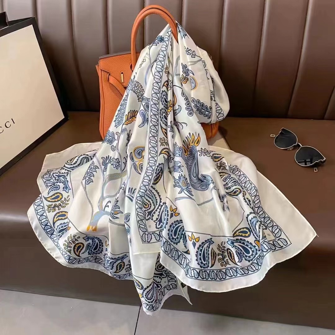 24 봄과 여름 새로운 인쇄 된 리 브로케이드 새틴 긴 스카프 여름 태양 보호 목도리 외국 스타일 해변 새로운 실크 새틴 스카프