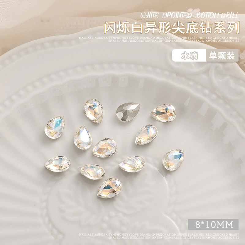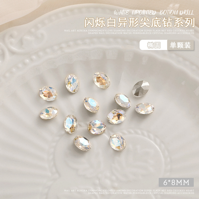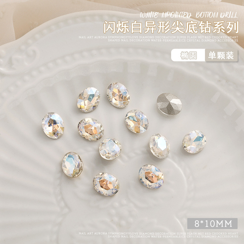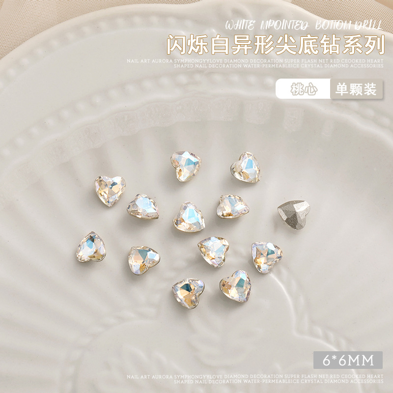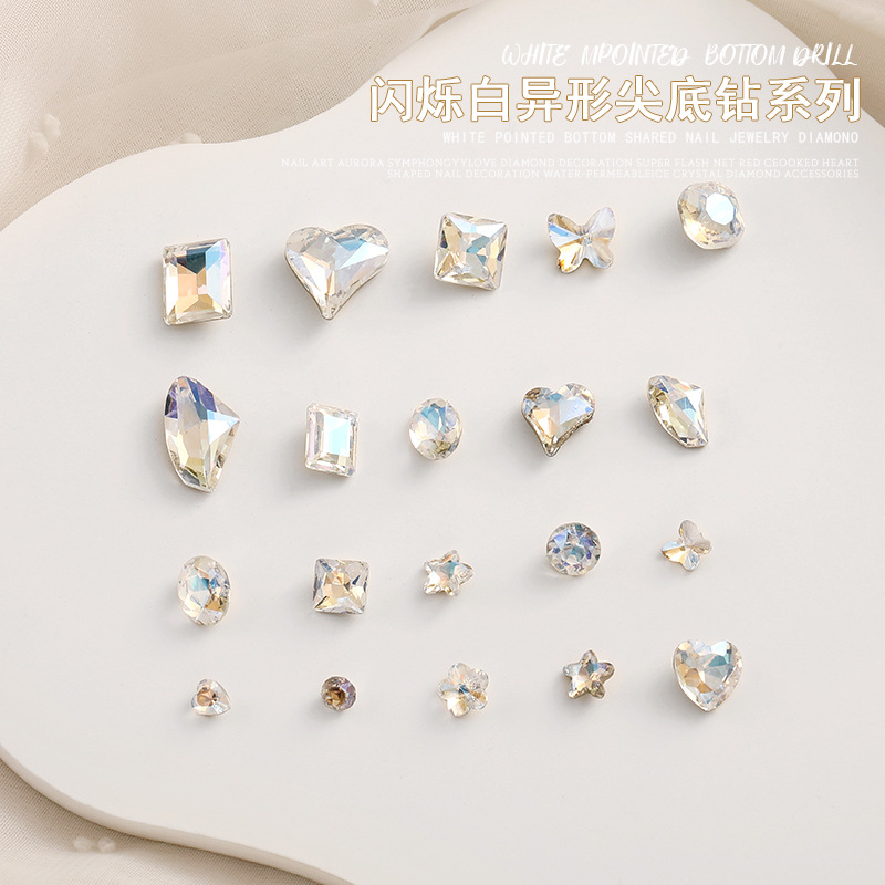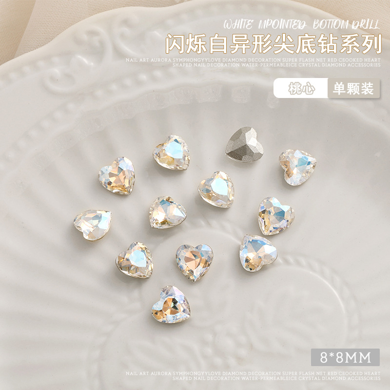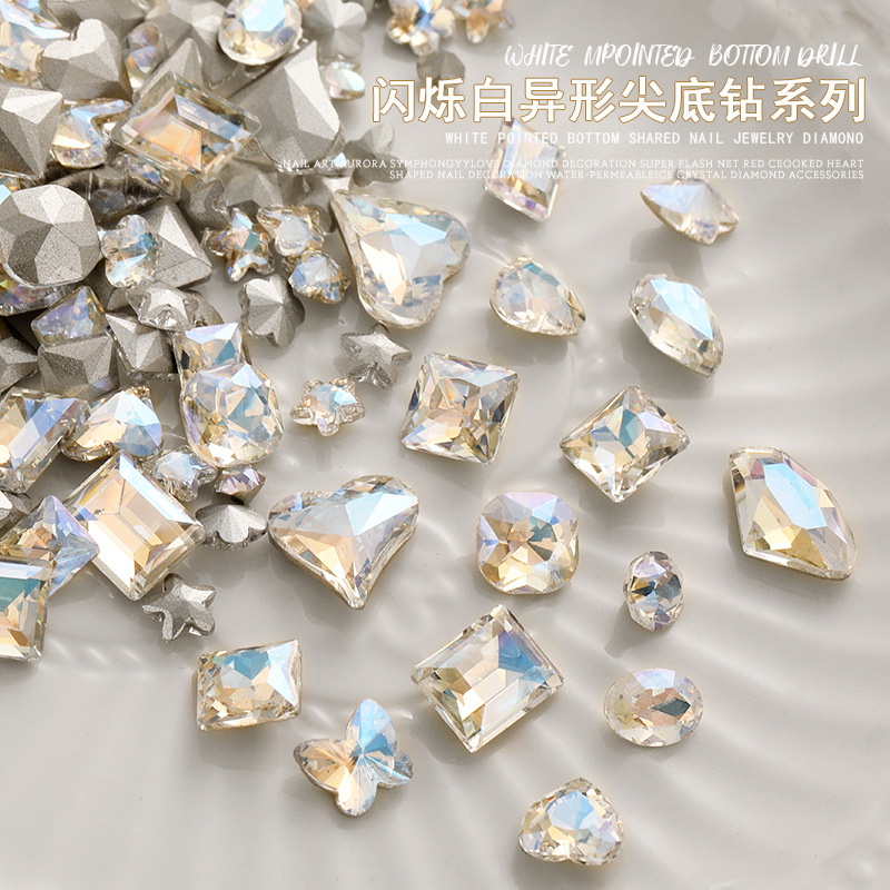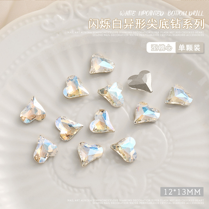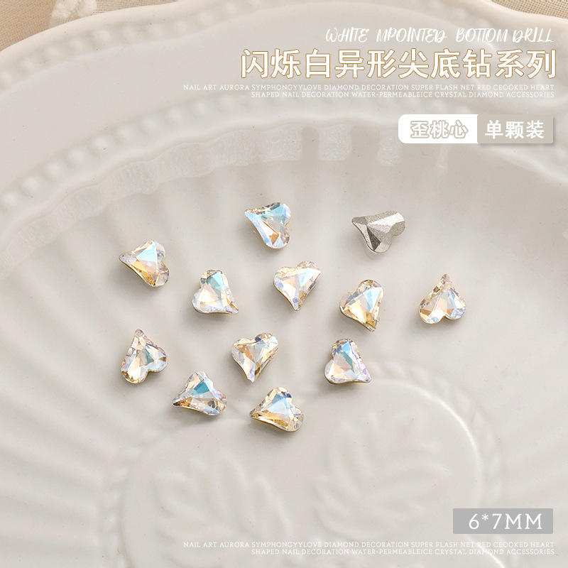 화이트 뾰족한 바닥의 초반짝이 특수 모양 네일 크리스탈 다이아몬드, 편심 하트 모양 라운드 다이아몬드, 네일 아트 장식품 도매, 반짝이는 다이아몬드스토어 가기
