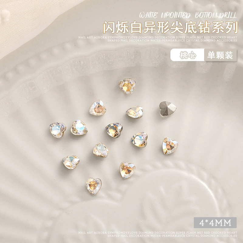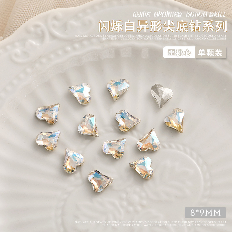 화이트 뾰족한 바닥의 초반짝이 특수 모양 네일 크리스탈 다이아몬드, 편심 하트 모양 라운드 다이아몬드, 네일 아트 장식품 도매, 반짝이는 다이아몬드