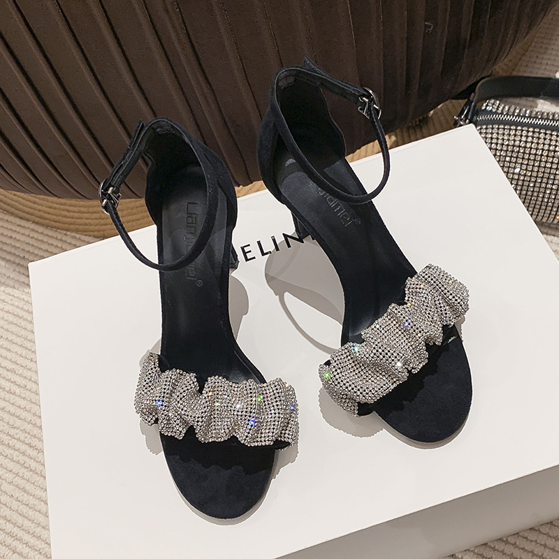 봄 2024 새로운 스타일 화이트 샌들 여성용 하이힐 디자인 블랙 라인스톤 샌들 여성스토어 가기