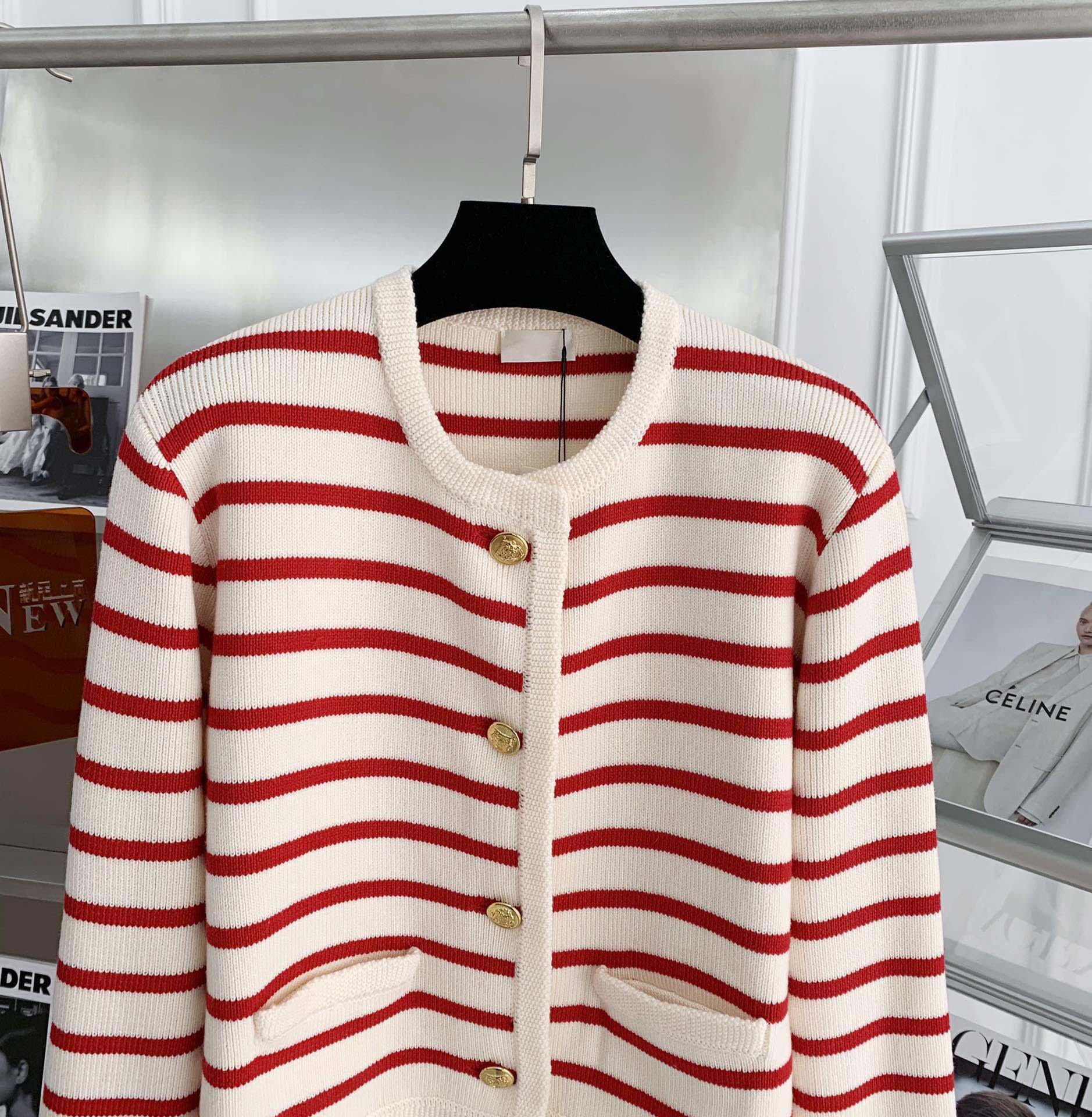 여자 가을 프랑스 느슨한 짧은 외부 스웨터 재킷 골드 버클 컬러 스트라이프 크루 넥과 샤넬 스타일 니트 카디건