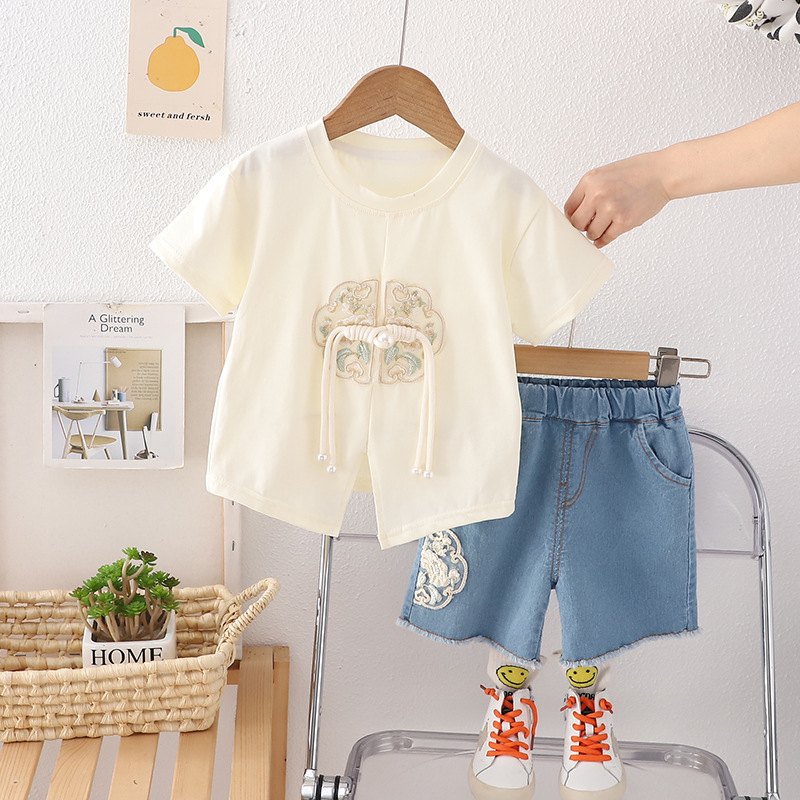 여름 소녀 반팔 세트 여름 새 스타일 Guofeng 아기의 진주 버클 라운드 반팔 세트