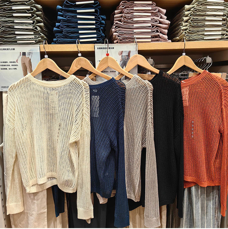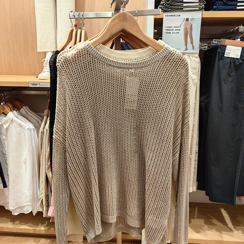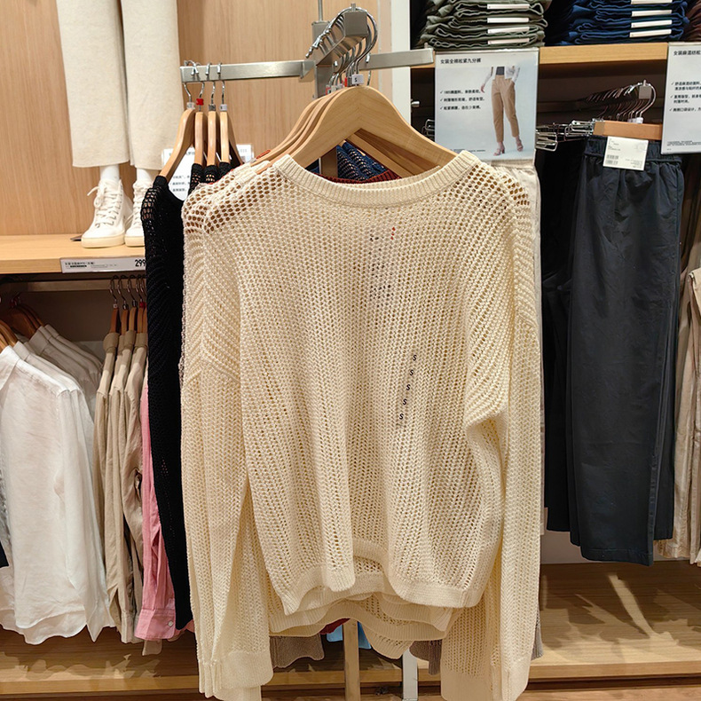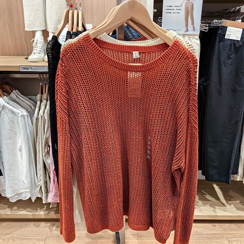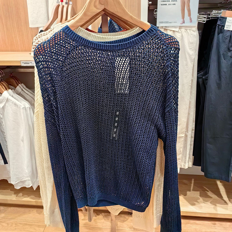 봄과 여름 2024 새로운 여성 메쉬 할로우 니트웨어 느슨한 크루 넥 긴 소매 탑 풀오버 S468788