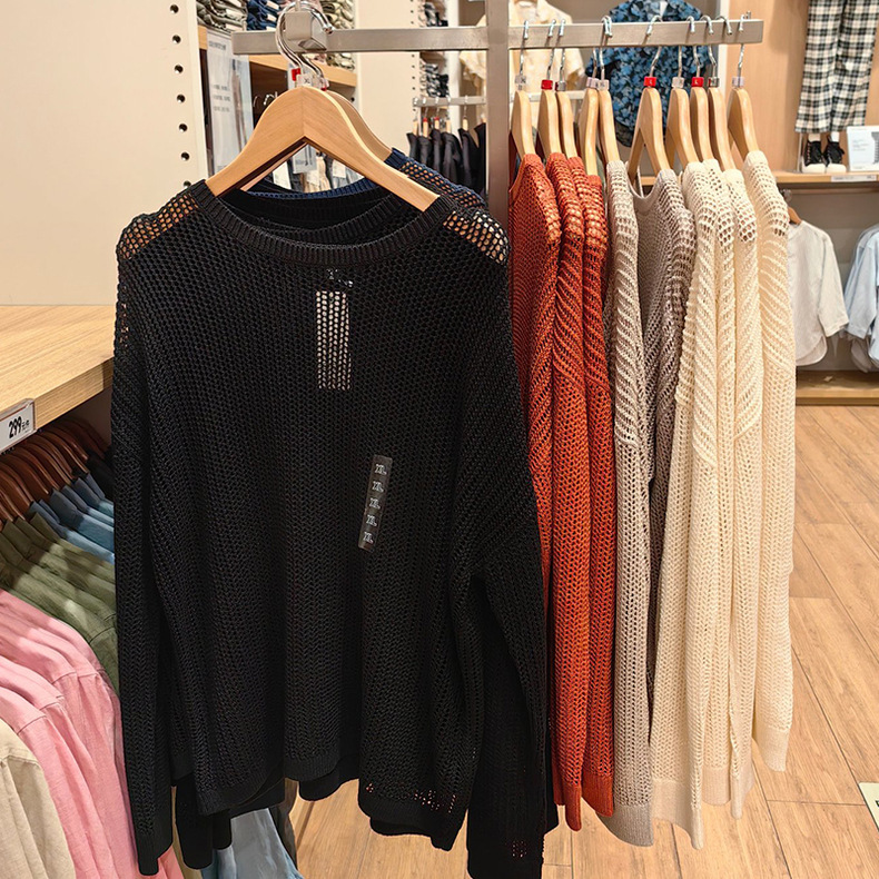 봄과 여름 2024 새로운 여성 메쉬 할로우 니트웨어 느슨한 크루 넥 긴 소매 탑 풀오버 S468788스토어 가기