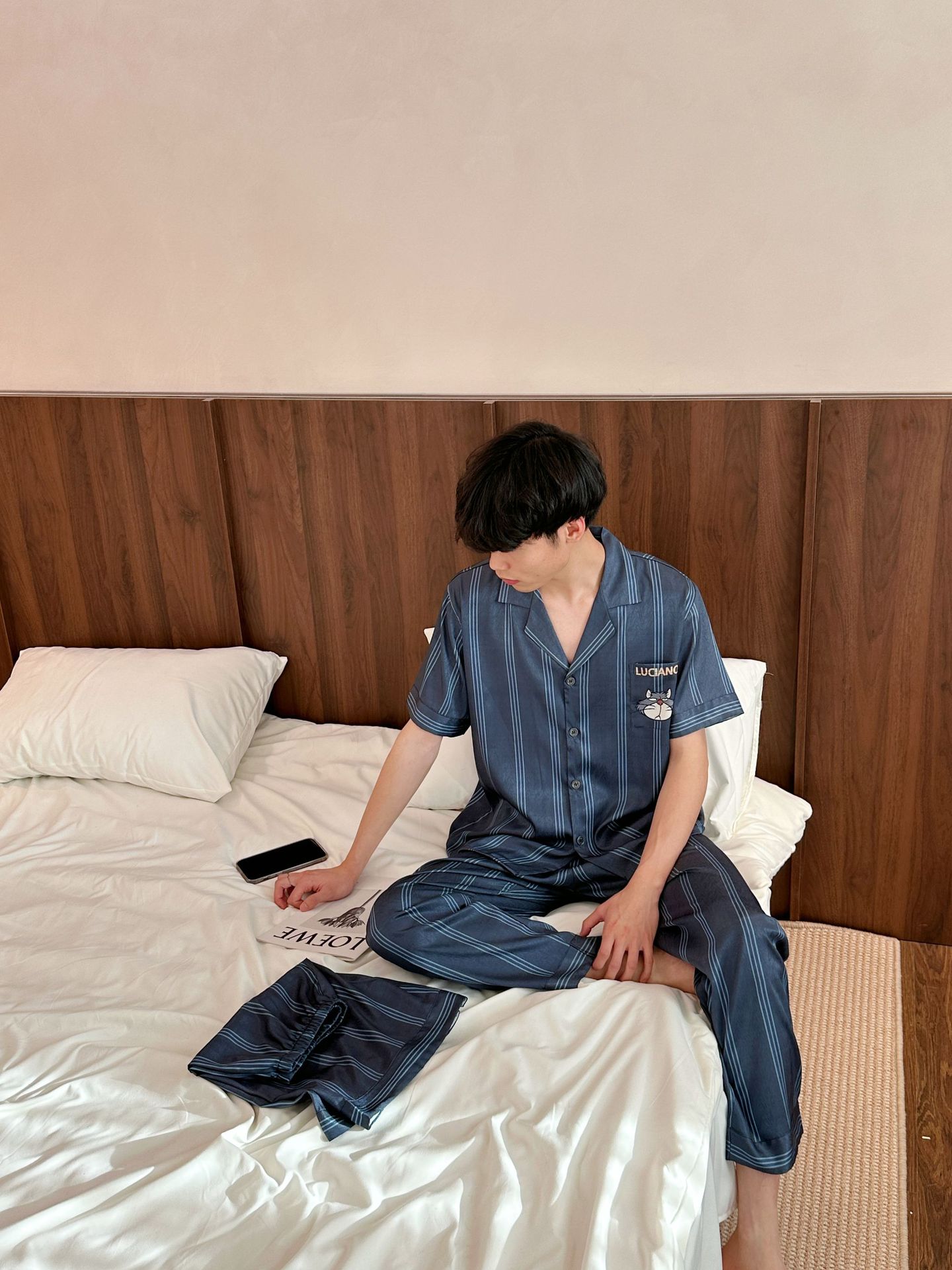 Yase [Yuanzai Cat] 커플 만화 프린트 새 남성 및 여성 소매 바지 3피스 가정복 세트