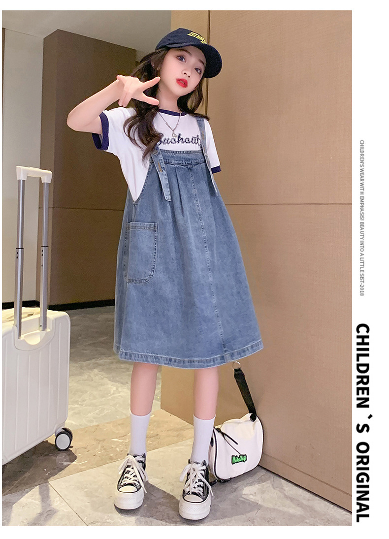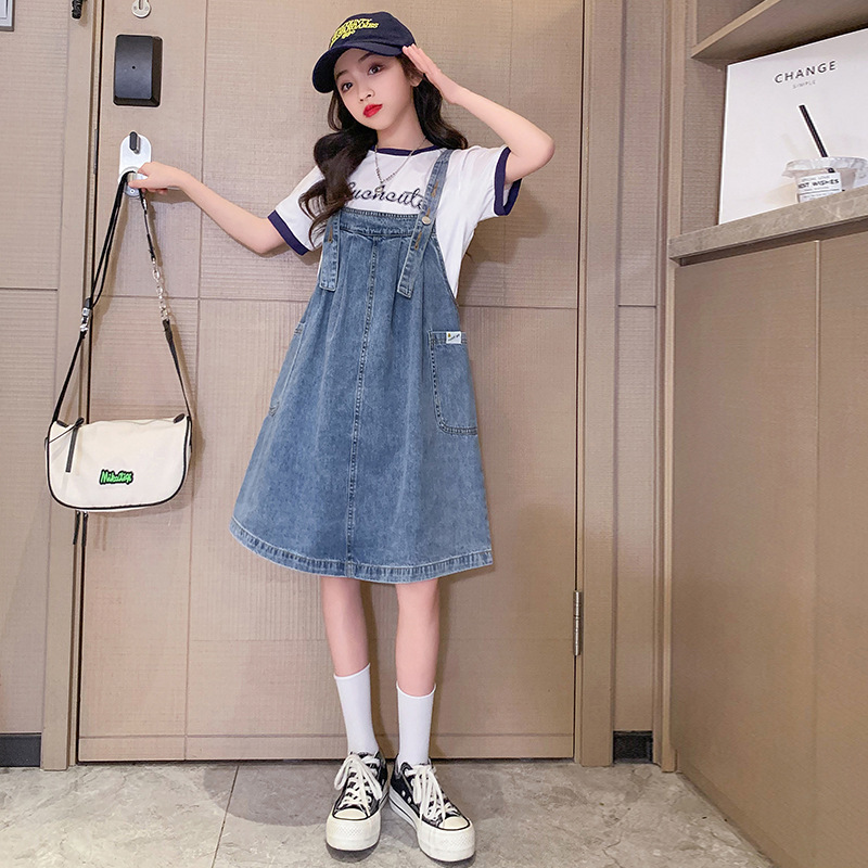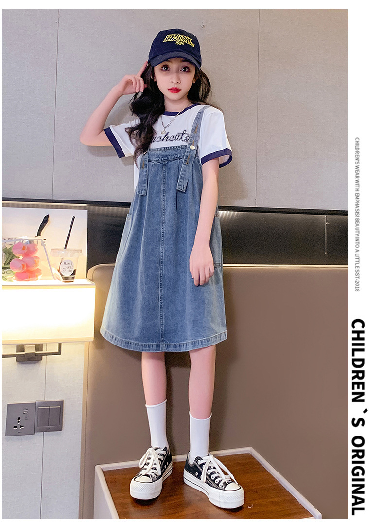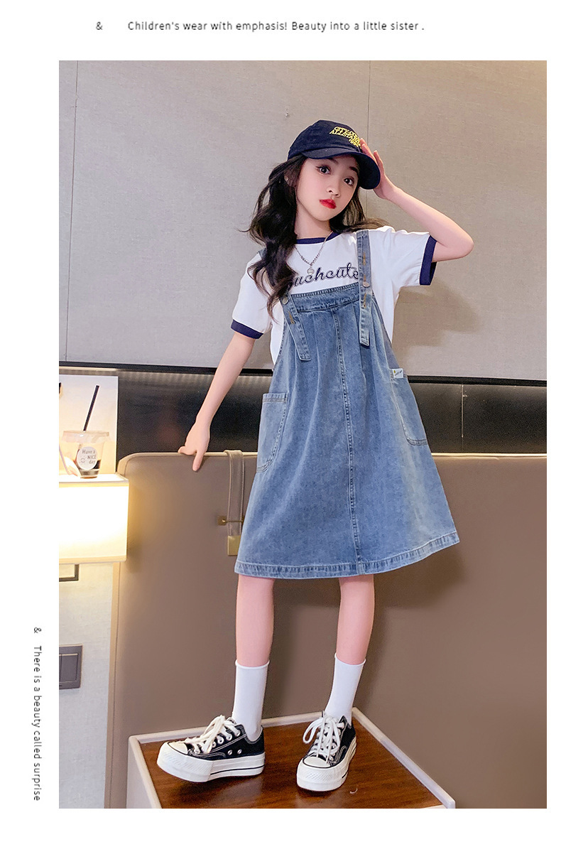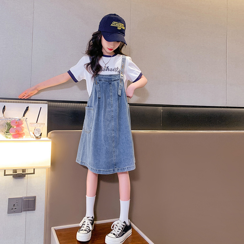 소녀 원피스 여름 세트 2024 새로운 스타일 어린이 여름 데님 큰 어린이를위한 트렌디 한 원피스 원피스스토어 가기