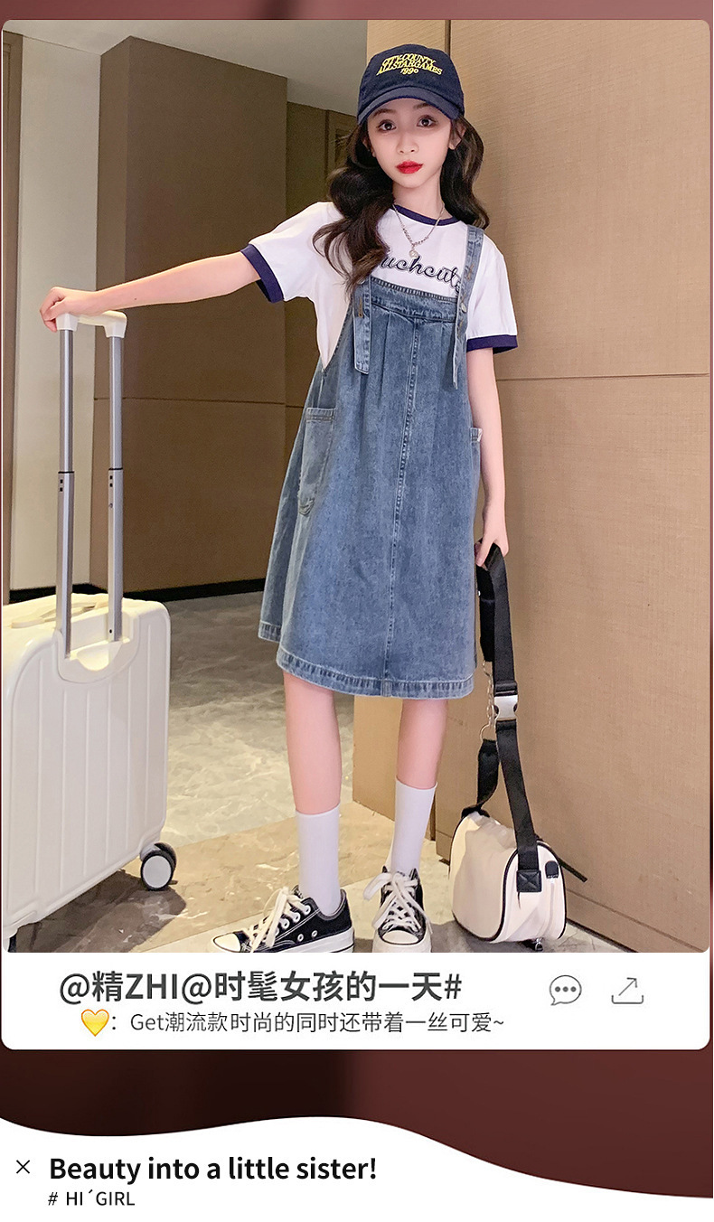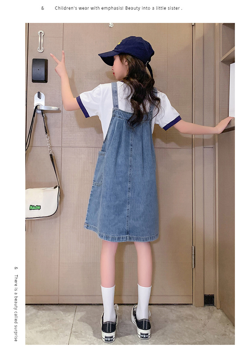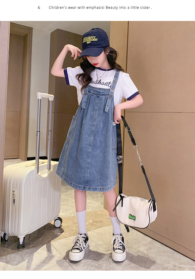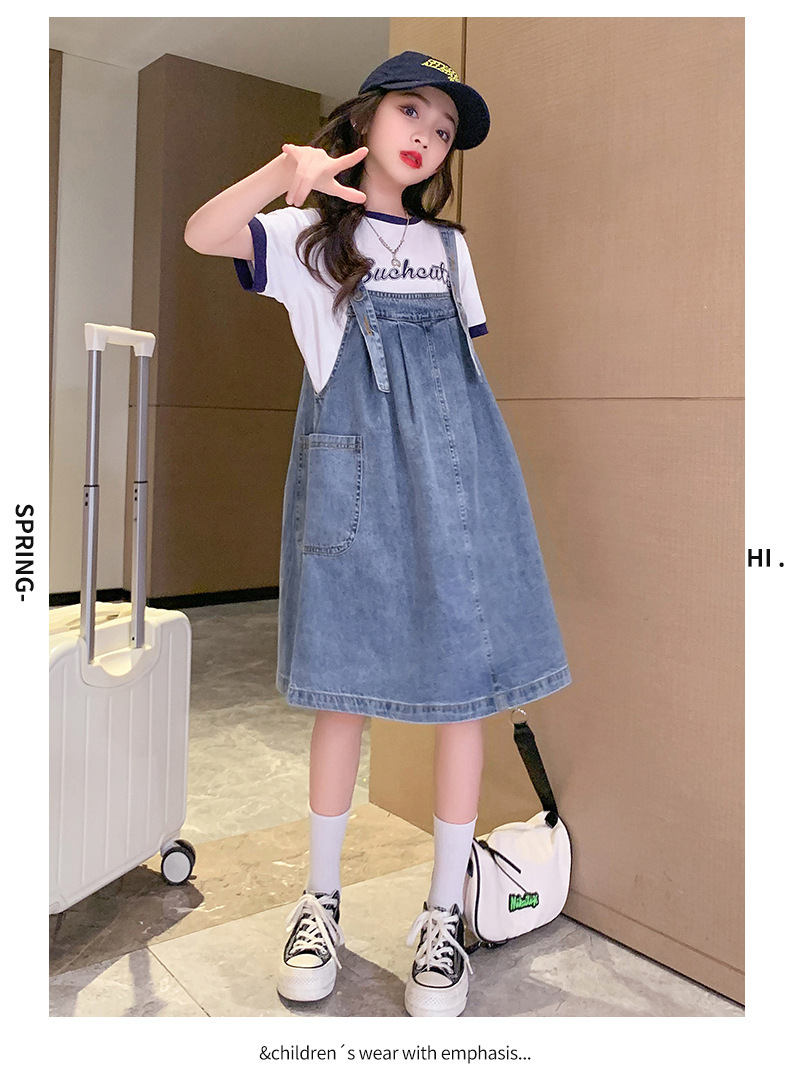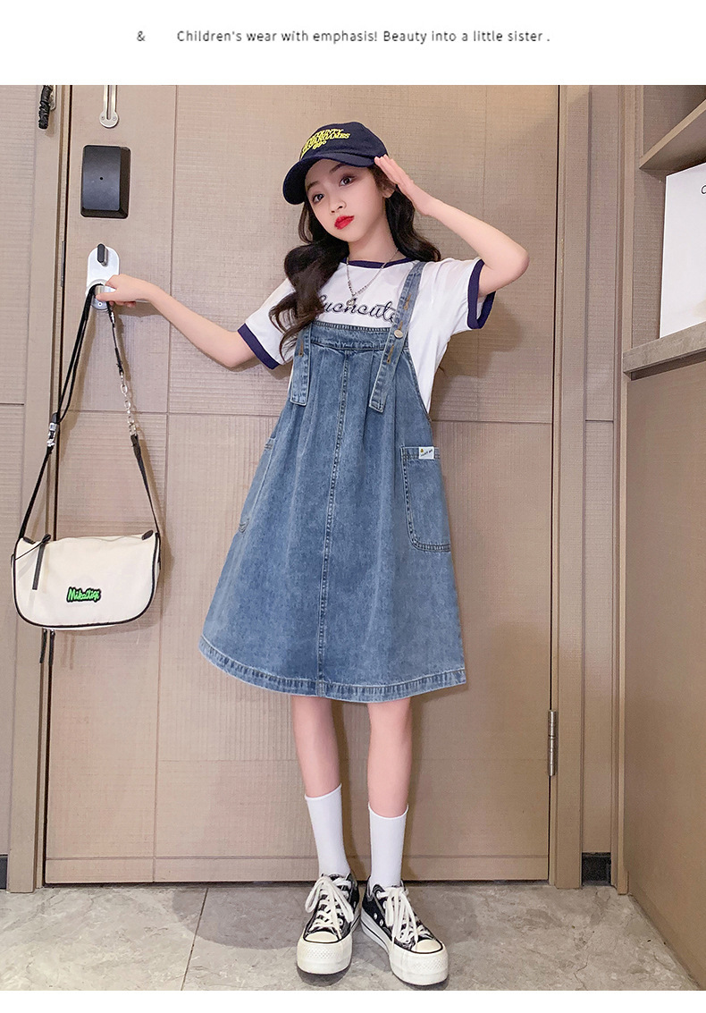 소녀 원피스 여름 세트 2024 새로운 스타일 어린이 여름 데님 큰 어린이를위한 트렌디 한 원피스 원피스스토어 가기