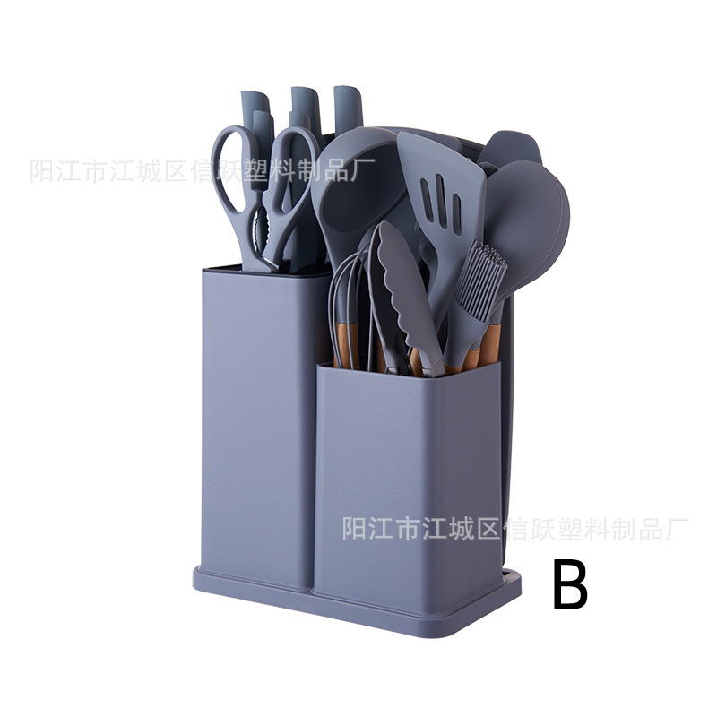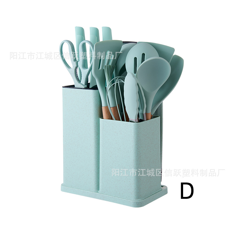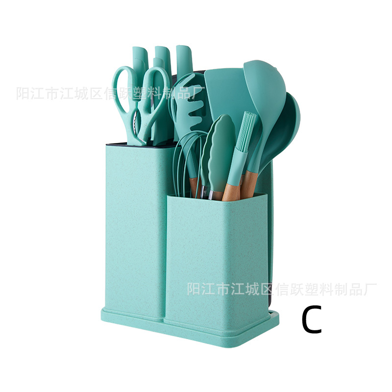 뜨거운 국경 나무 손잡이 실리콘 주방 용품 세트 칼 세트 19 조각 주방 요리 삽과 숟가락 컬러 칼 홀더 조합