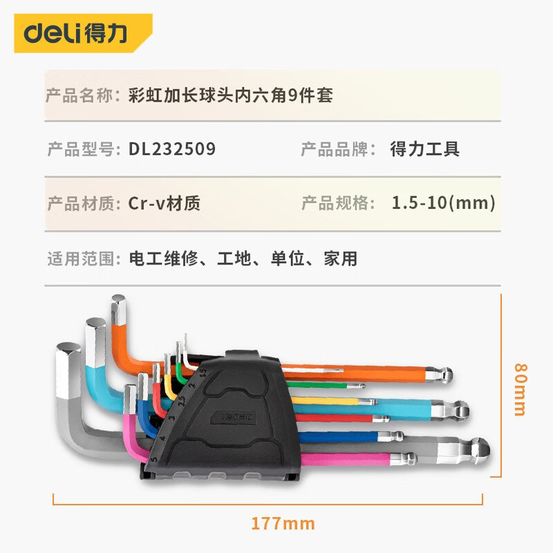 델리 컬러 연장 앨런 렌치 볼 헤드 9 피스 세트 1.5-10mm 앨런 세트 DL232509