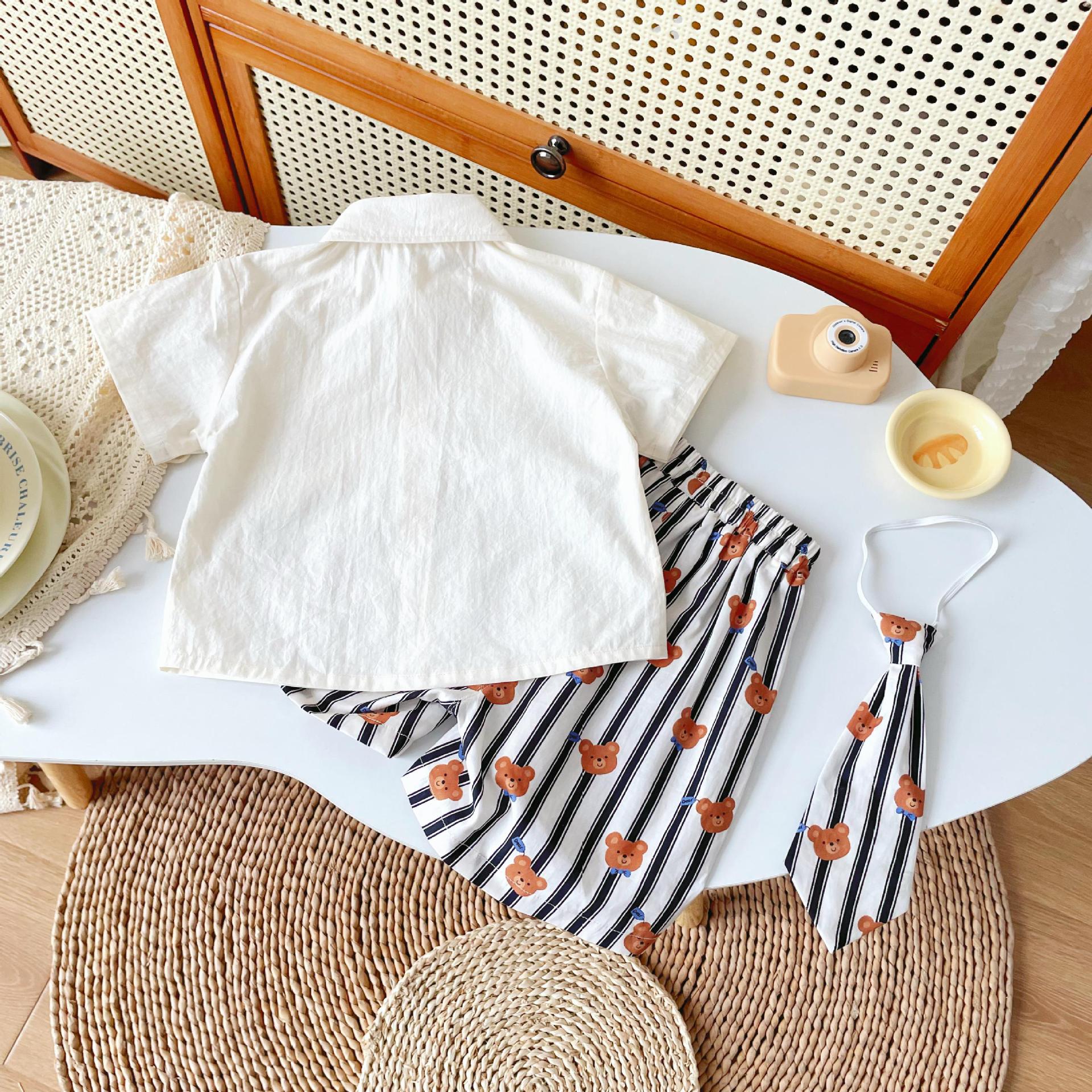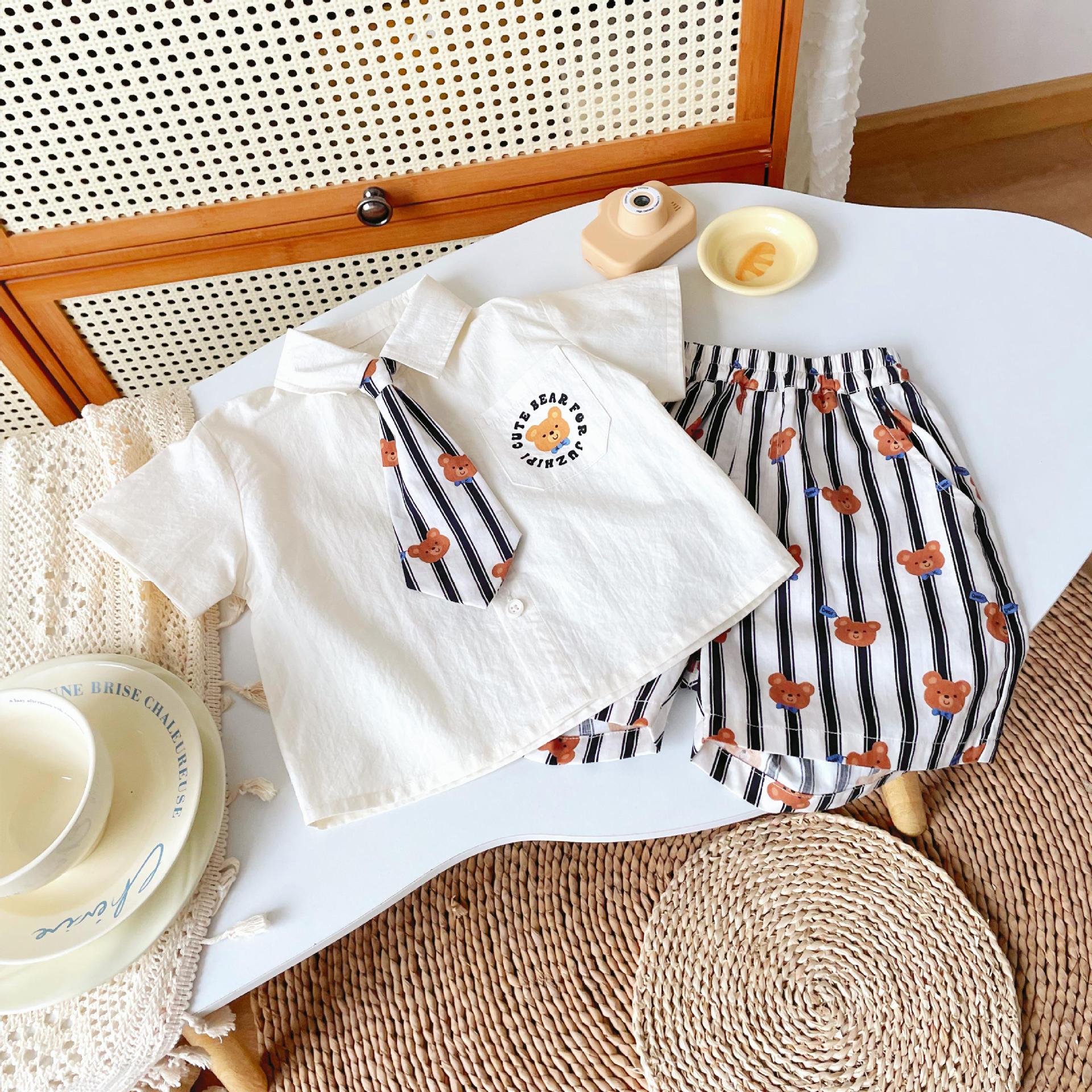 [칼리지 베어] XT245351 오렌지 가죽 2024 여름 남자 어린이 한국 아카데미 스타일 셔츠 반바지 세트
