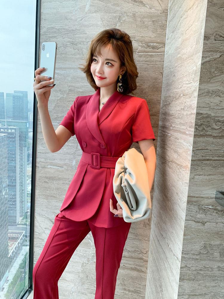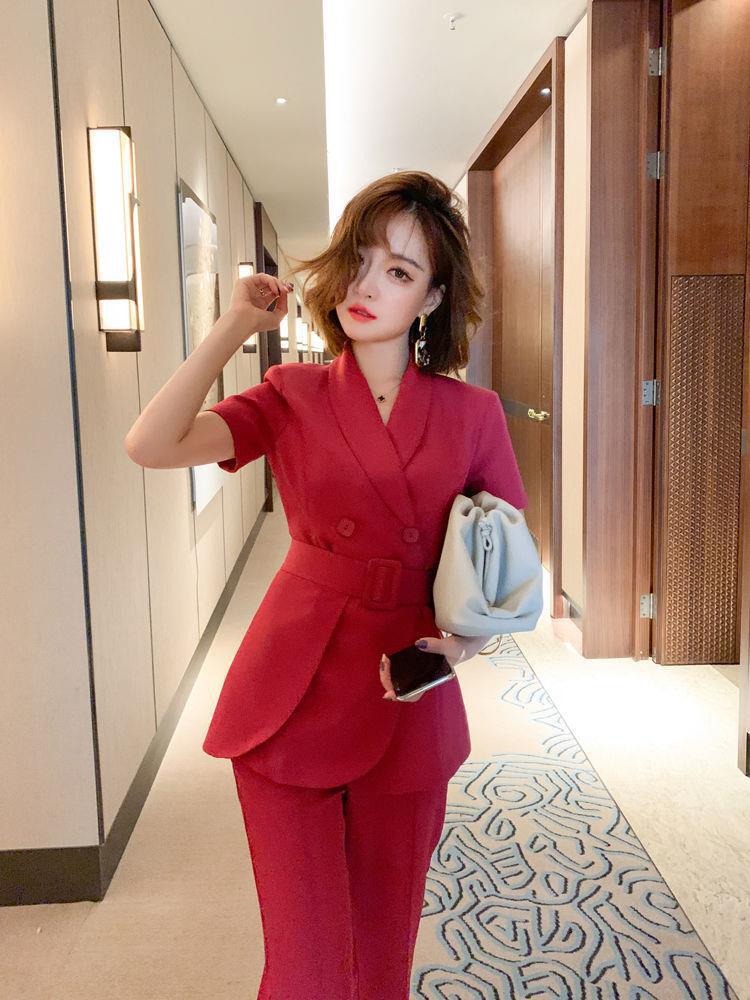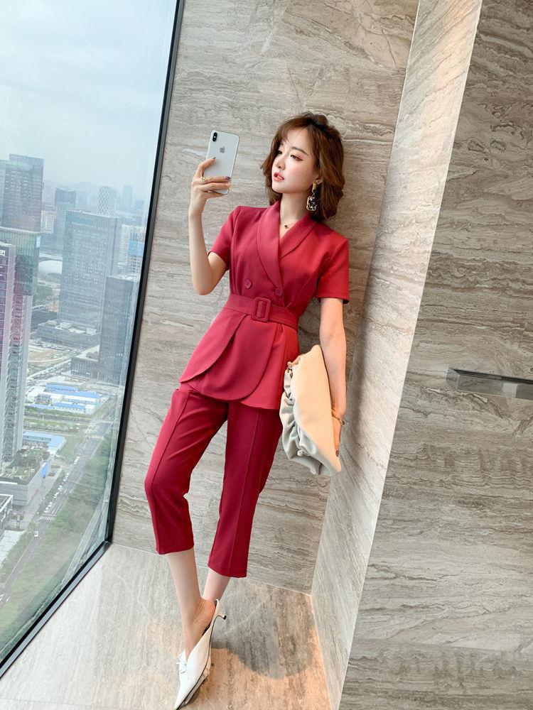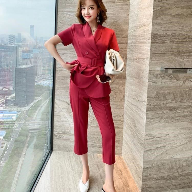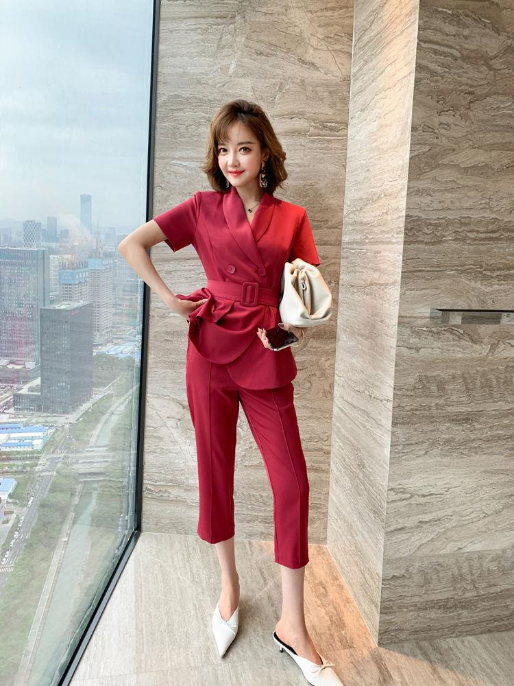 우아한 사교계 비즈니스 착용 2024 여름 새로운 OL 반팔 허리 작은 세트 카프리 바지 세트 여성 의류스토어 가기