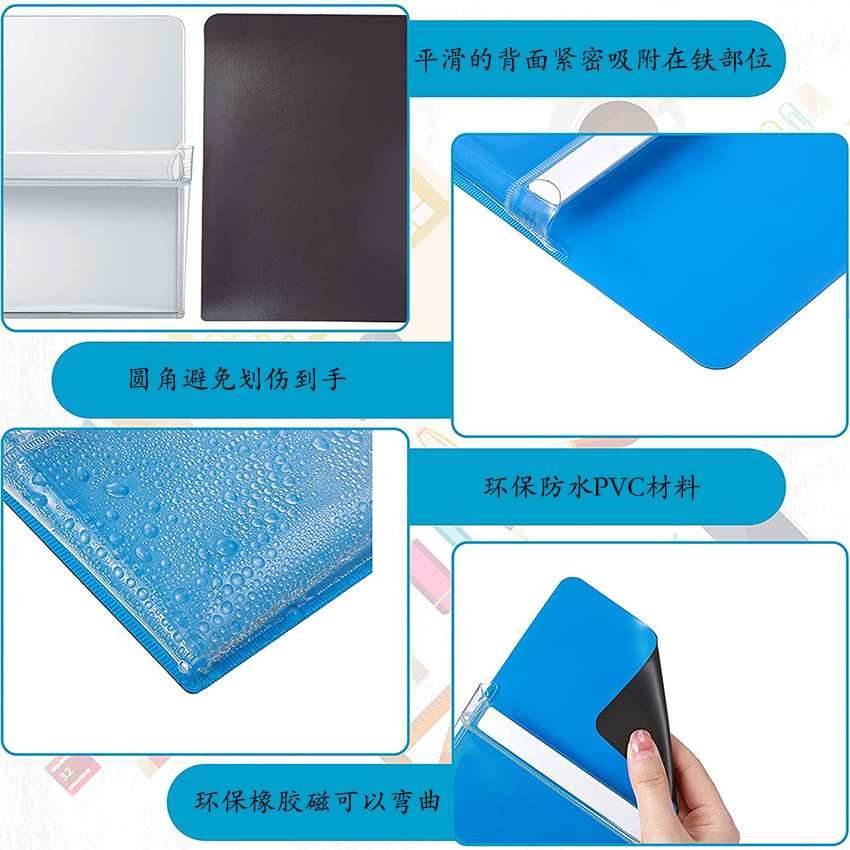 此产品磁性文件袋大小24*30.5厘米,红橙黄绿蓝紫为竖版。软磁厚度0.6毫米,透明PVC厚度为30丝,软磁厚度和透明PVC厚度都可以定制。包装一般采用带个OPP袋包装,里面填塞珍珠棉定型,客人亦可以定制包装方式。