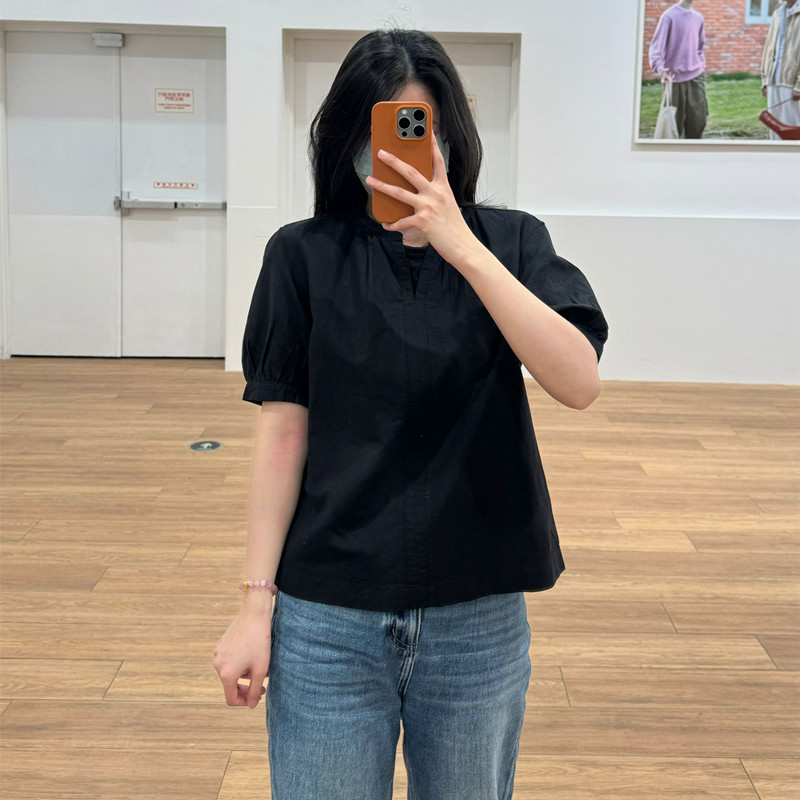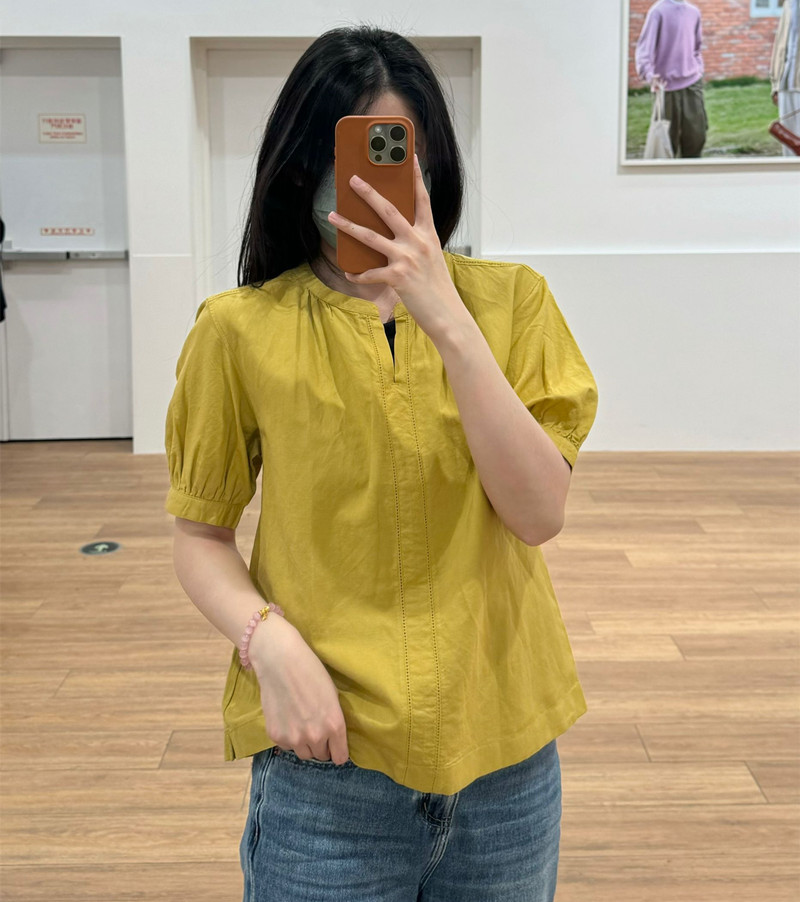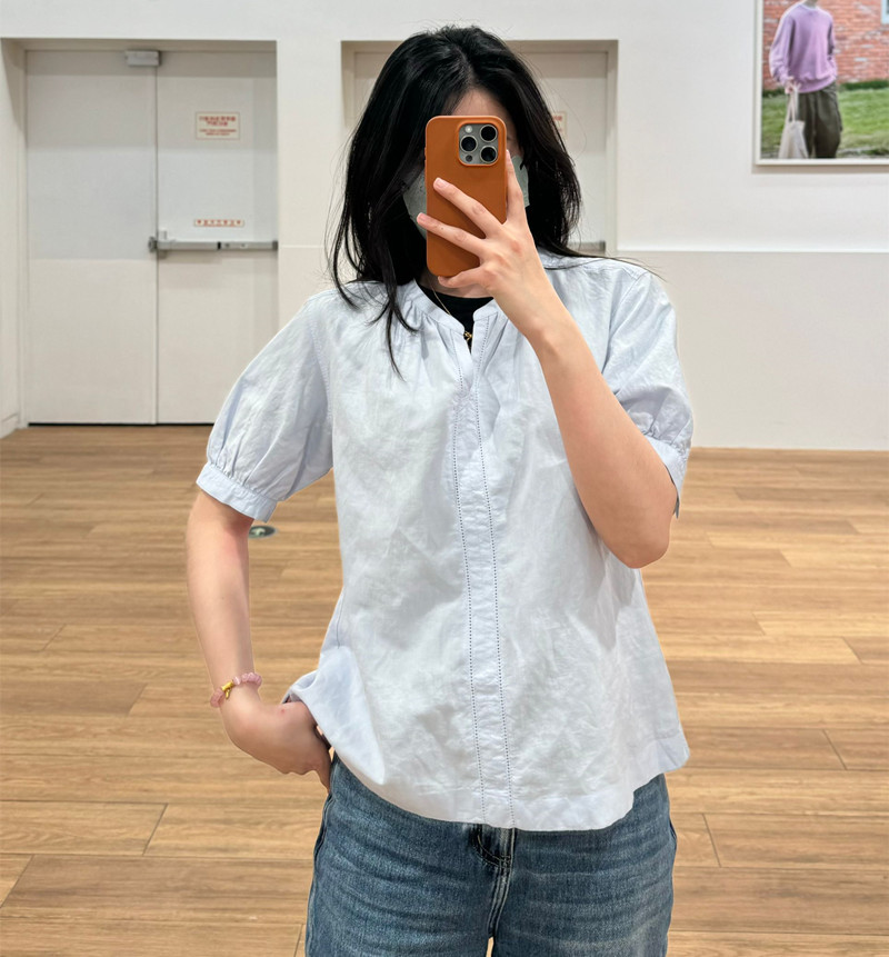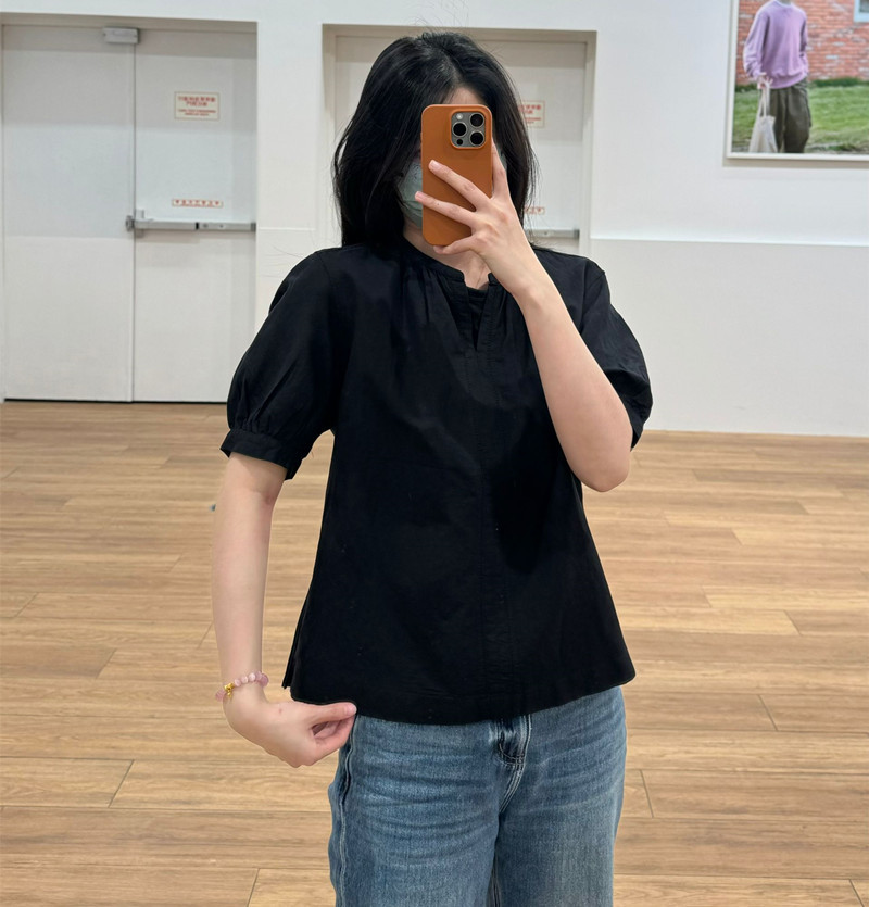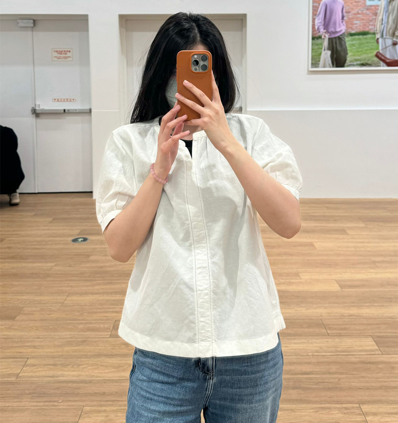일본 싱글 24 봄과 여름 새로운 여성 린넨 혼합 느슨한 셔츠 짧은 소매 버블 소매 스위트 탑 캐주얼 466432