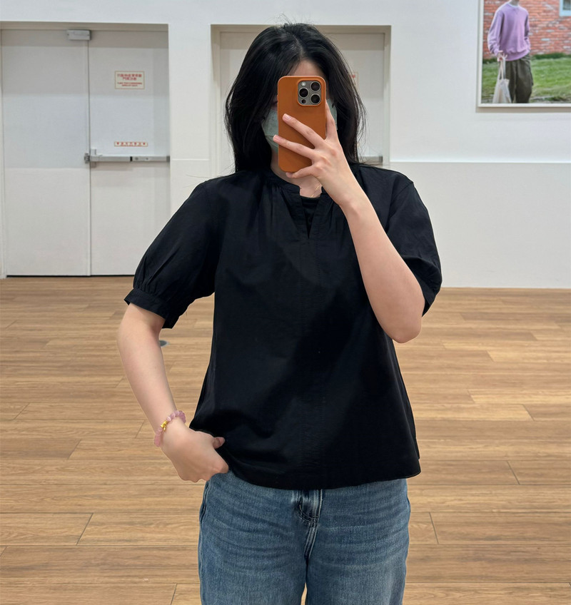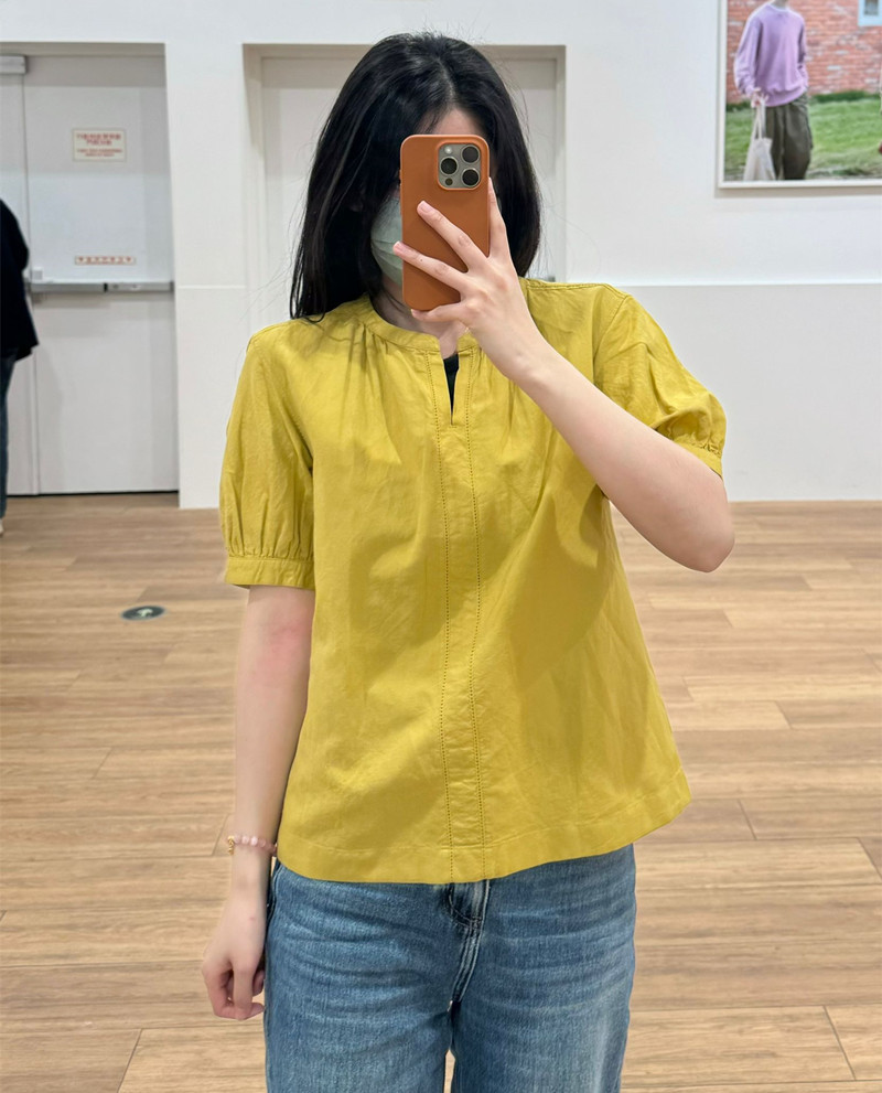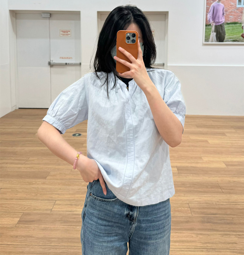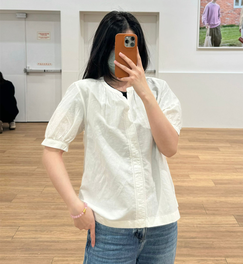 일본 싱글 24 봄과 여름 새로운 여성 린넨 혼합 느슨한 셔츠 짧은 소매 버블 소매 스위트 탑 캐주얼 466432