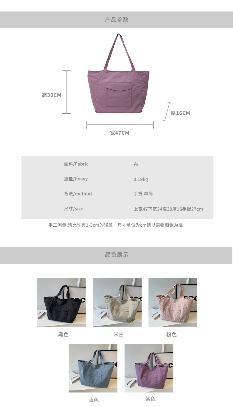 대용량 캐주얼 지퍼 가방 새로운 스타일 경량 어깨 헝겊 가방 캐주얼 패션 학생 클래스 토트 백