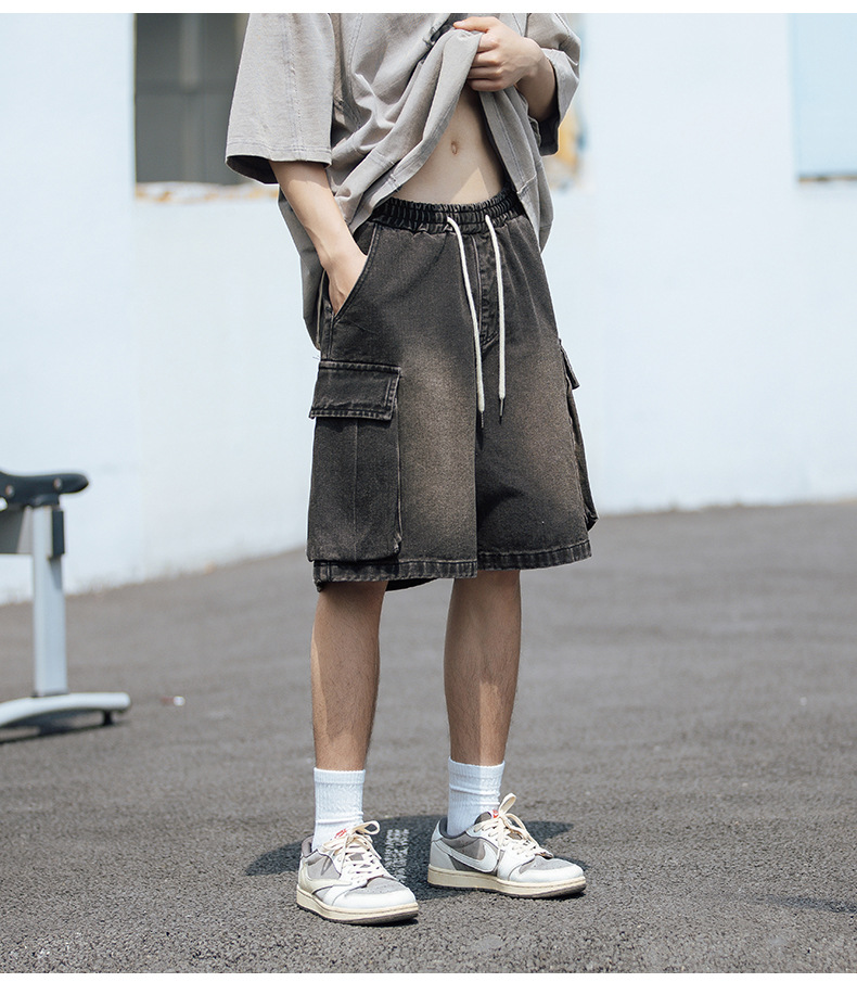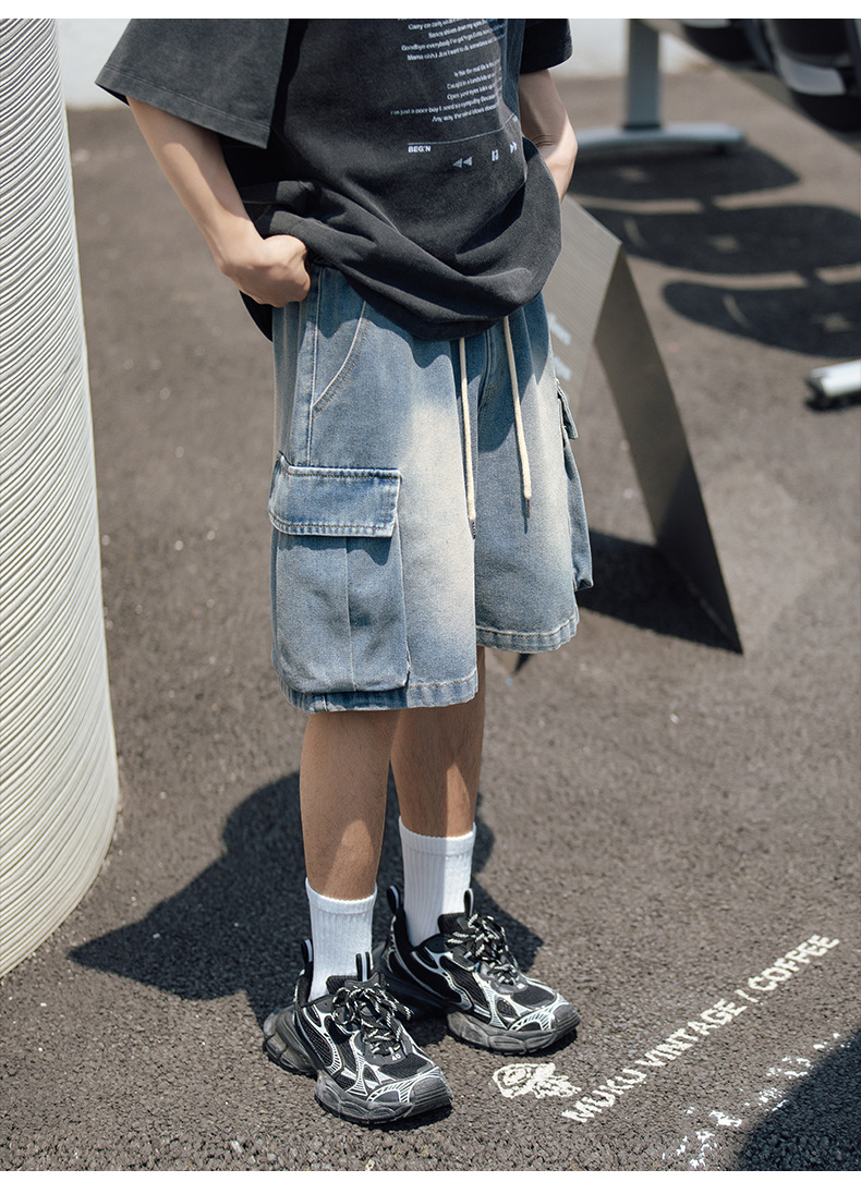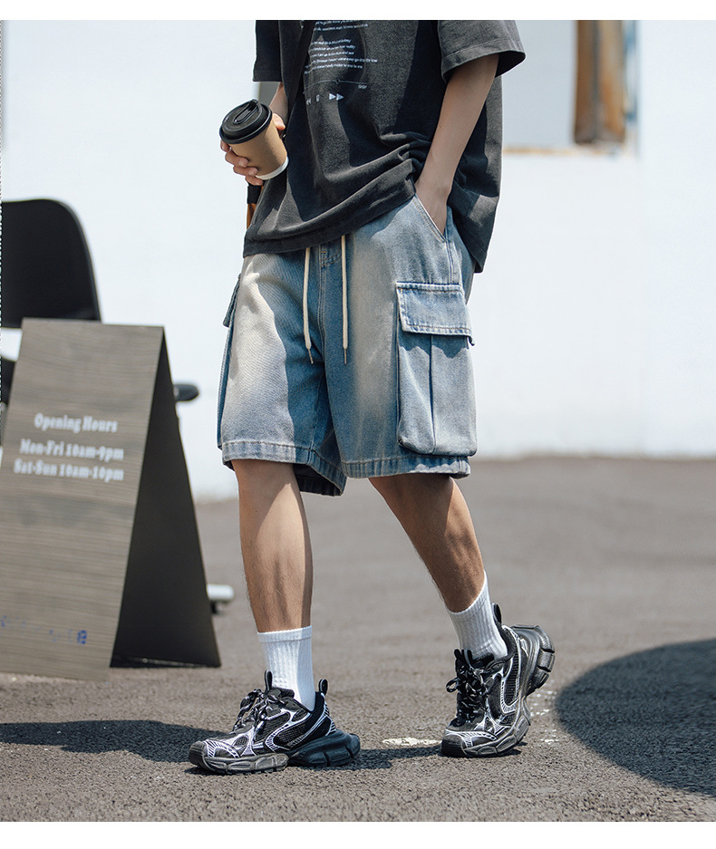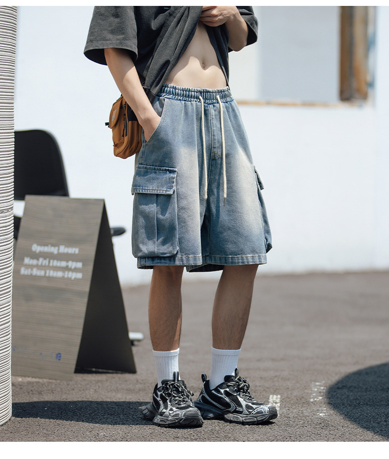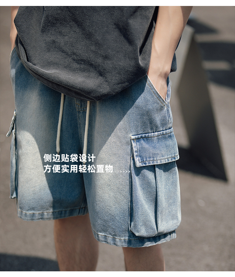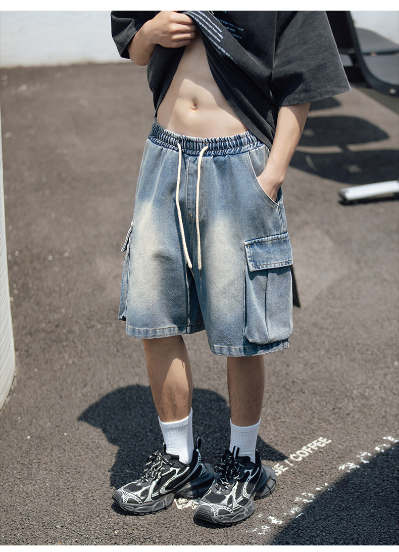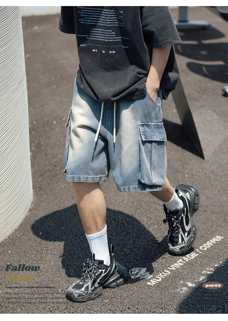 하이 스트리트 오래 된 사이드 포켓 디자인 데님 반바지 남자 여름 일본 캐주얼 느슨한 끈 바지스토어 가기